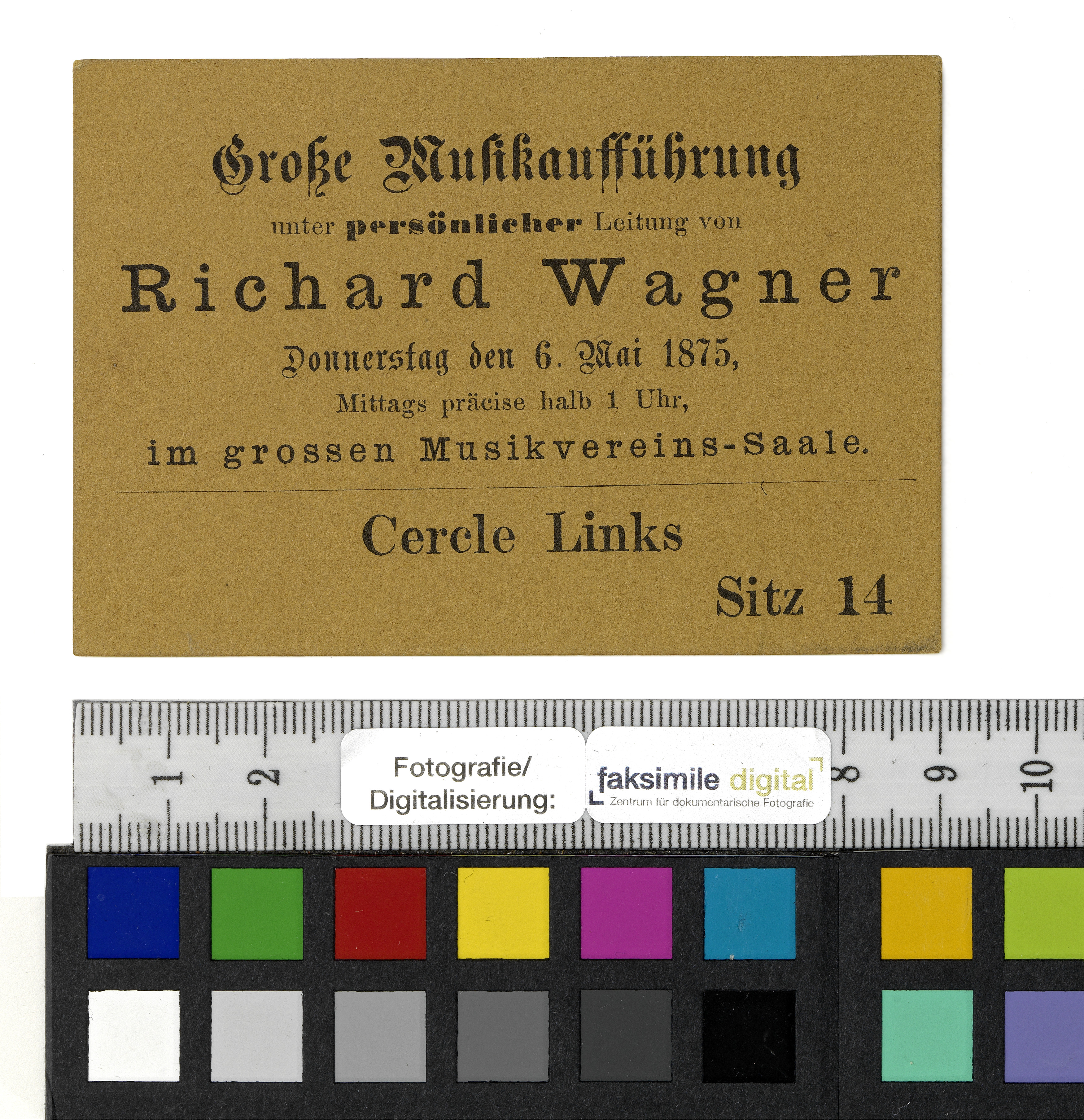 Eintrittskarte für eine "Große Musikaufführung unter persönlicher Leitung von Richard Wagner" im großen Musikvereins-Saal am 6. Mai 1875