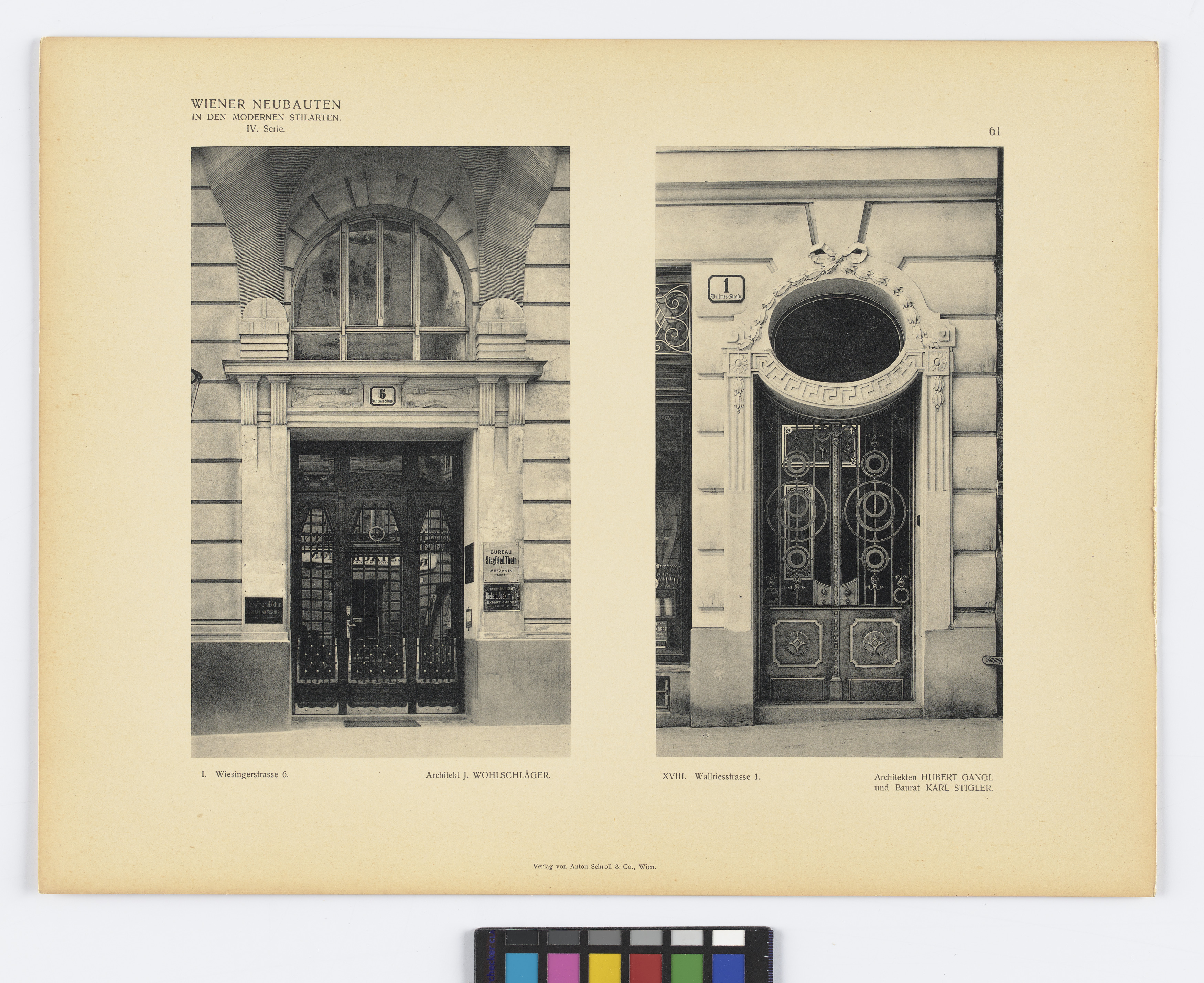 1., Wiesingerstraße 6, Architekt J. Wohlschläger, 18., Wallrißstraße 1, Architekt Hubert Gangl und Baurat Karl Stigler (Blatt Nr. 61 aus: Wiener Neubauten im Style der Seccession und anderen modernen Stylarten. Vierte Serie. Facaden Details Hausthore Vestibule, Wien 1908)