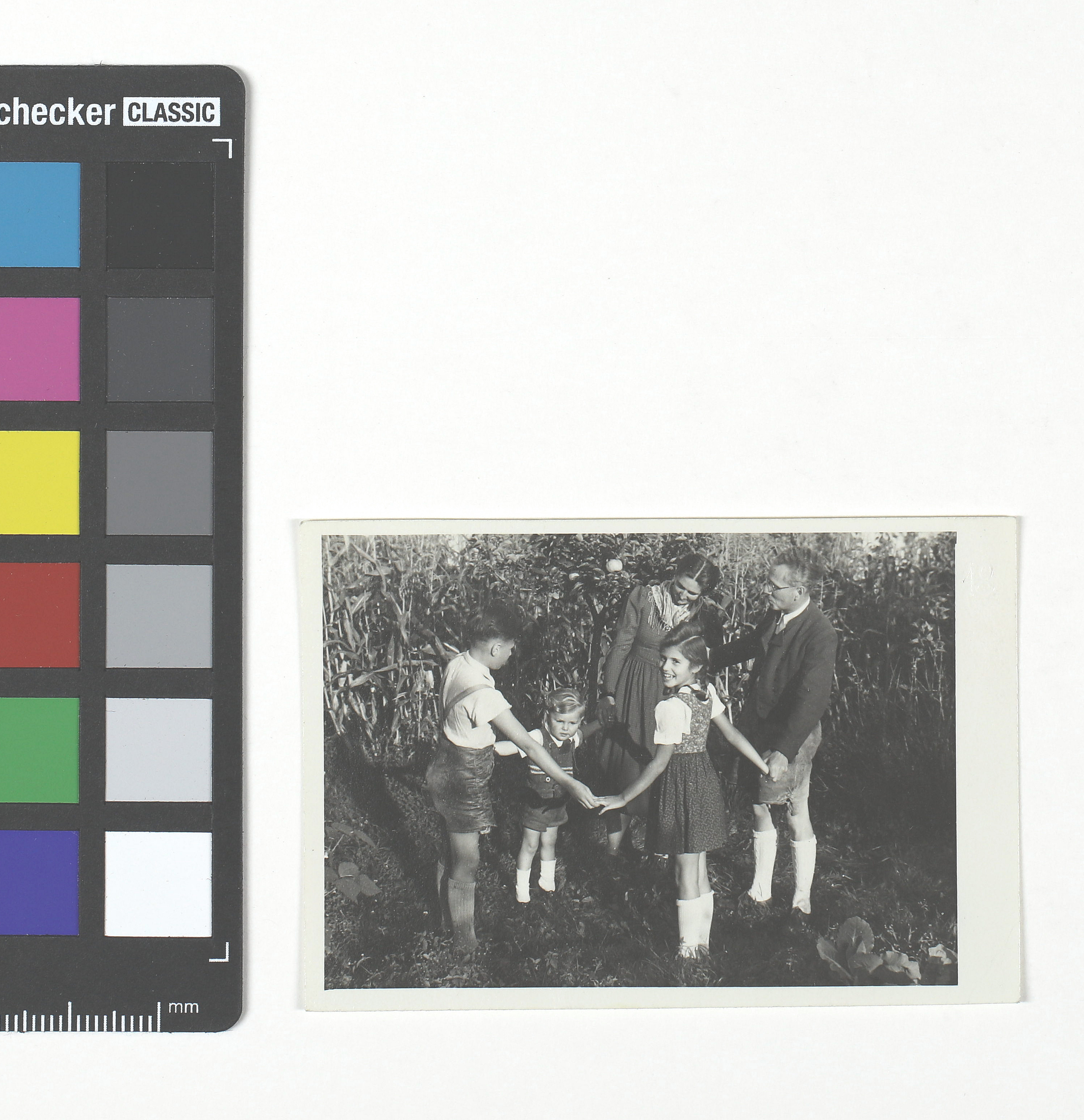Egon Geier (1904–1976), Schriftsteller und Lehrer, mit Familie im Grünen (rückseitig eigenhändige Widmung)
