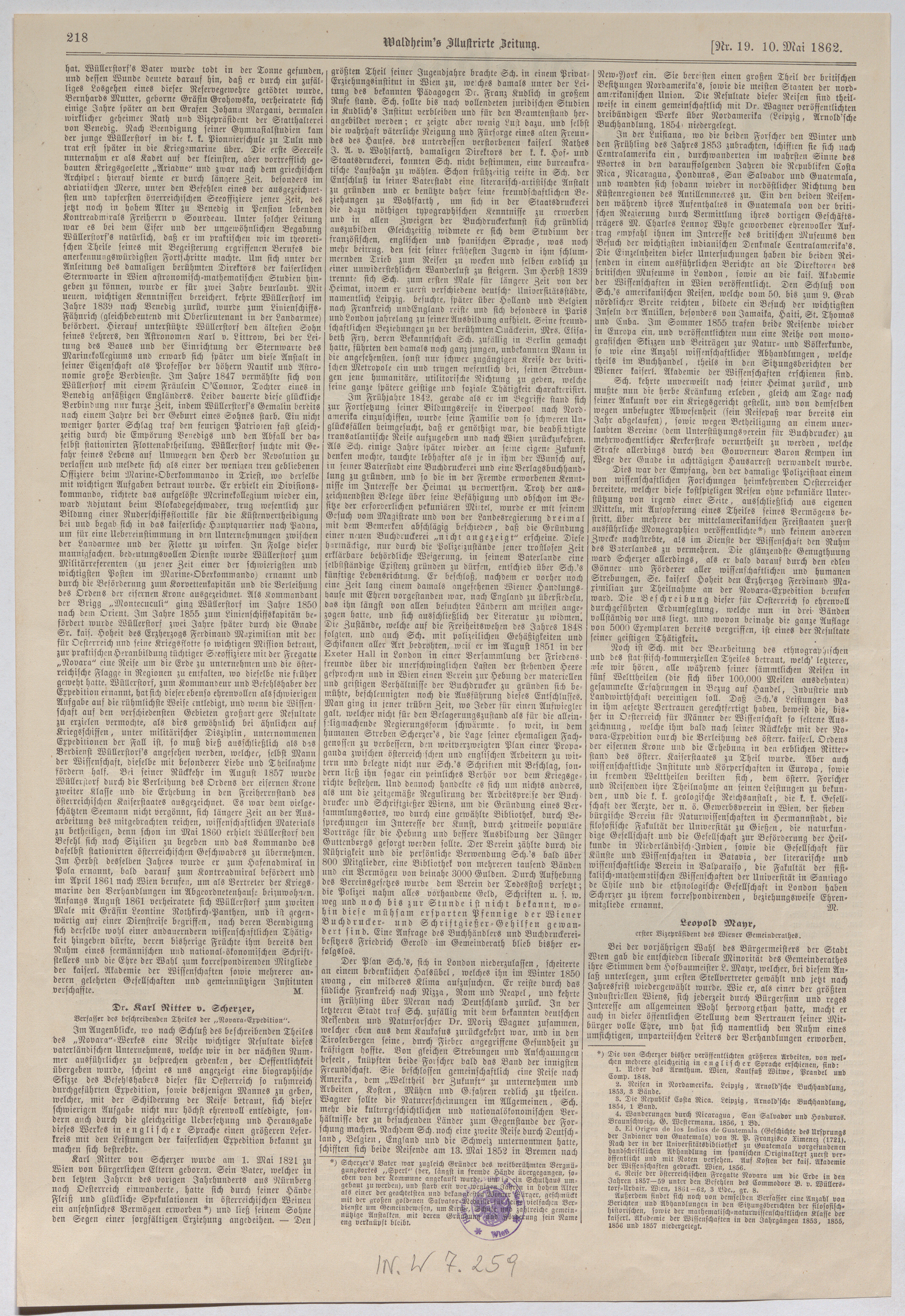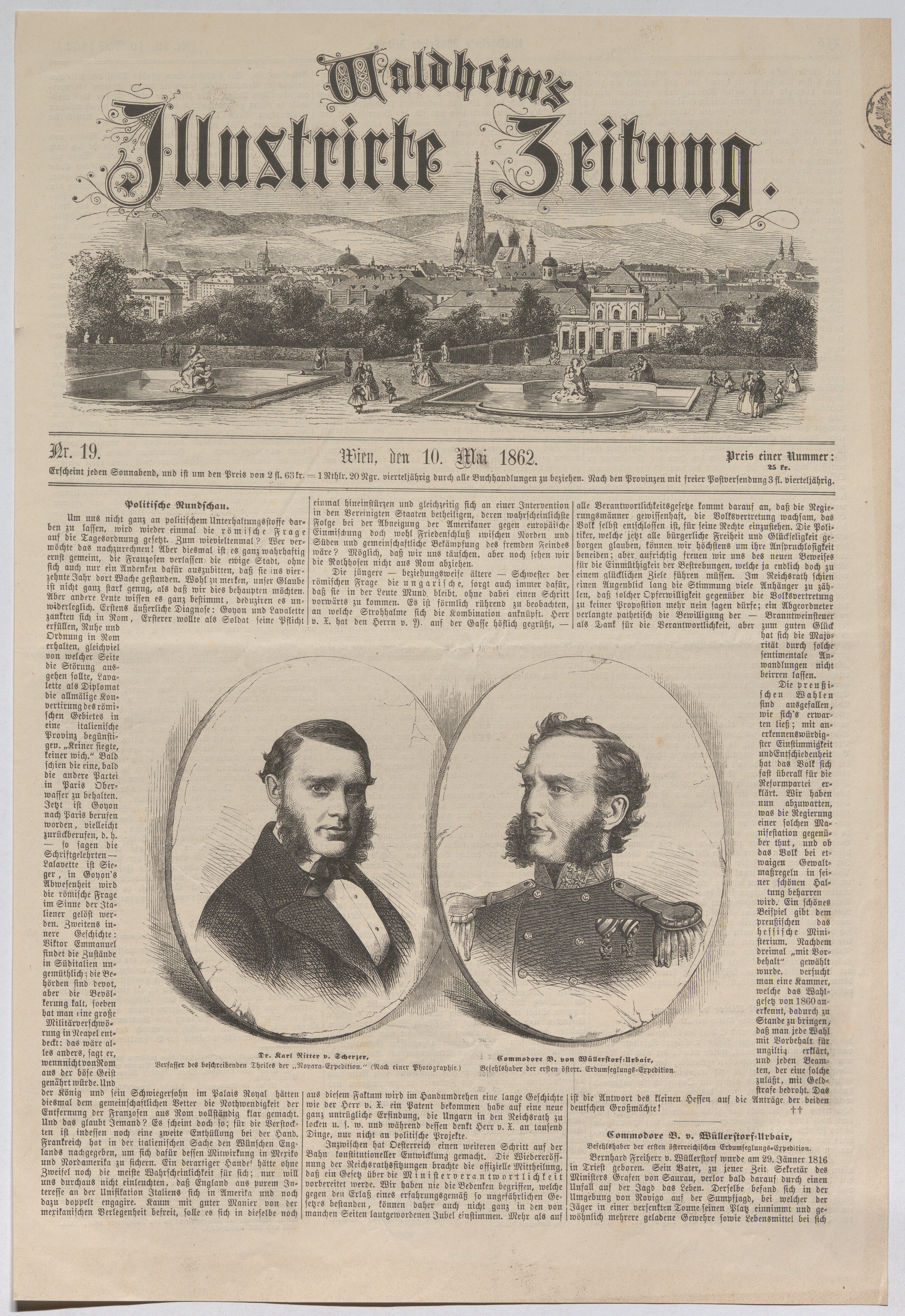 - Bernhard von Wüllerstorf-Urbair, Befehlshaber der ersten öster. Erdumsegelungs-Expedition; Karl von Scherzer, Verfasser des beschreibenden Teiles der Novara-Expedition ("Waldheims Illustrirte Zeitung.")