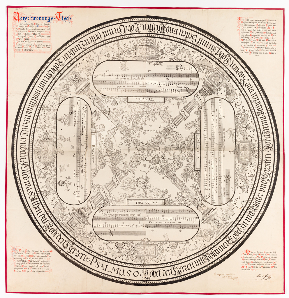 Abbildung des Tisches in Schloss Pottendorf, an dem die Teilnehmer der Magnatenverschwörung 1670/71 Rat hielten und Bericht über die Hinrichtung der Verschwörer