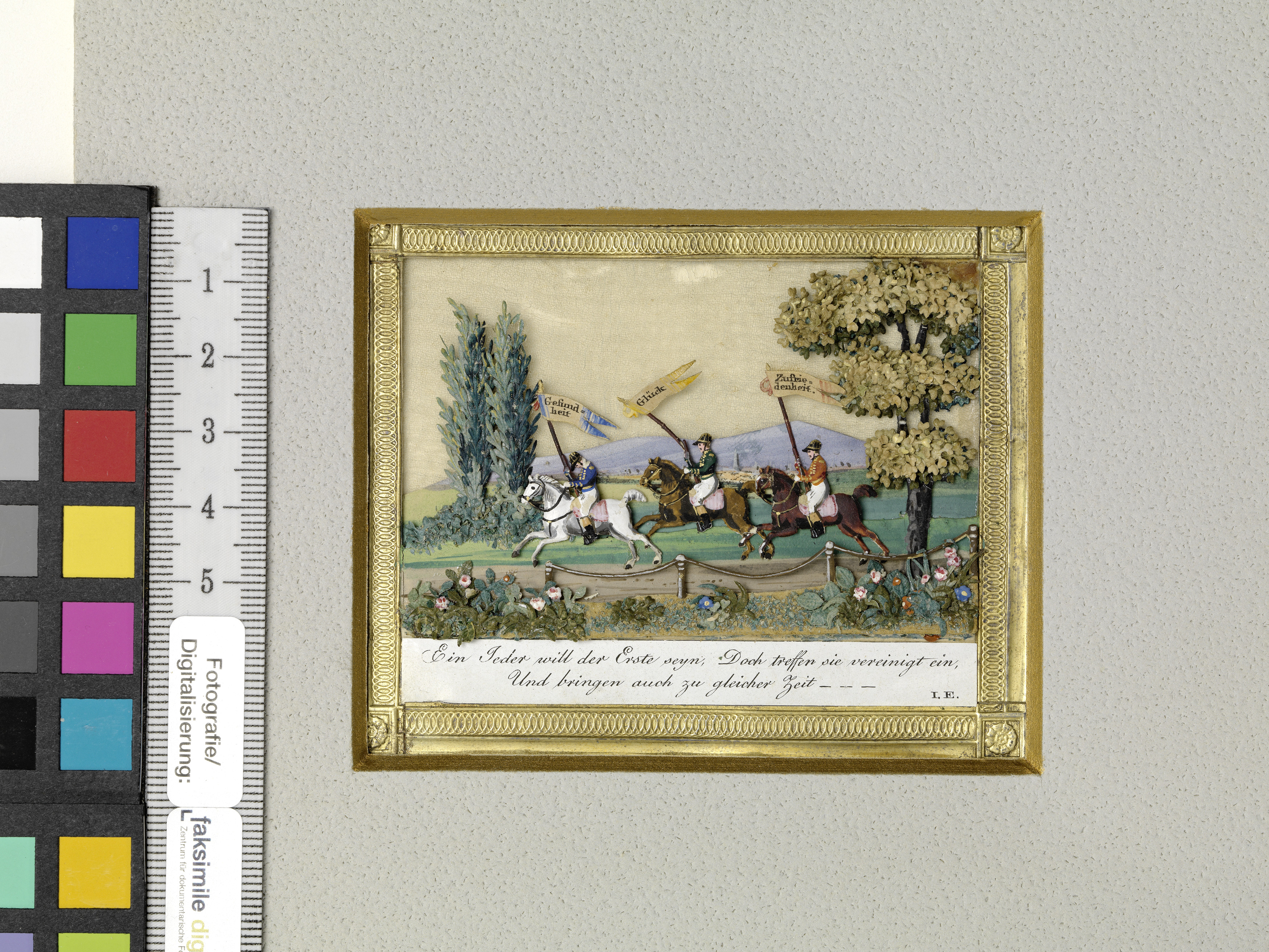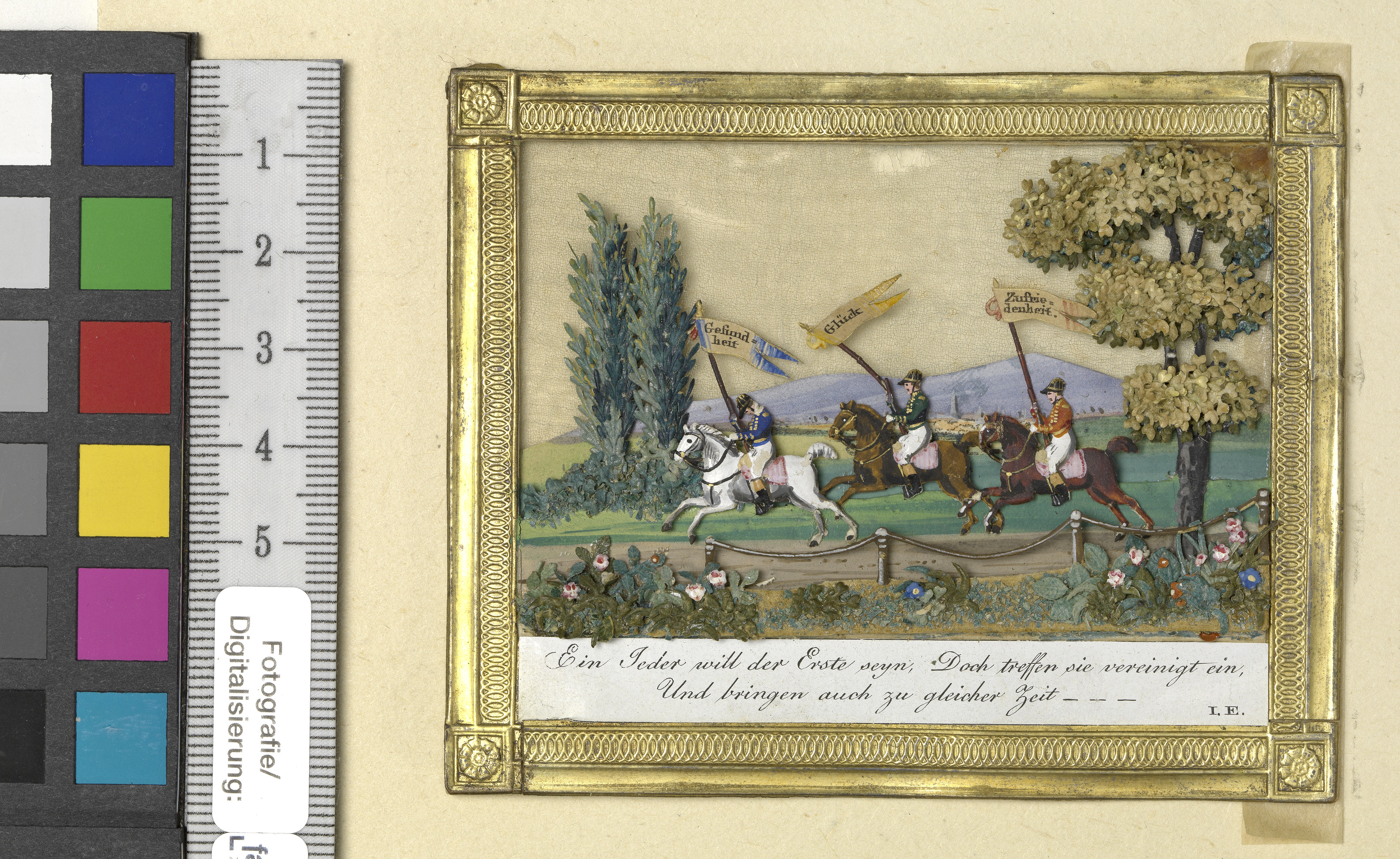 Kunstbillet; Spruch: Ein jeder will der Erste seyn, / Doch treffen sie vereinigt ein, / Und bringen auch zu gleicher Zeit - - - Auf den Fahnen: Gesundheit Glück Zufriedenheit