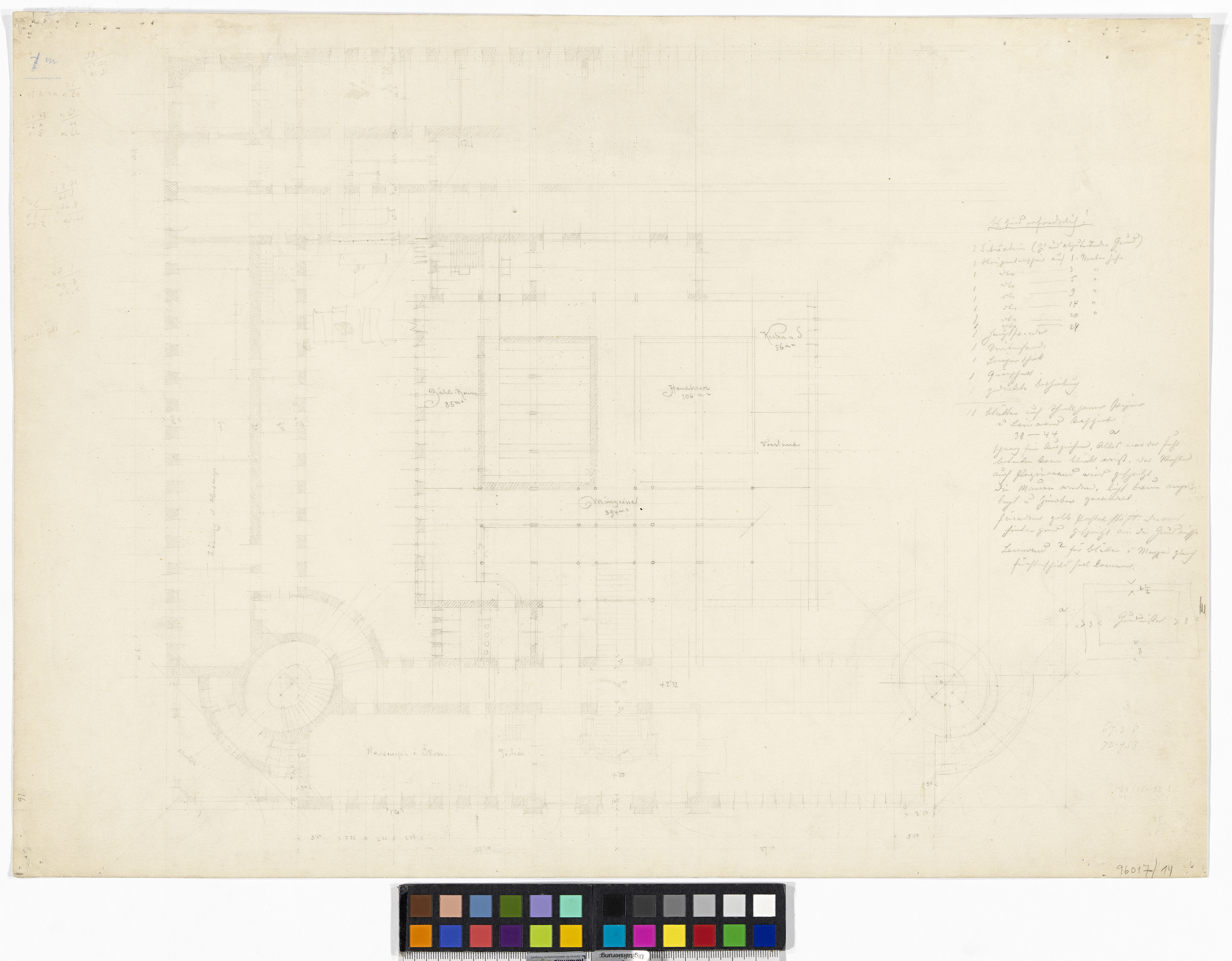 Moderne Galerie, Aufriss / verso: Österreichisch-Ungarische Bank in Budapest, Grundriss Parterre (1901)