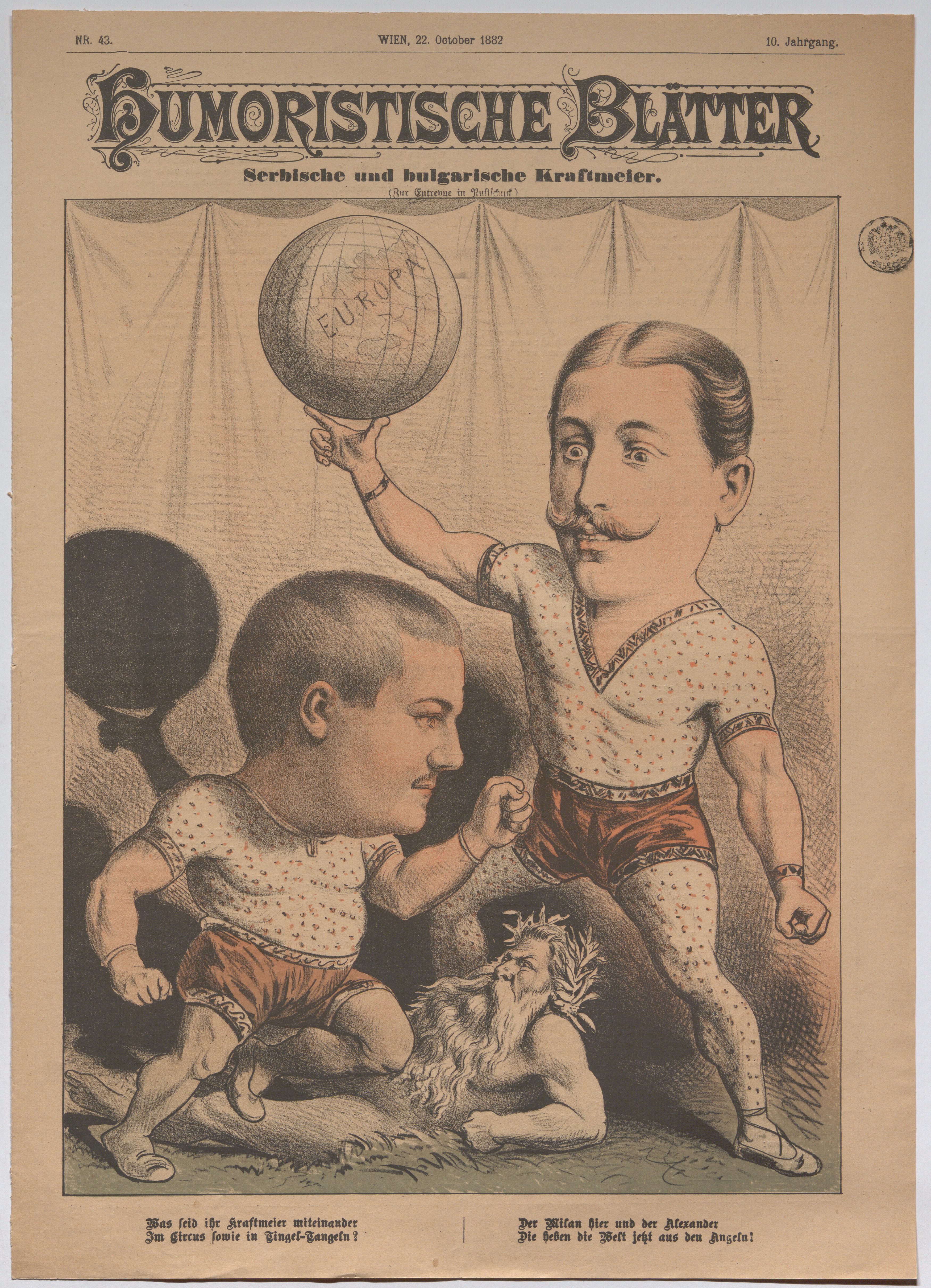- König Milan I. von Serbien und Alexander I. von Bulgarien als Kraftmeier, die die Welt aus den Angeln heben (Titelblatt von "Humoristische Blätter")