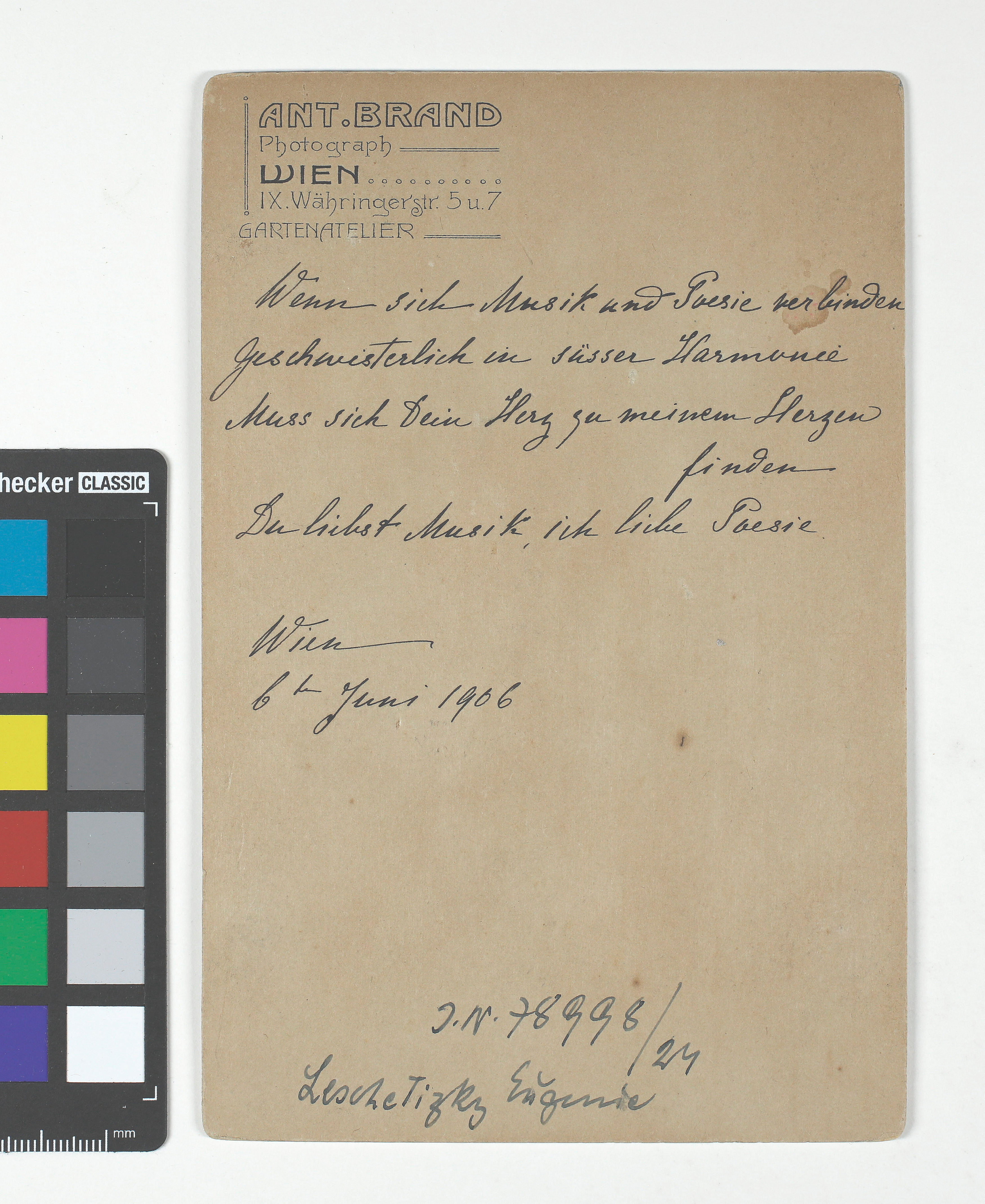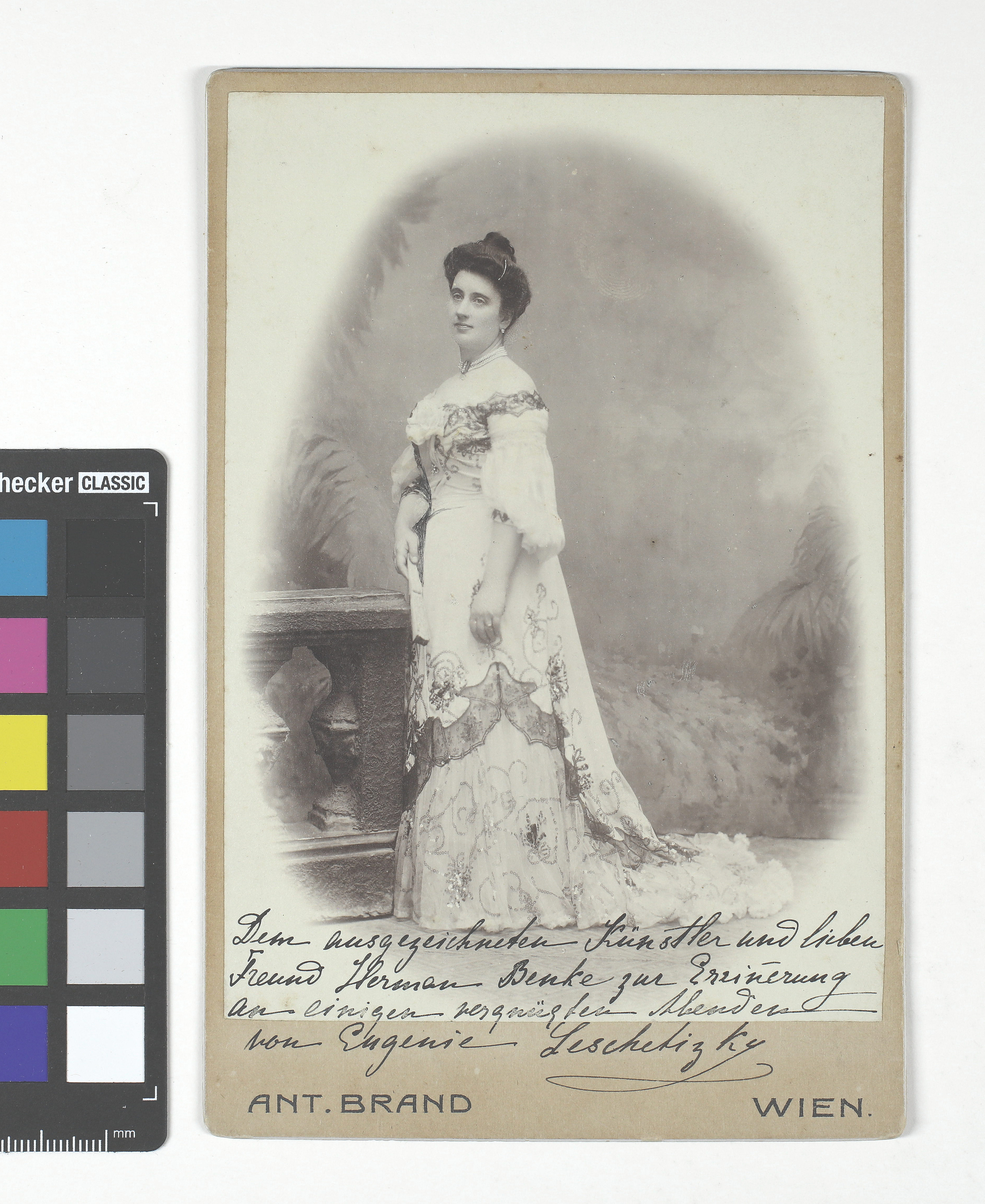 Eugenie Leschetizky, geb. von Benisławska, verehl. Donimirska (1. Ehe) (1858-1928), Pianistin, Ehefrau von Thomas Leschetizky (eigenhändige Widmung an Hermann Benke)
