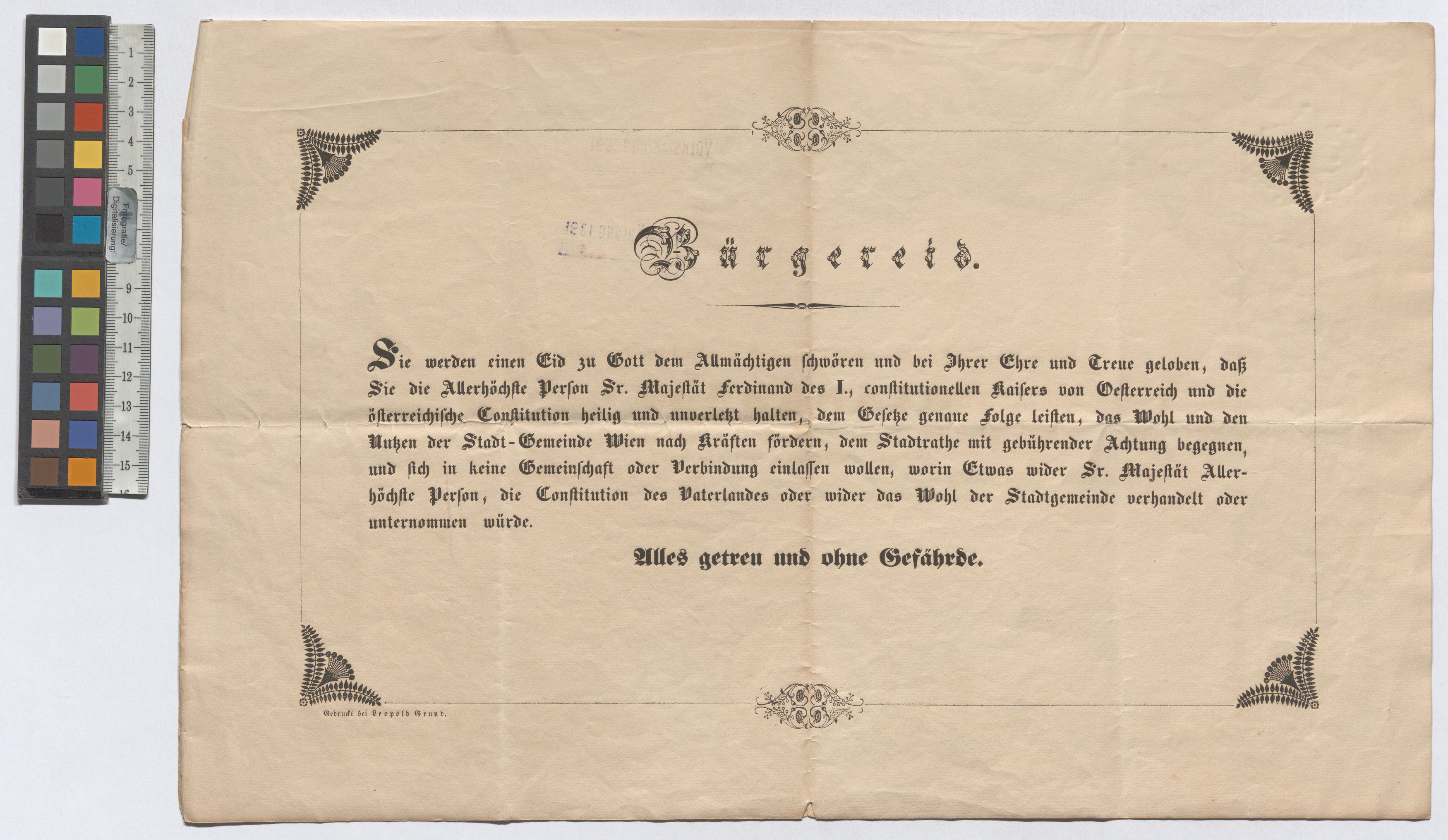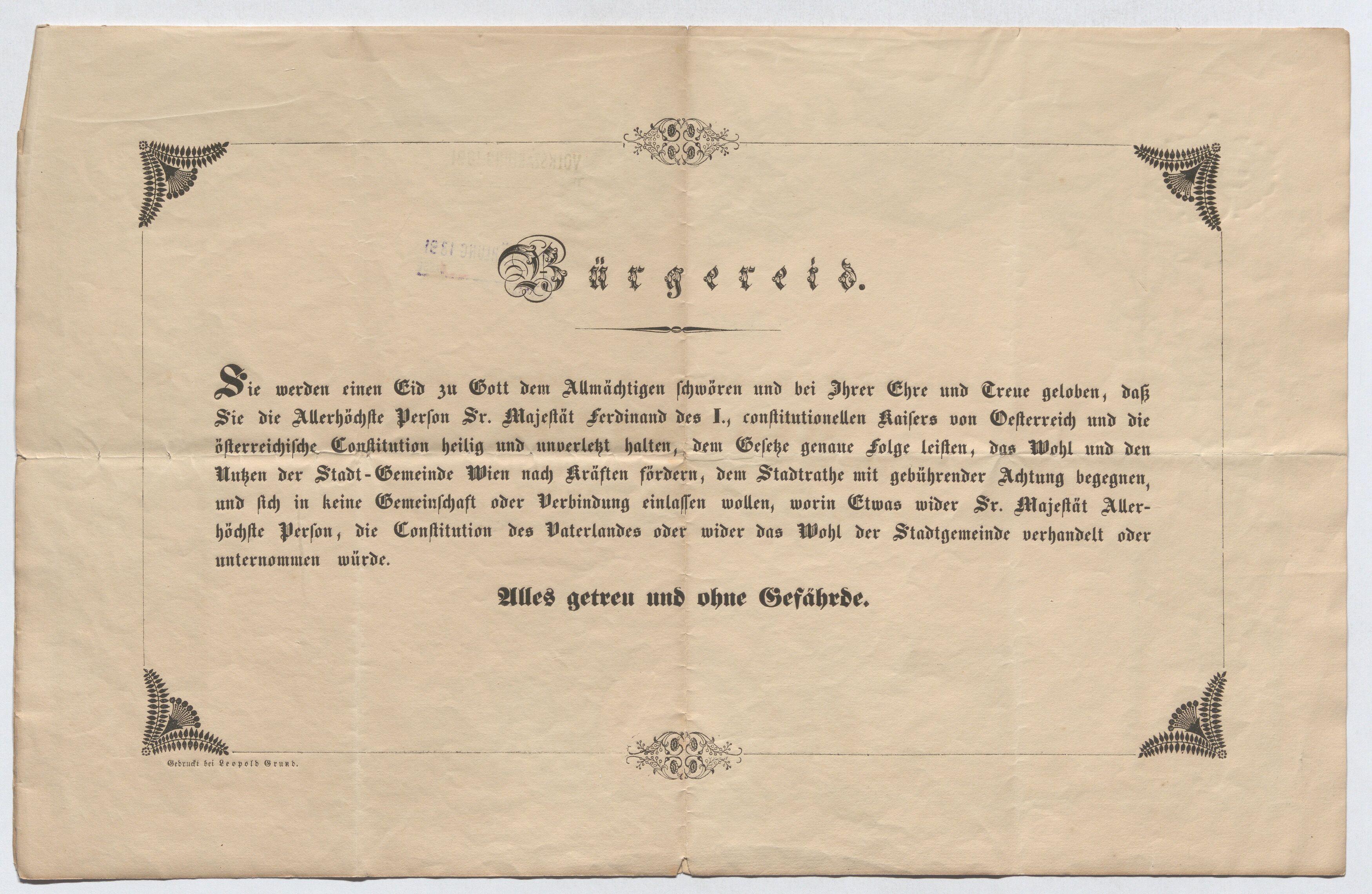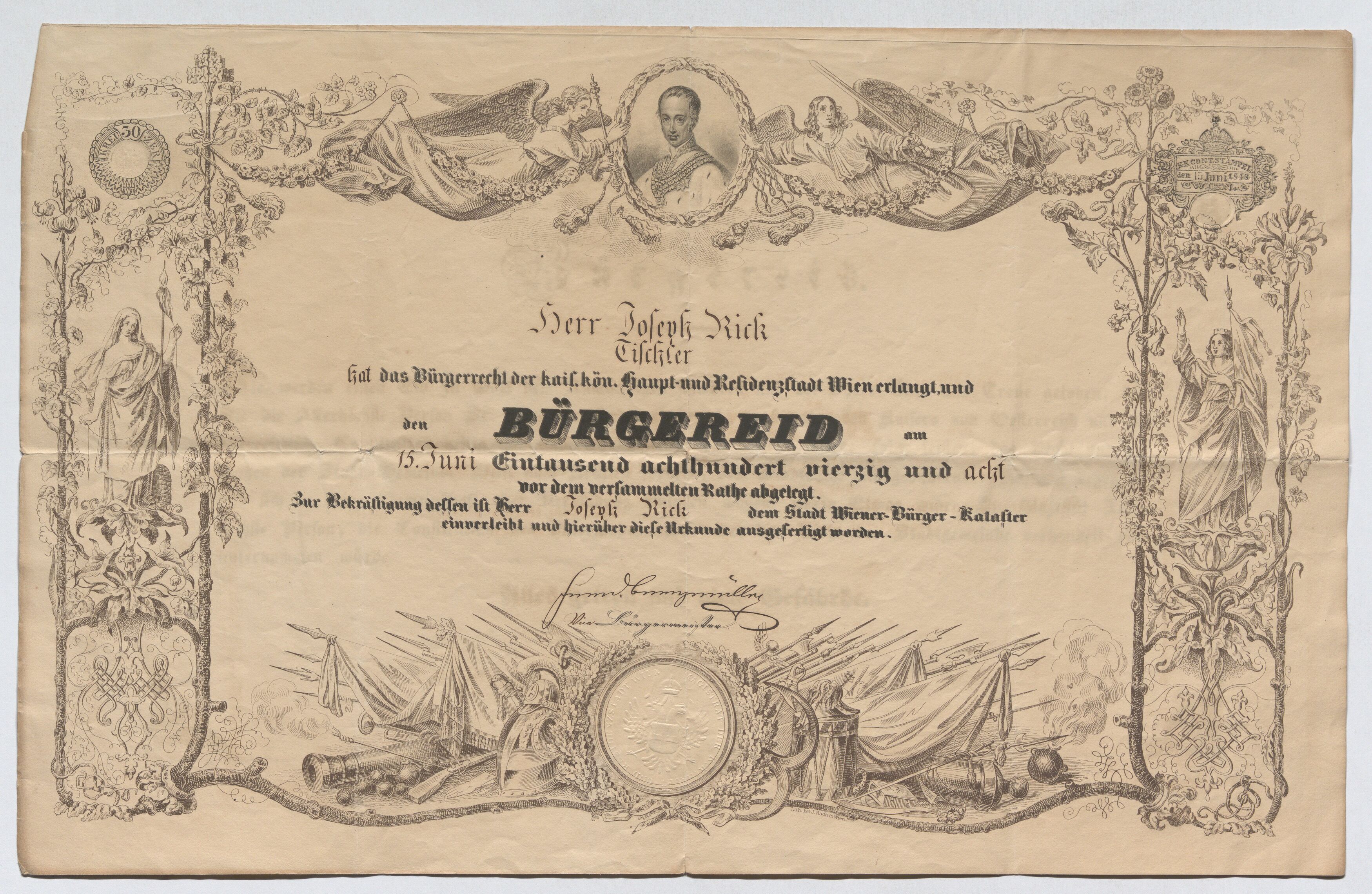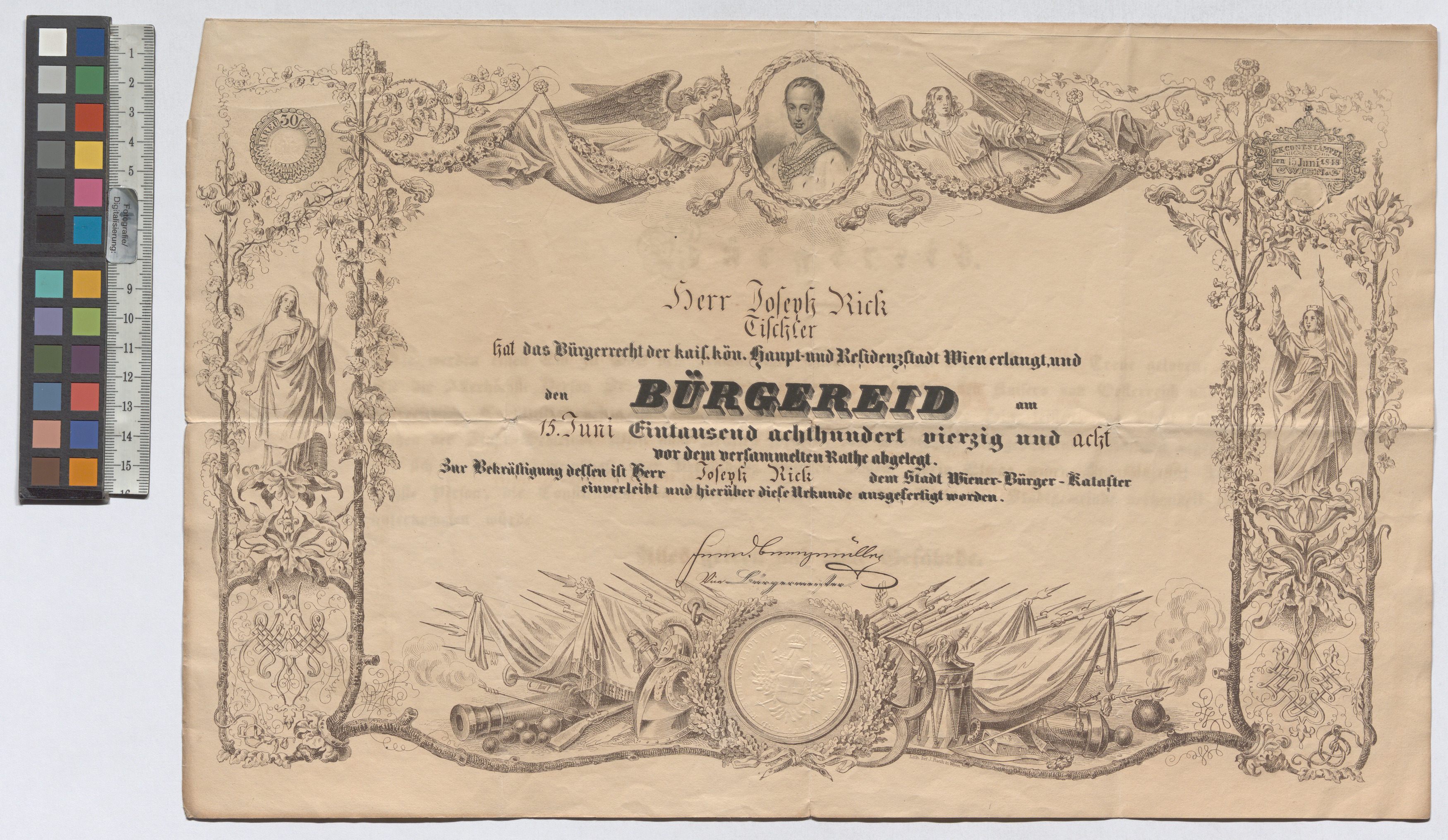 Bürgerrechtsurkunde für den Tischler Joseph Rick (Umrahmung mit Porträtmedaillon von Kaiser Ferdinand oben, Prägestempel des Wiener Magistrats, umrahmt von Kartusche mit Waffen, unten sowie allegorischen Darstellungen links und rechts)
