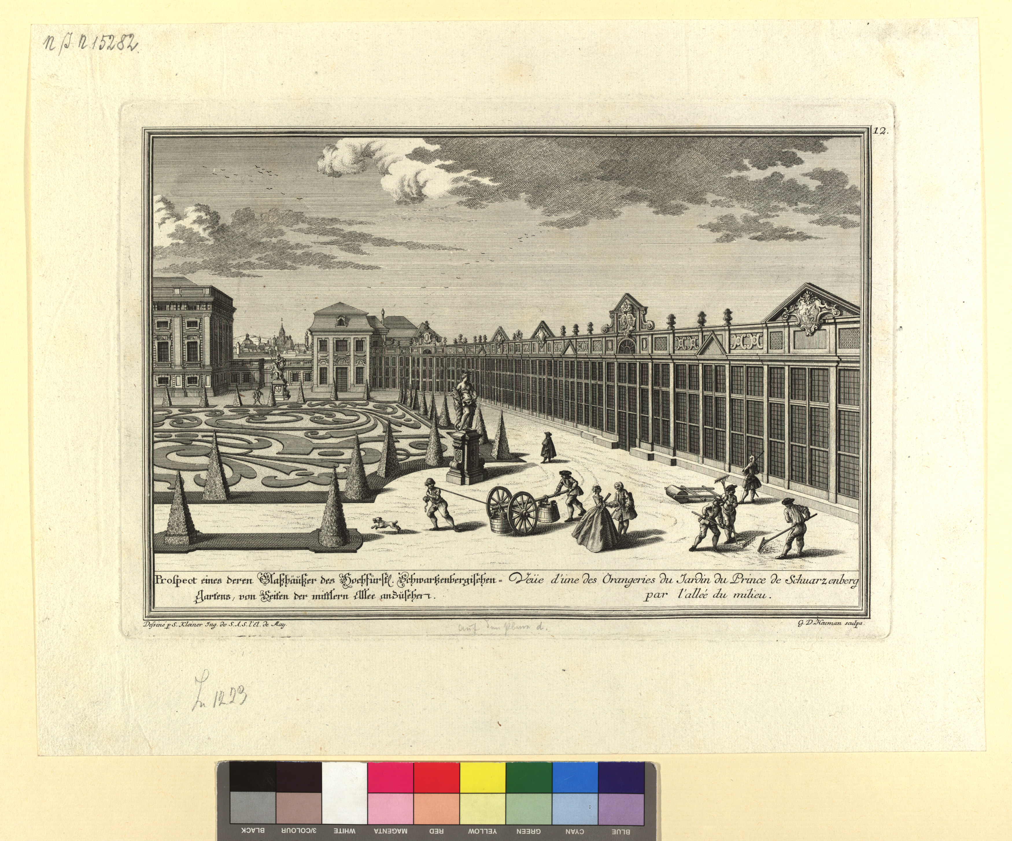 "Prospect eines deren Glaßhäußer des Hochfürstl. Schwartzenbergischen-Gartens" (Orangerie im Schwarzenbergischen Garten), aus: Wahrhafte und genaue Abbildung (...), 5. Teil, Abb. 12