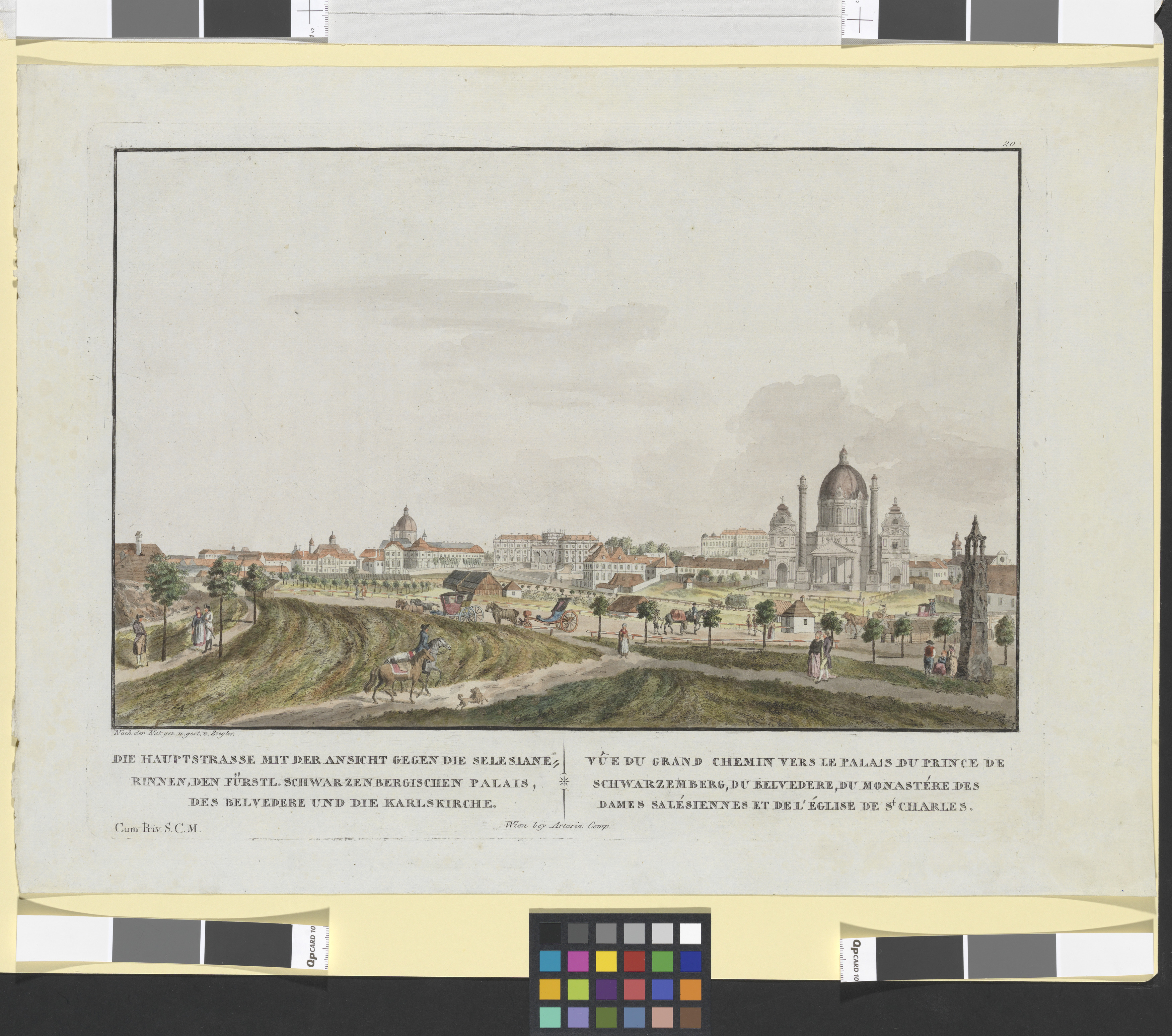 "Die Hauptstrasse mit der Ansicht gegen die Selesianerinnen, den fürstl. Schwarzenbergischen Palais, des Belvedere und die Karlskirche" / "Vue du grand Chemin vers le Palais du Prince de SChwarzenberg, du Belvedere, du Monastére des Dames Salésiennes et de L`Èglise de St. Charles" (3. Etat)
