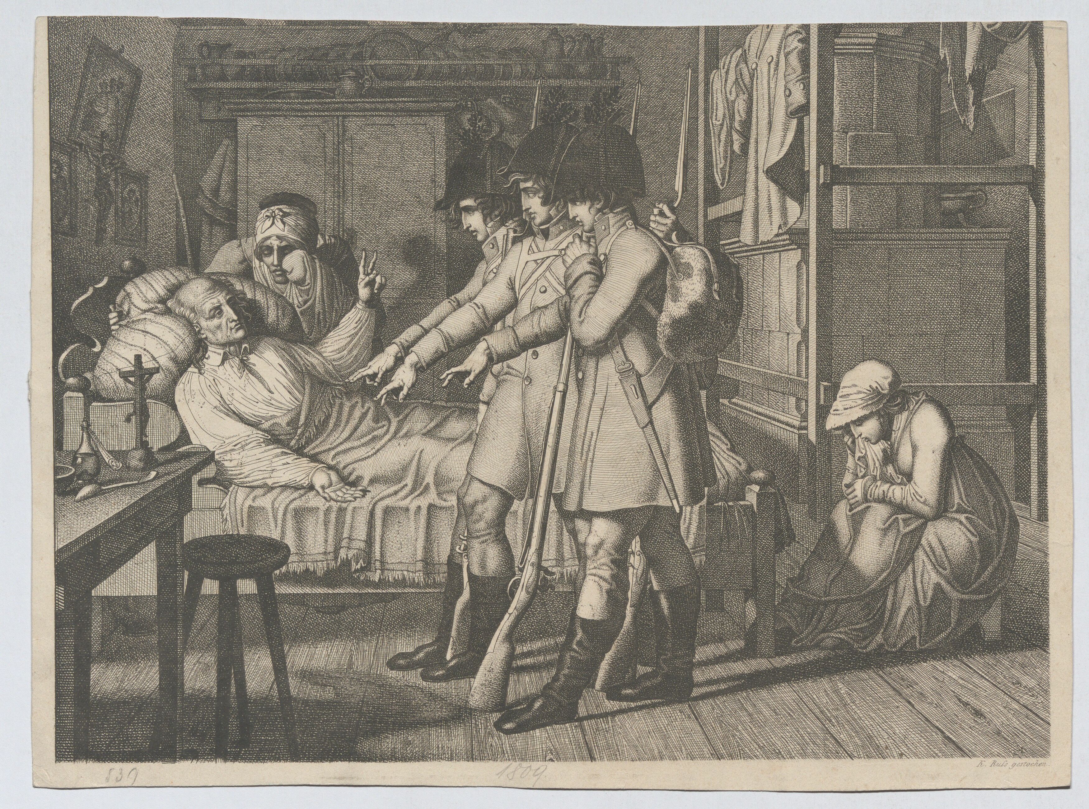Drei Landwehrmänner (zur Zeit der Befreiungskriege) nehmen von ihrem Vater Abschied