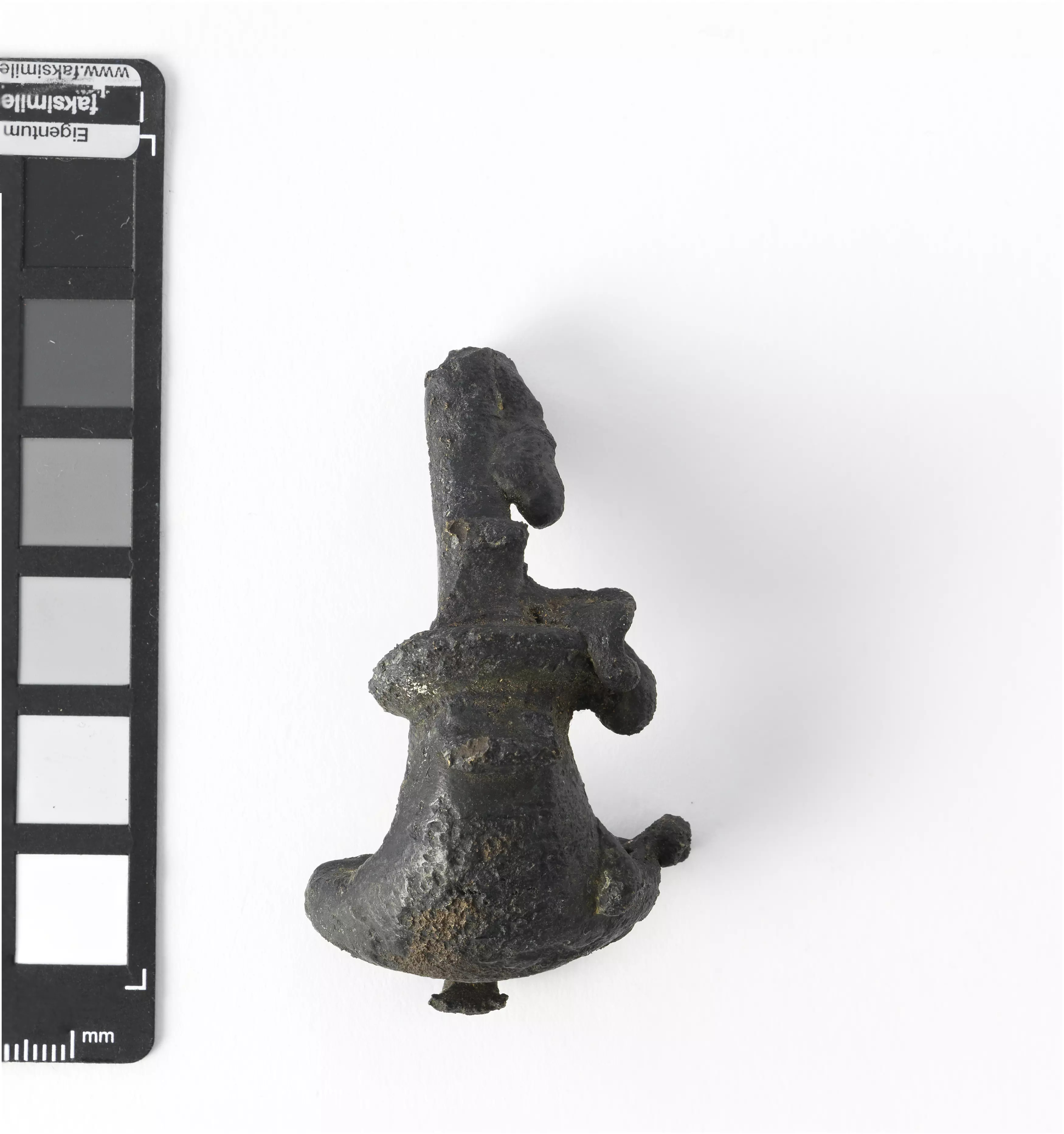 Norisch-pannonische Flügelfibel Almgren 238; eingliedrige Spiralfibel, Fuß mit einer Reihe eingepunzter Kreise verziert; Kopf mit Bügelfragment, stark verbrannt und geschmolzen, Spirale und Nadel fehlen.