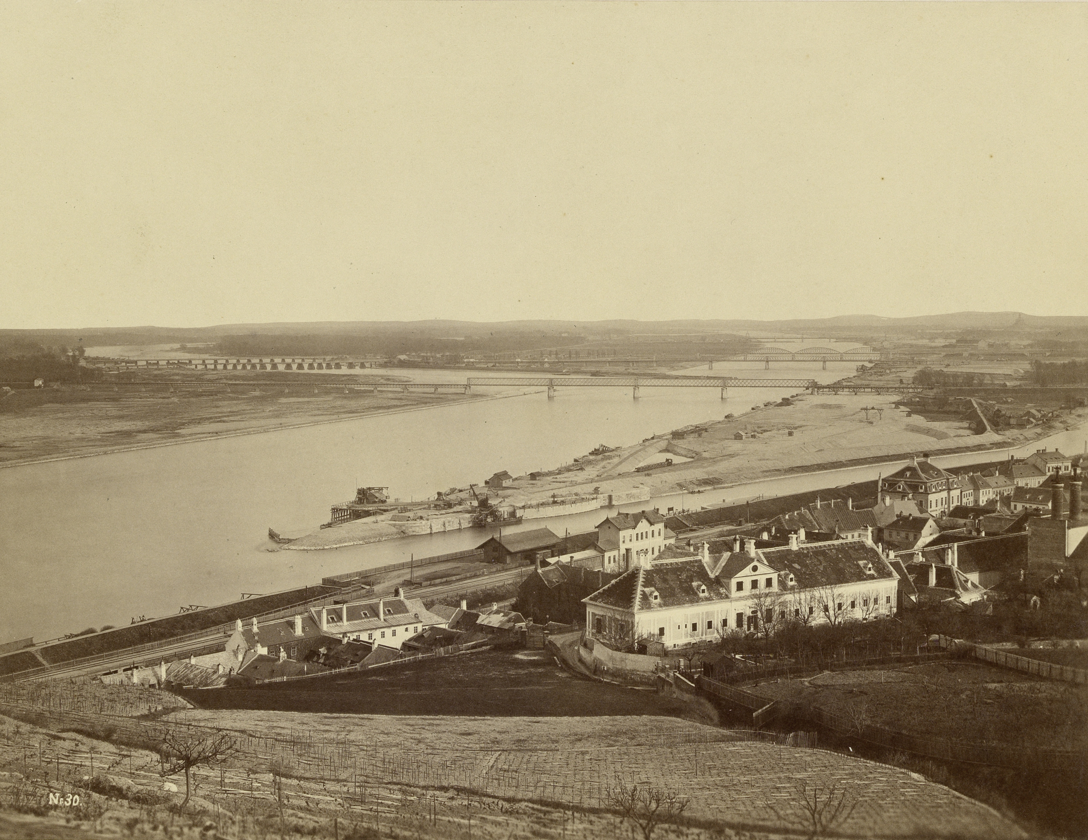 Panorama des Donaudurchstichs und des Donaukanals während der Abtragung des Roller- und Schwimmschul-Dammes