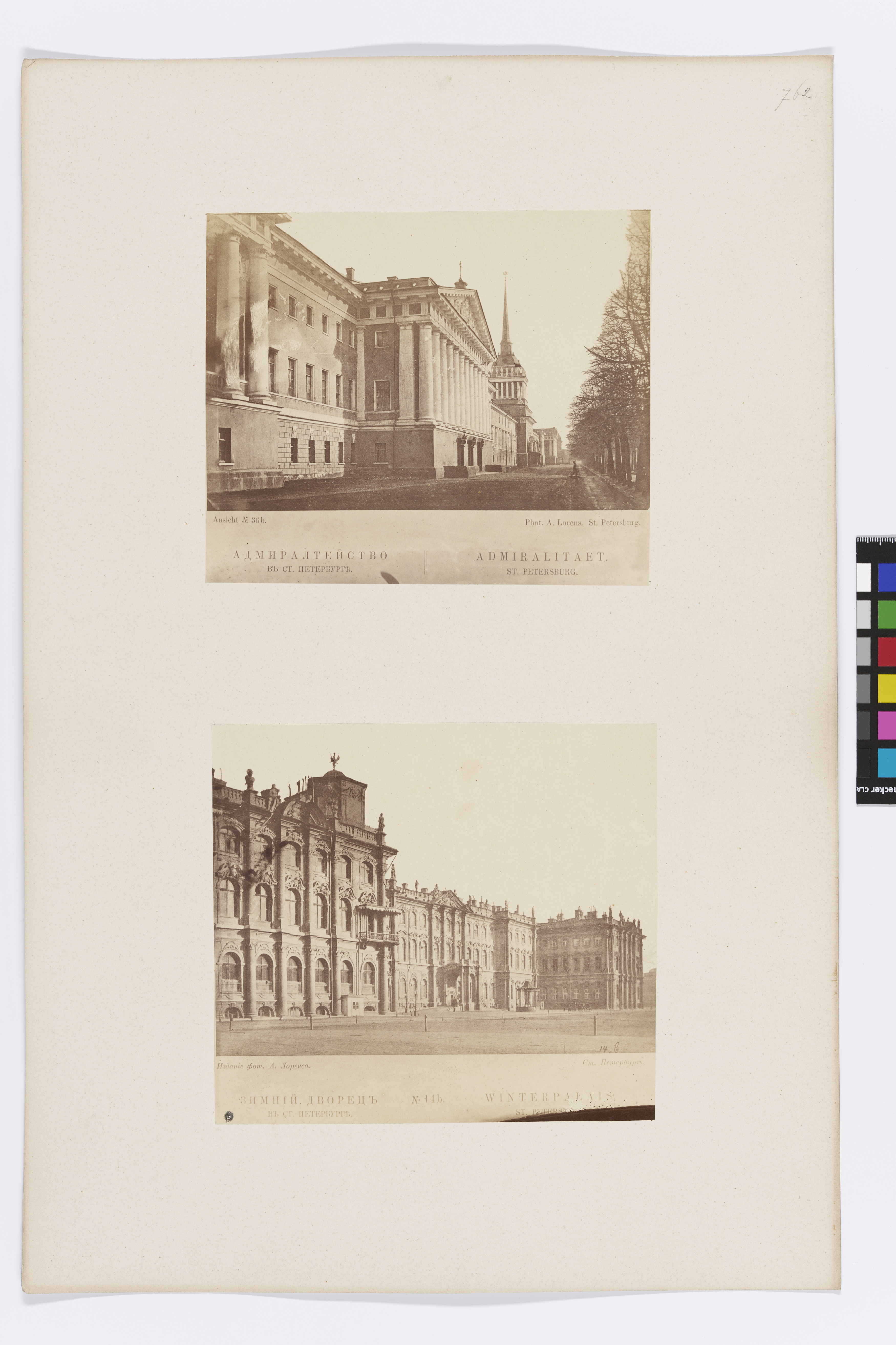 - r.u. “14.b”; l.u. “Избаніе фом. А. Лоренса.”; r.u. “См. Петербур…”; l.u. “ЗИМНІЙ ДВОРЕЦЪ / ВЪ СТ. ПЕТЕРБУ́РГЪ.”; m.u. “No 14b.”; r.u. “WINTERPALAIS / ST. PETERSB…”;