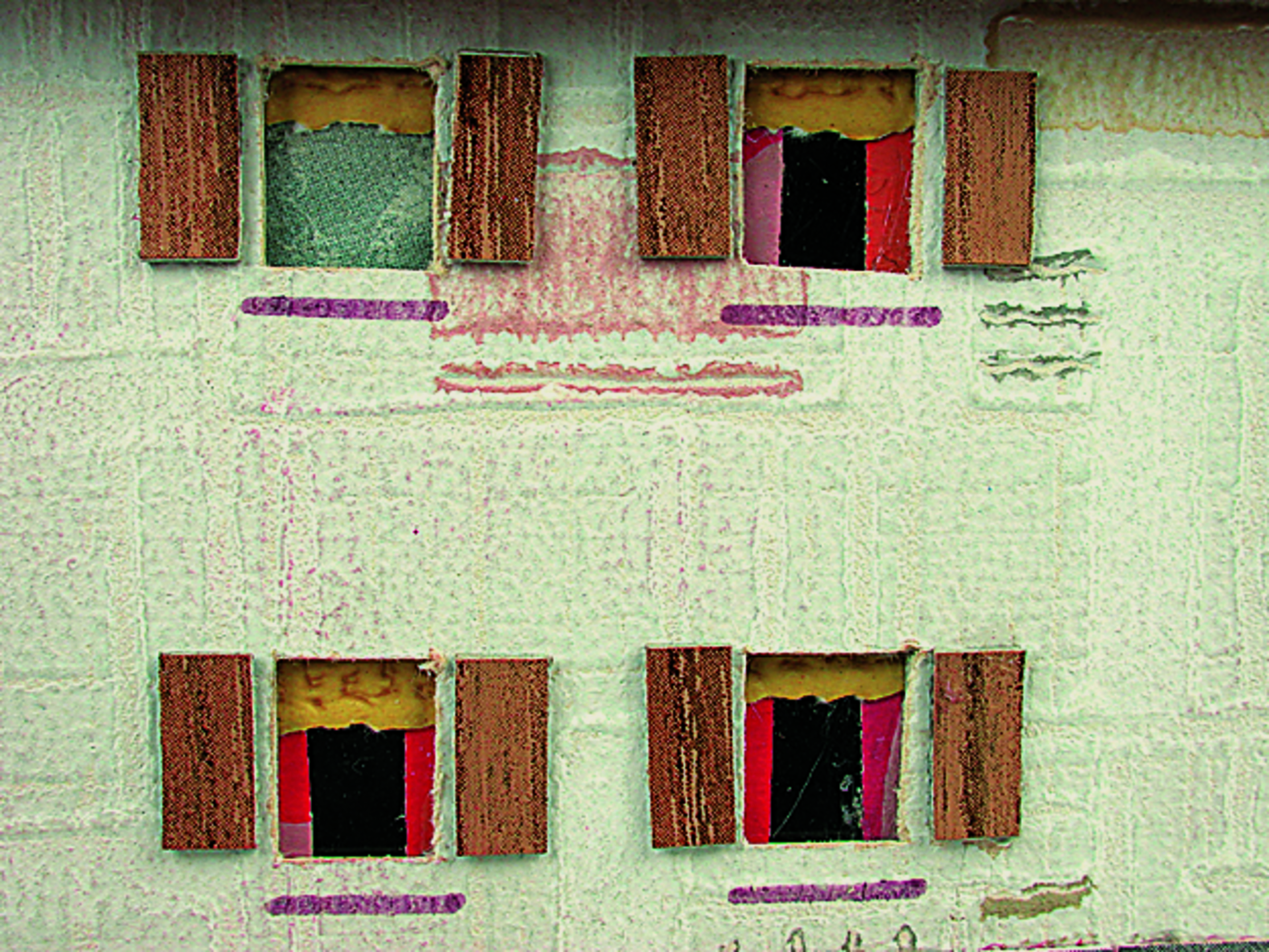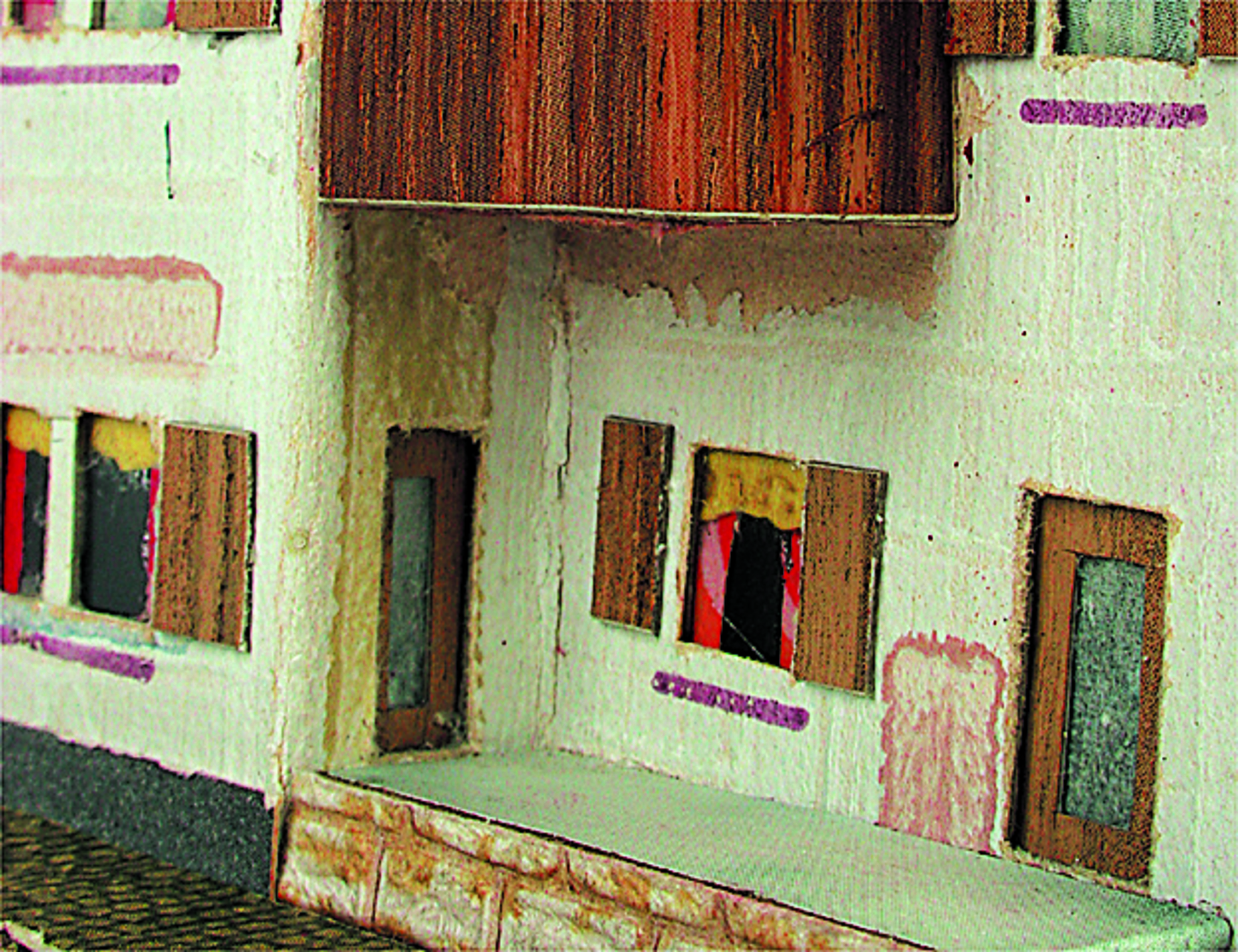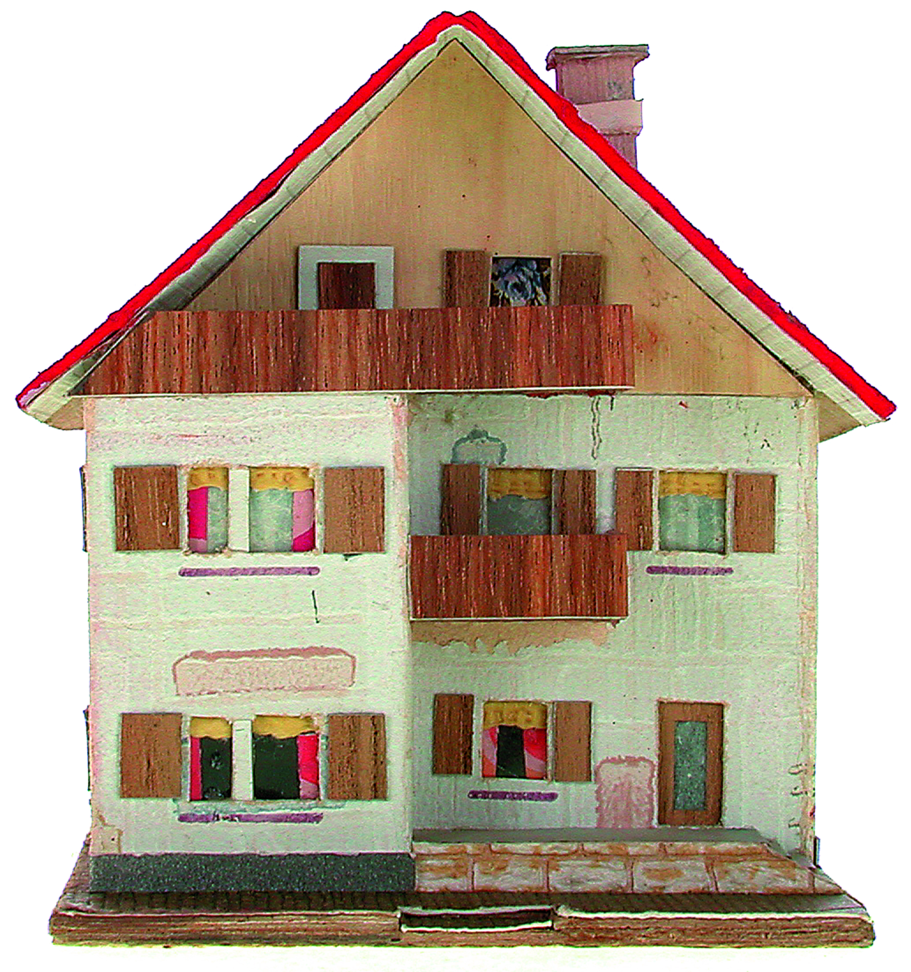 Anmerkung der Redaktion: Nicht von jedem Haus sind alle einzelnen verwendeten Materialien dokumentiert. Tatsächlich verbaute der Bastler auch Zigarettenschachteln, Spinnenpapier, Pappmaschee, Tapetenreste, Bunt- und Silberpapiere, Stoffe, Synthetikfasern, d-c-fix-Folien, Schriftproben, Zeitungsschnipsel und ausgewertete Illustrierte, Kartonagen, Holzabfälle aller Art, Uhu, Holzleim und Tapetenkleister.