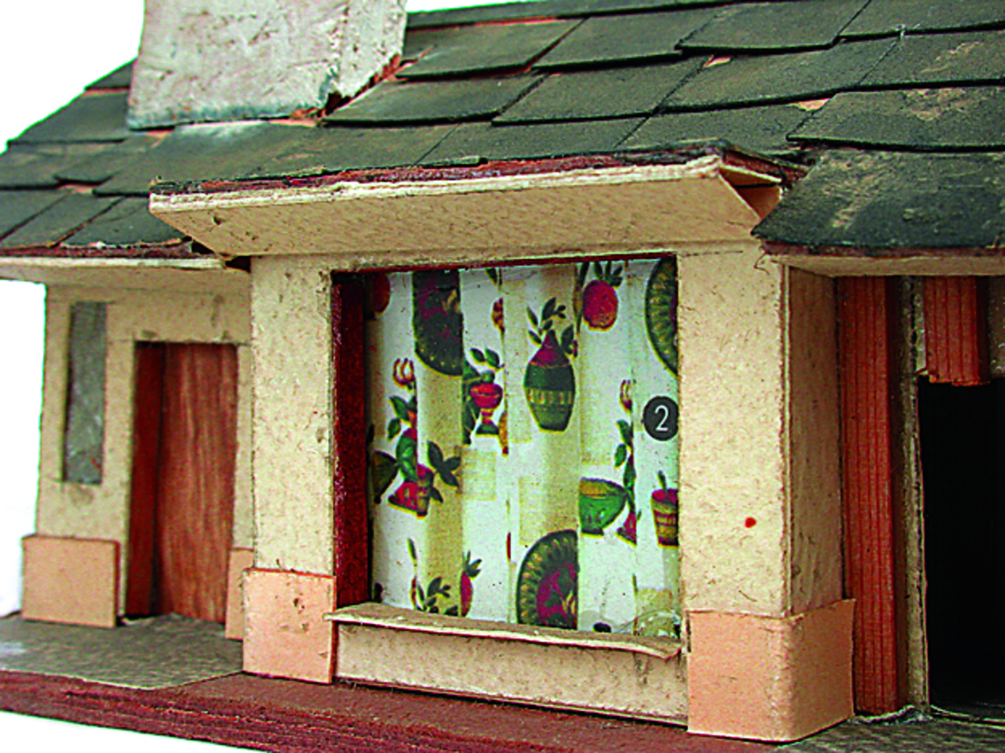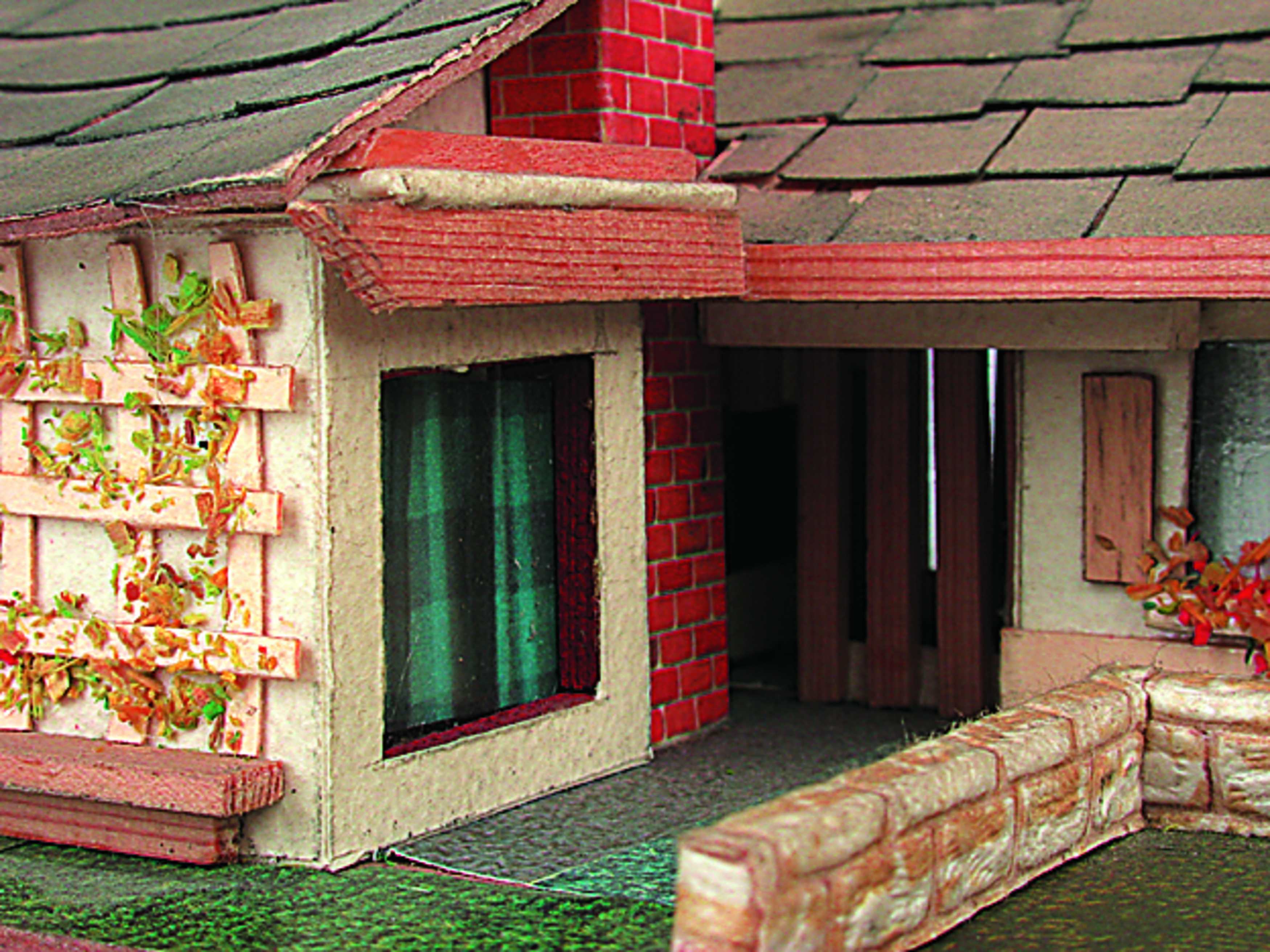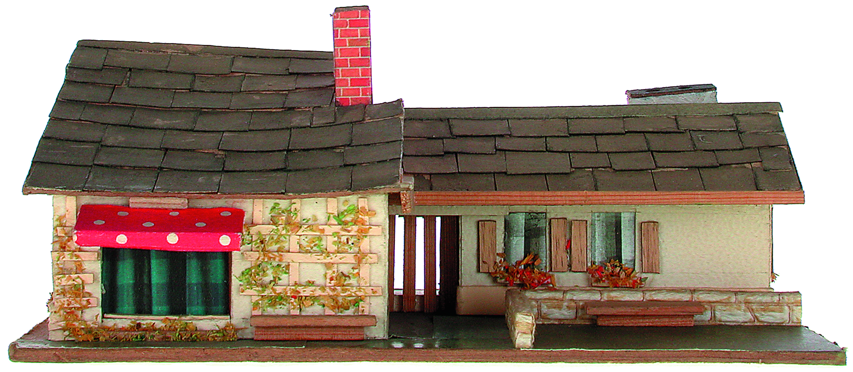 Anmerkung der Redaktion: Nicht von jedem Haus sind alle einzelnen verwendeten Materialien dokumentiert. Tatsächlich verbaute der Bastler auch Zigarettenschachteln, Spinnenpapier, Pappmaschee, Tapetenreste, Bunt- und Silberpapiere, Stoffe, Synthetikfasern, d-c-fix-Folien, Schriftproben, Zeitungsschnipsel und ausgewertete Illustrierte, Kartonagen, Holzabfälle aller Art, Uhu, Holzleim und Tapetenkleister.