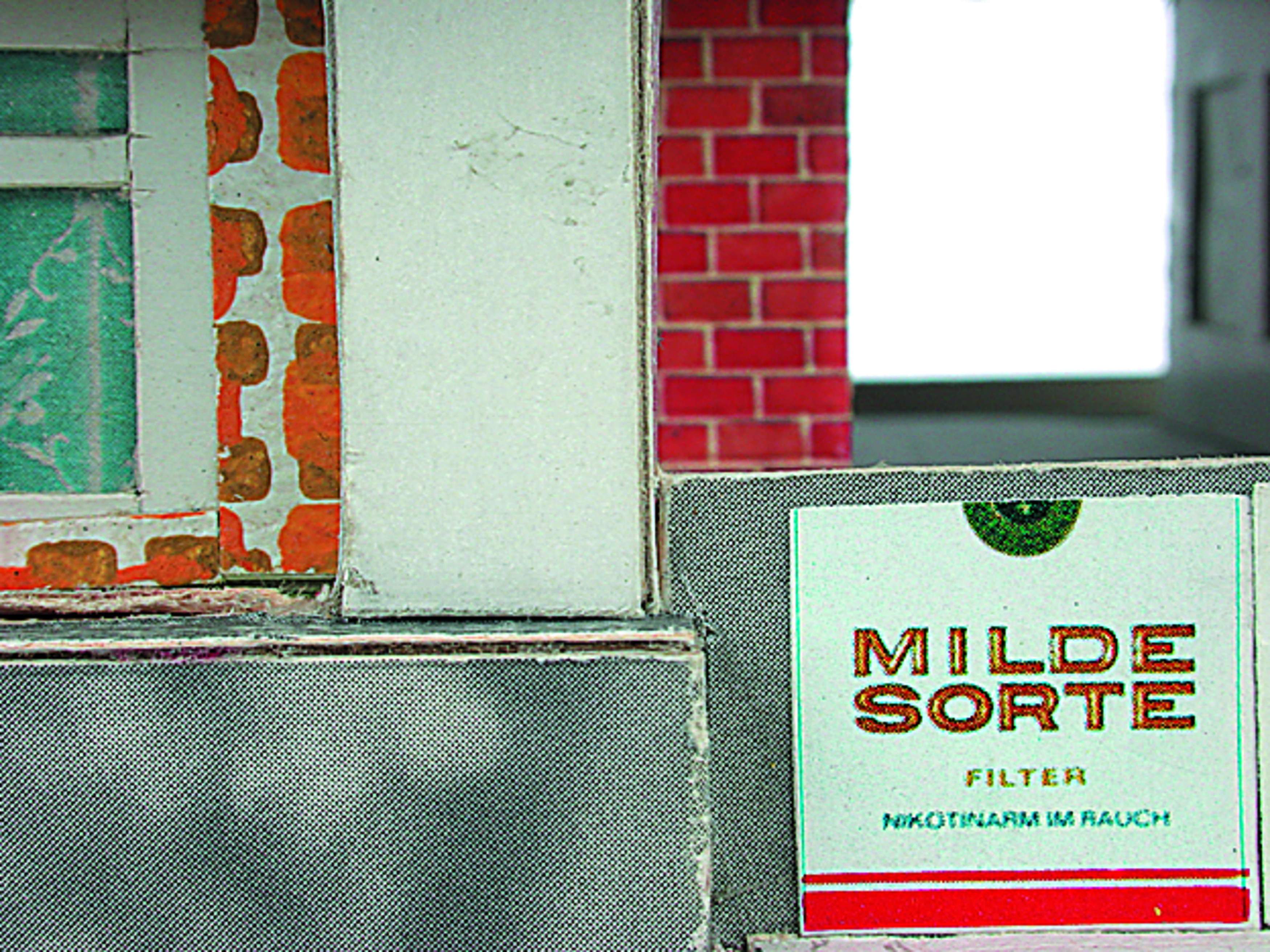 Anmerkung der Redaktion: Nicht von jedem Haus sind alle einzelnen verwendeten Materialien dokumentiert. Tatsächlich verbaute der Bastler auch Zigarettenschachteln, Spinnenpapier, Pappmaschee, Tapetenreste, Bunt- und Silberpapiere, Stoffe, Synthetikfasern, d-c-fix-Folien, Schriftproben, Zeitungsschnipsel und ausgewertete Illustrierte, Kartonagen, Holzabfälle aller Art, Uhu, Holzleim und Tapetenkleister.