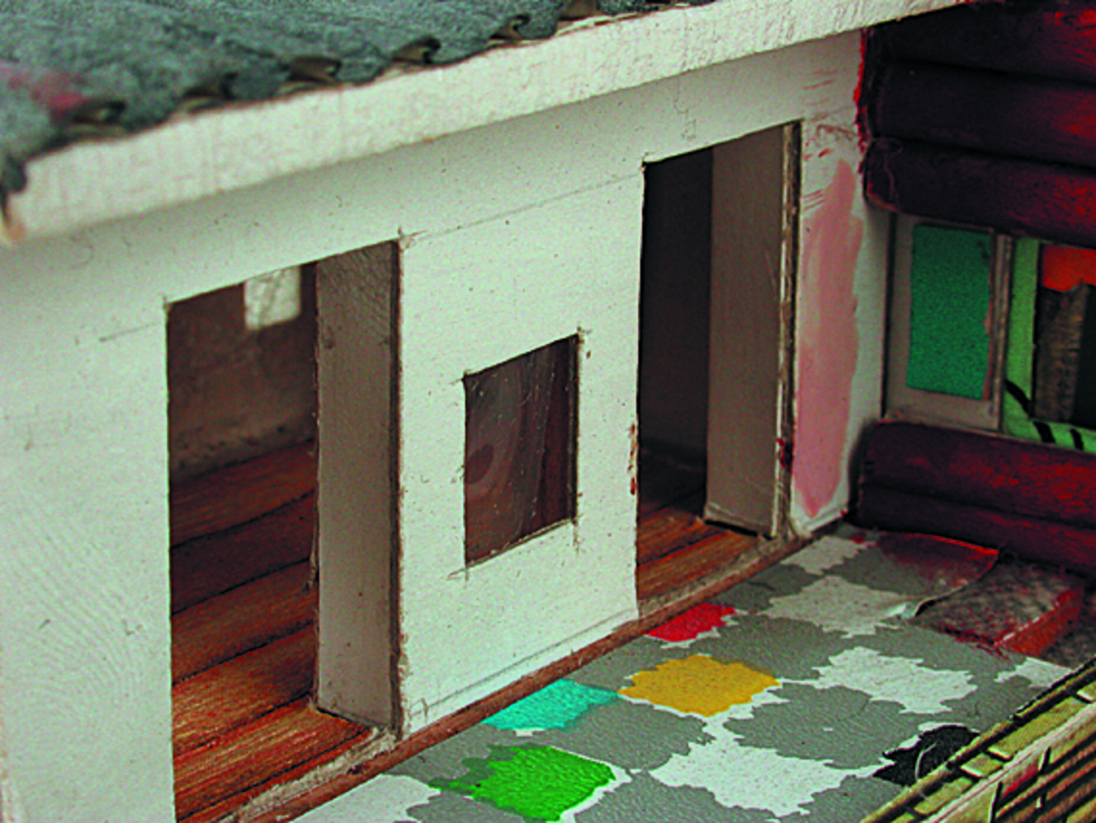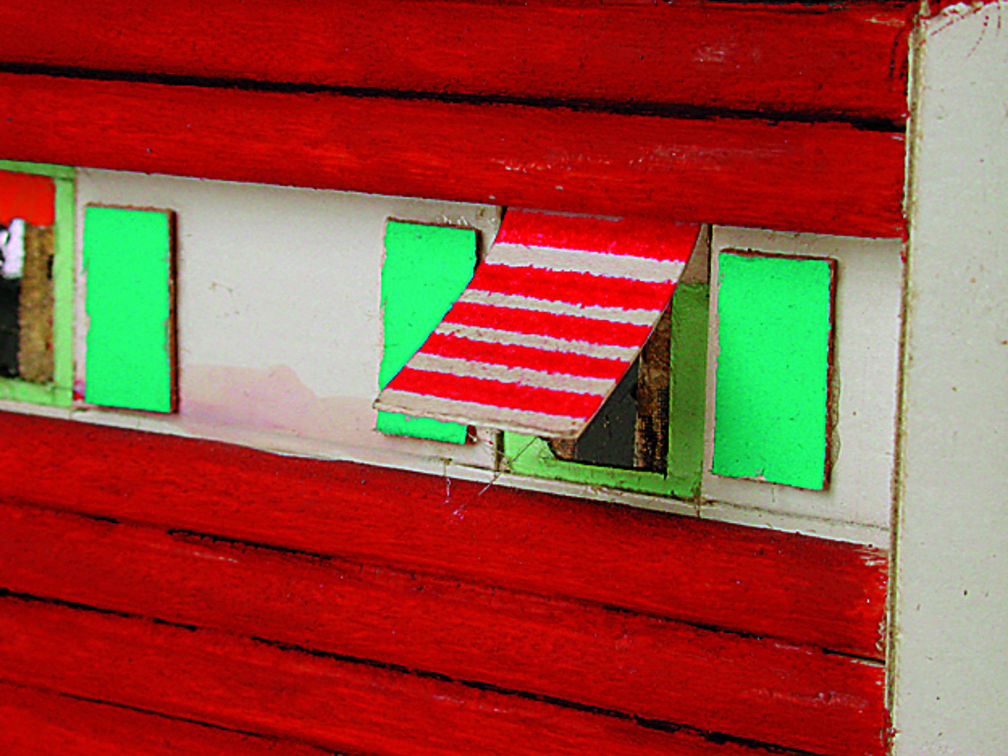 Anmerkung der Redaktion: Nicht von jedem Haus sind alle einzelnen verwendeten Materialien dokumentiert. Tatsächlich verbaute der Bastler auch Zigarettenschachteln, Spinnenpapier, Pappmaschee, Tapetenreste, Bunt- und Silberpapiere, Stoffe, Synthetikfasern, d-c-fix-Folien, Schriftproben, Zeitungsschnipsel und ausgewertete Illustrierte, Kartonagen, Holzabfälle aller Art, Uhu, Holzleim und Tapetenkleister.