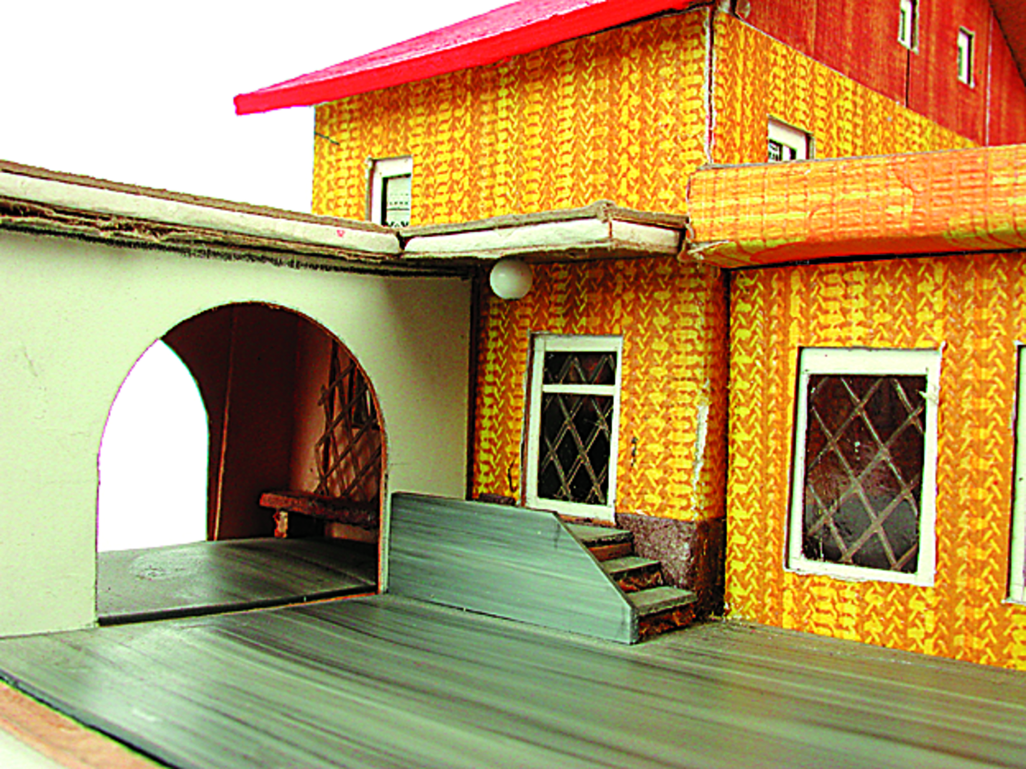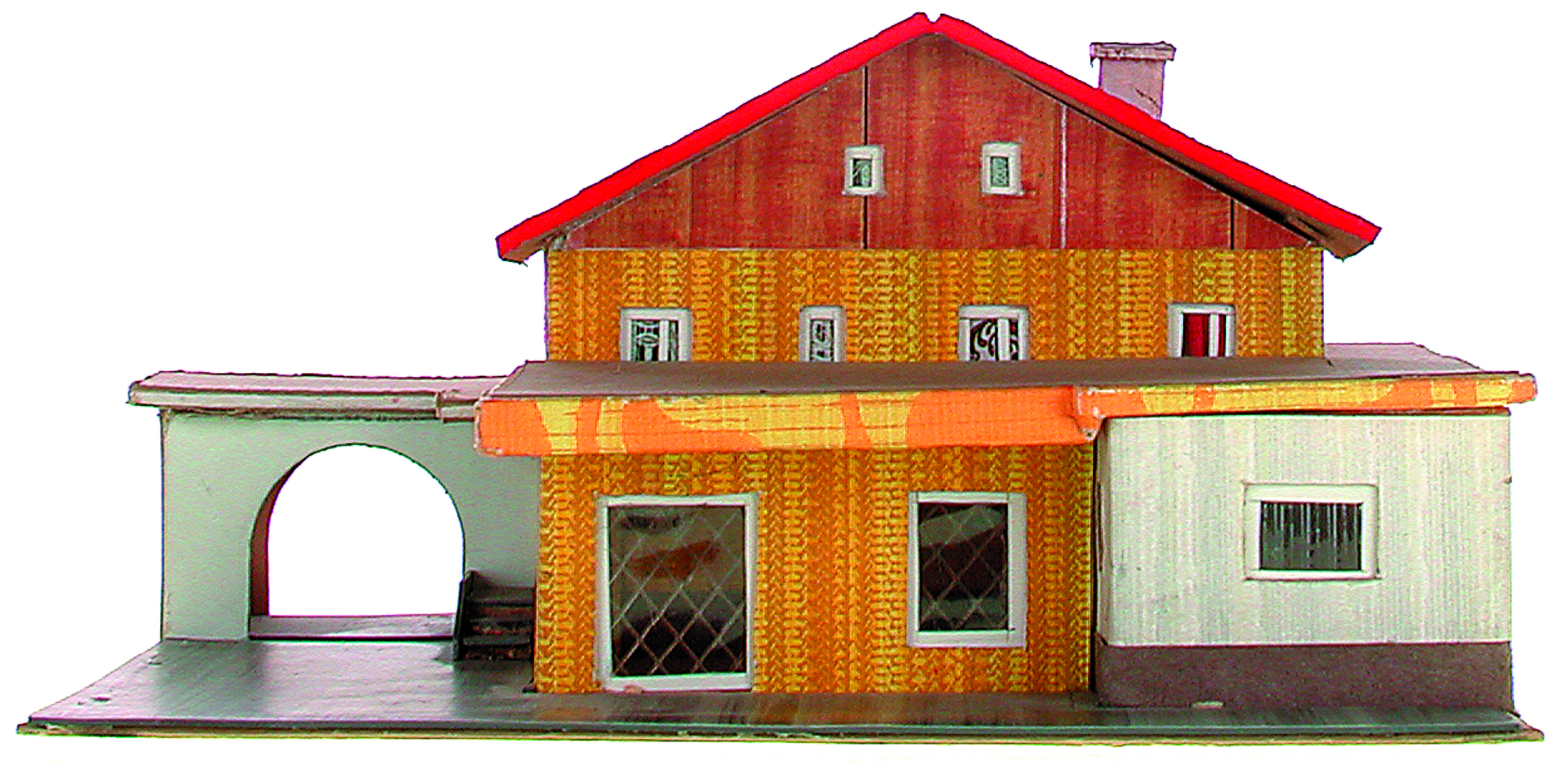 Anmerkung der Redaktion: Nicht von jedem Haus sind alle einzelnen verwendeten Materialien dokumentiert. Tatsächlich verbaute der Bastler auch Zigarettenschachteln, Spinnenpapier, Pappmaschee, Tapetenreste, Bunt- und Silberpapiere, Stoffe, Synthetikfasern, d-c-fix-Folien, Schriftproben, Zeitungsschnipsel und ausgewertete Illustrierte, Kartonagen, Holzabfälle aller Art, Uhu, Holzleim und Tapetenkleister.