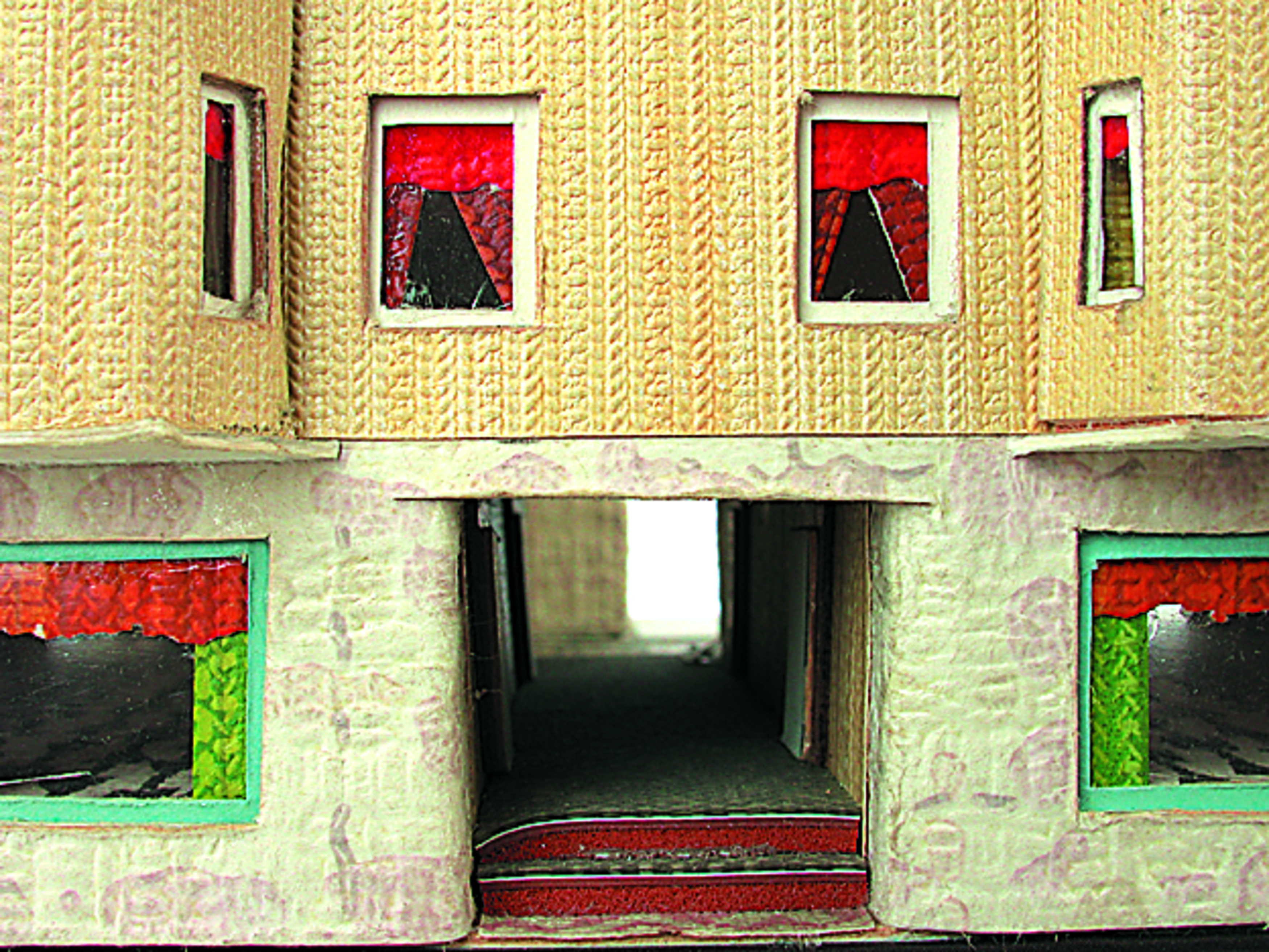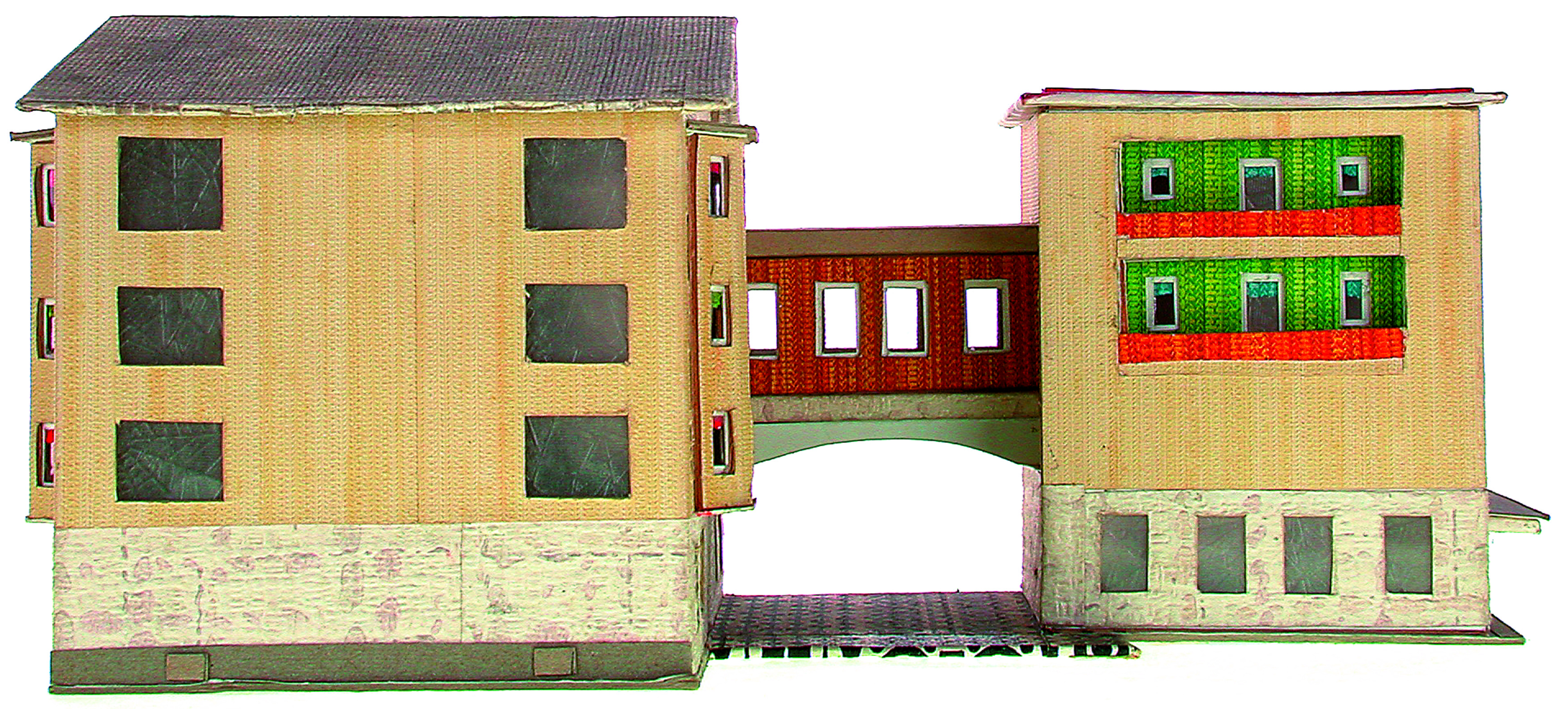 Anmerkung der Redaktion: Nicht von jedem Haus sind alle einzelnen verwendeten Materialien dokumentiert. Tatsächlich verbaute der Bastler auch Zigarettenschachteln, Spinnenpapier, Pappmaschee, Tapetenreste, Bunt- und Silberpapiere, Stoffe, Synthetikfasern, d-c-fix-Folien, Schriftproben, Zeitungsschnipsel und ausgewertete Illustrierte, Kartonagen, Holzabfälle aller Art, Uhu, Holzleim und Tapetenkleister.