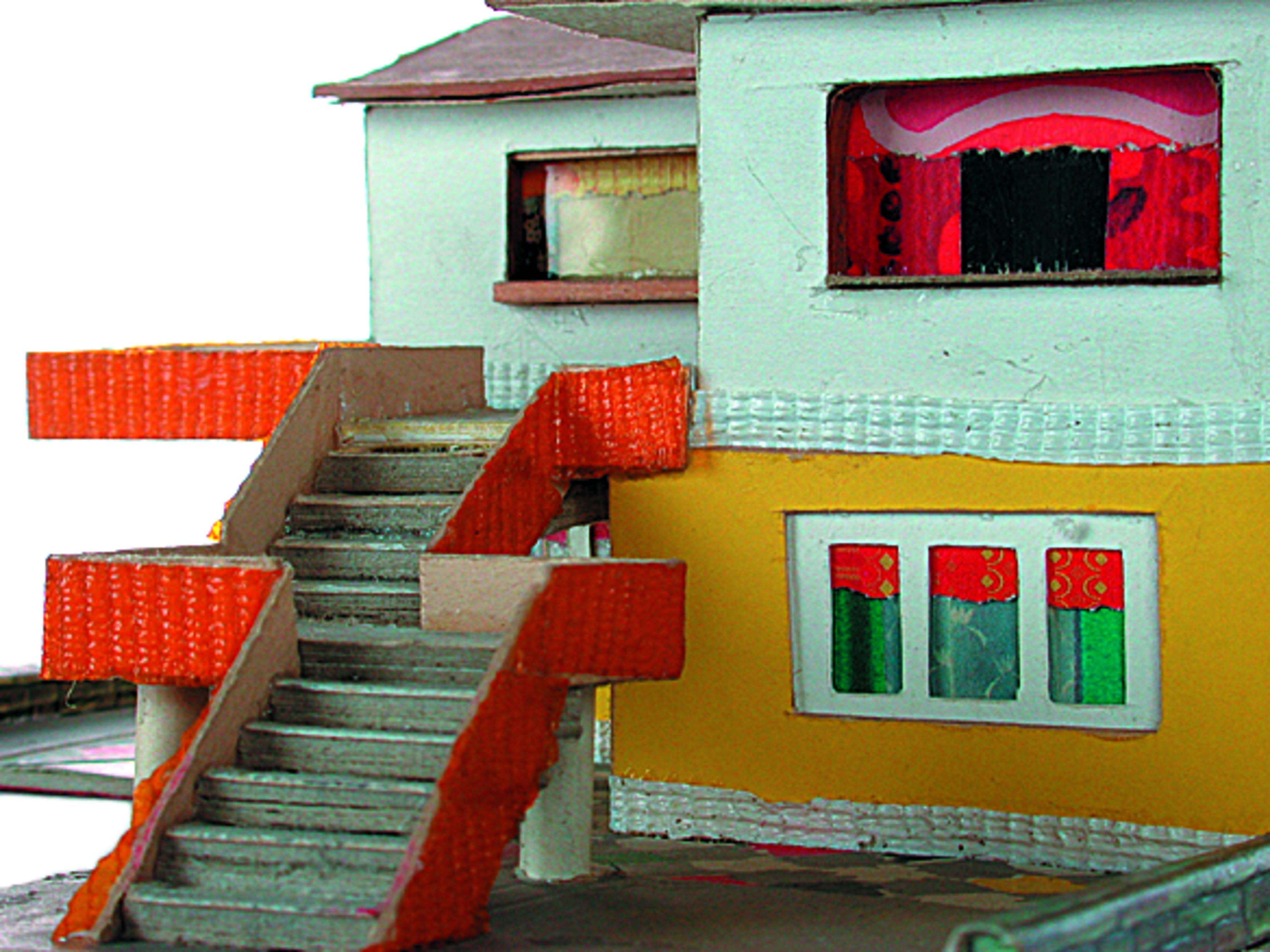 Anmerkung der Redaktion: Nicht von jedem Haus sind alle einzelnen verwendeten Materialien dokumentiert. Tatsächlich verbaute der Bastler auch Zigarettenschachteln, Spinnenpapier, Pappmaschee, Tapetenreste, Bunt- und Silberpapiere, Stoffe, Synthetikfasern, d-c-fix-Folien, Schriftproben, Zeitungsschnipsel und ausgewertete Illustrierte, Kartonagen, Holzabfälle aller Art, Uhu, Holzleim und Tapetenkleister.