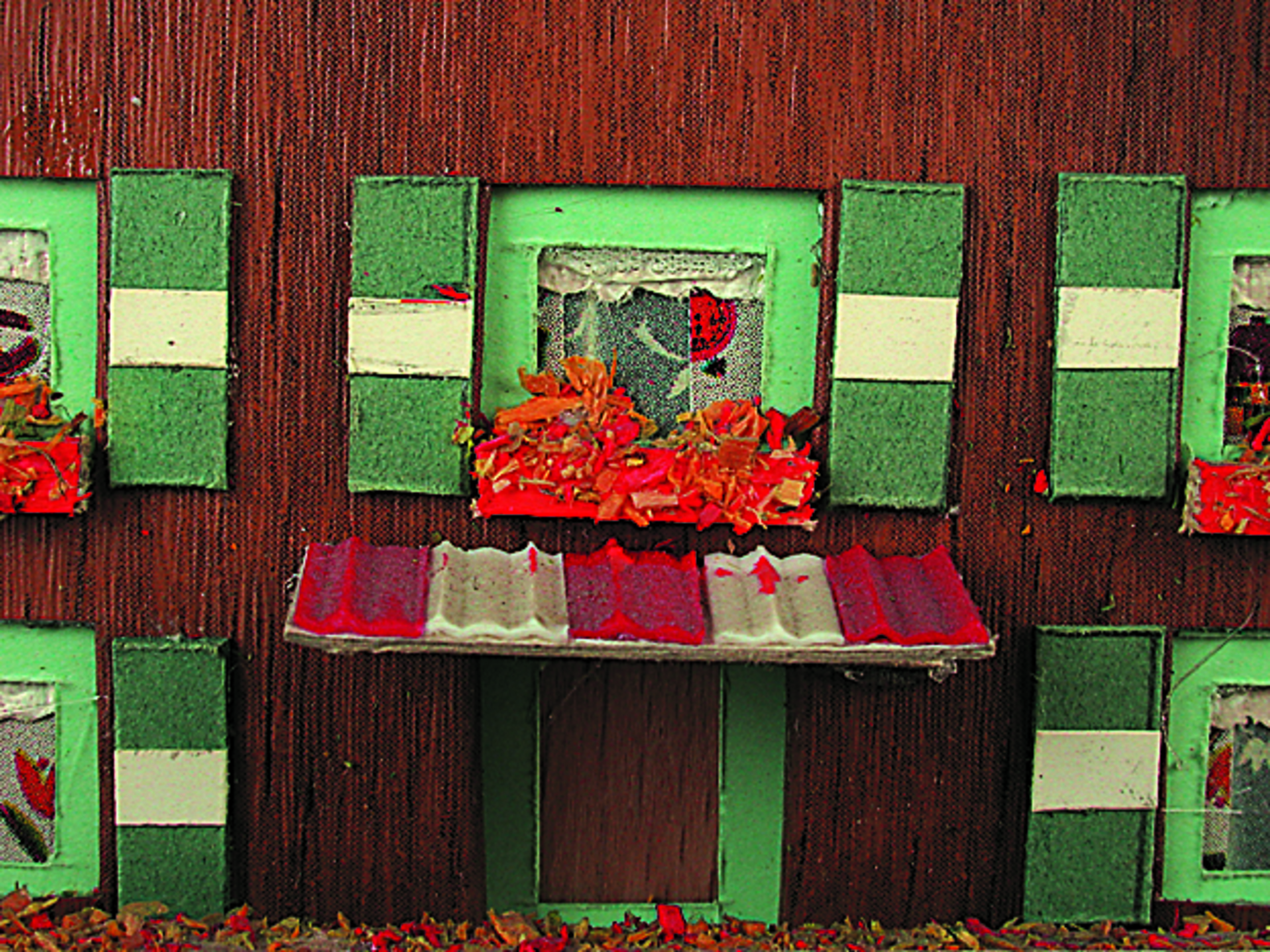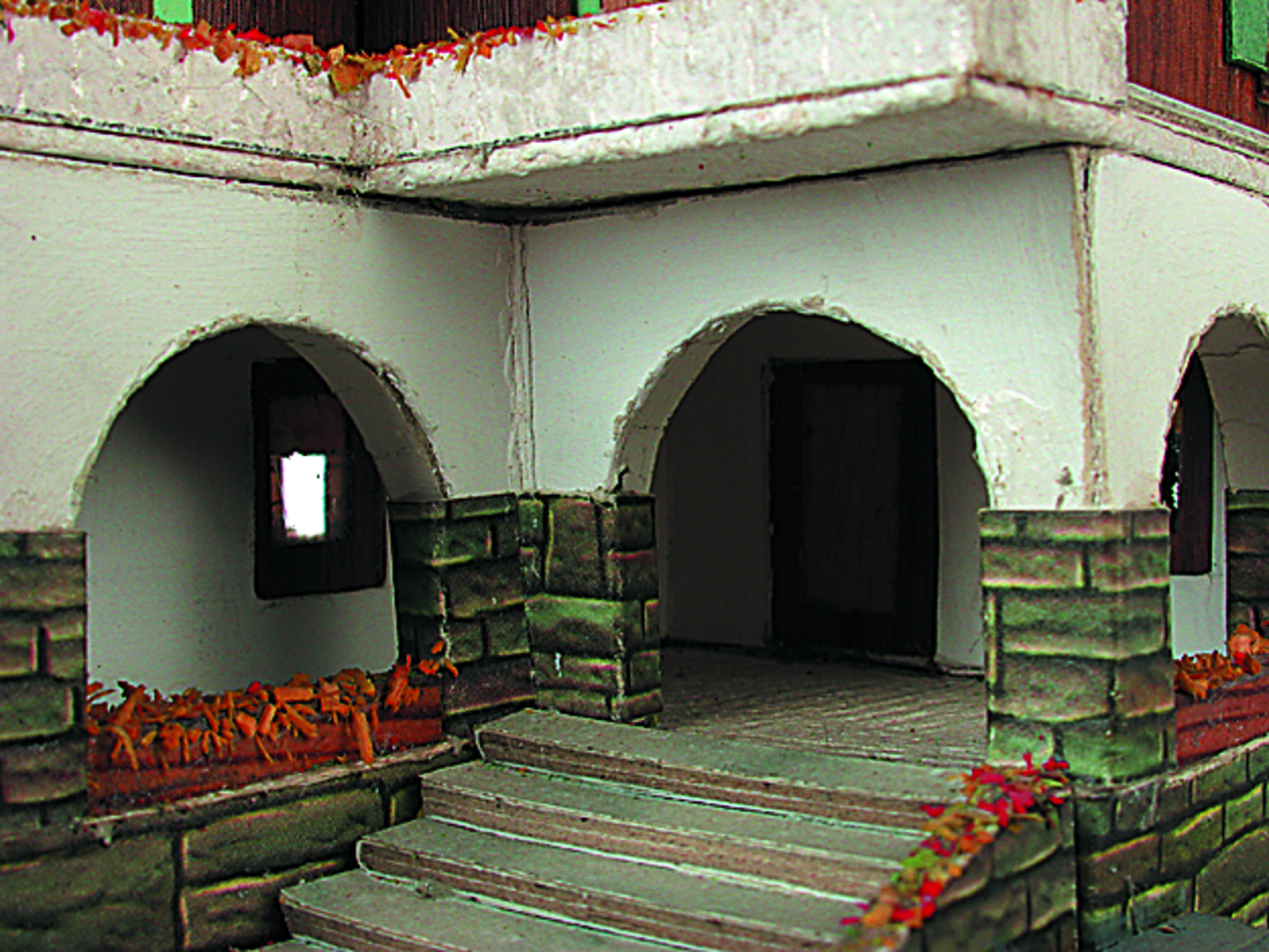 Anmerkung der Redaktion: Nicht von jedem Haus sind alle einzelnen verwendeten Materialien dokumentiert. Tatsächlich verbaute der Bastler auch Zigarettenschachteln, Spinnenpapier, Pappmaschee, Tapetenreste, Bunt- und Silberpapiere, Stoffe, Synthetikfasern, d-c-fix-Folien, Schriftproben, Zeitungsschnipsel und ausgewertete Illustrierte, Kartonagen, Holzabfälle aller Art, Uhu, Holzleim und Tapetenkleister.