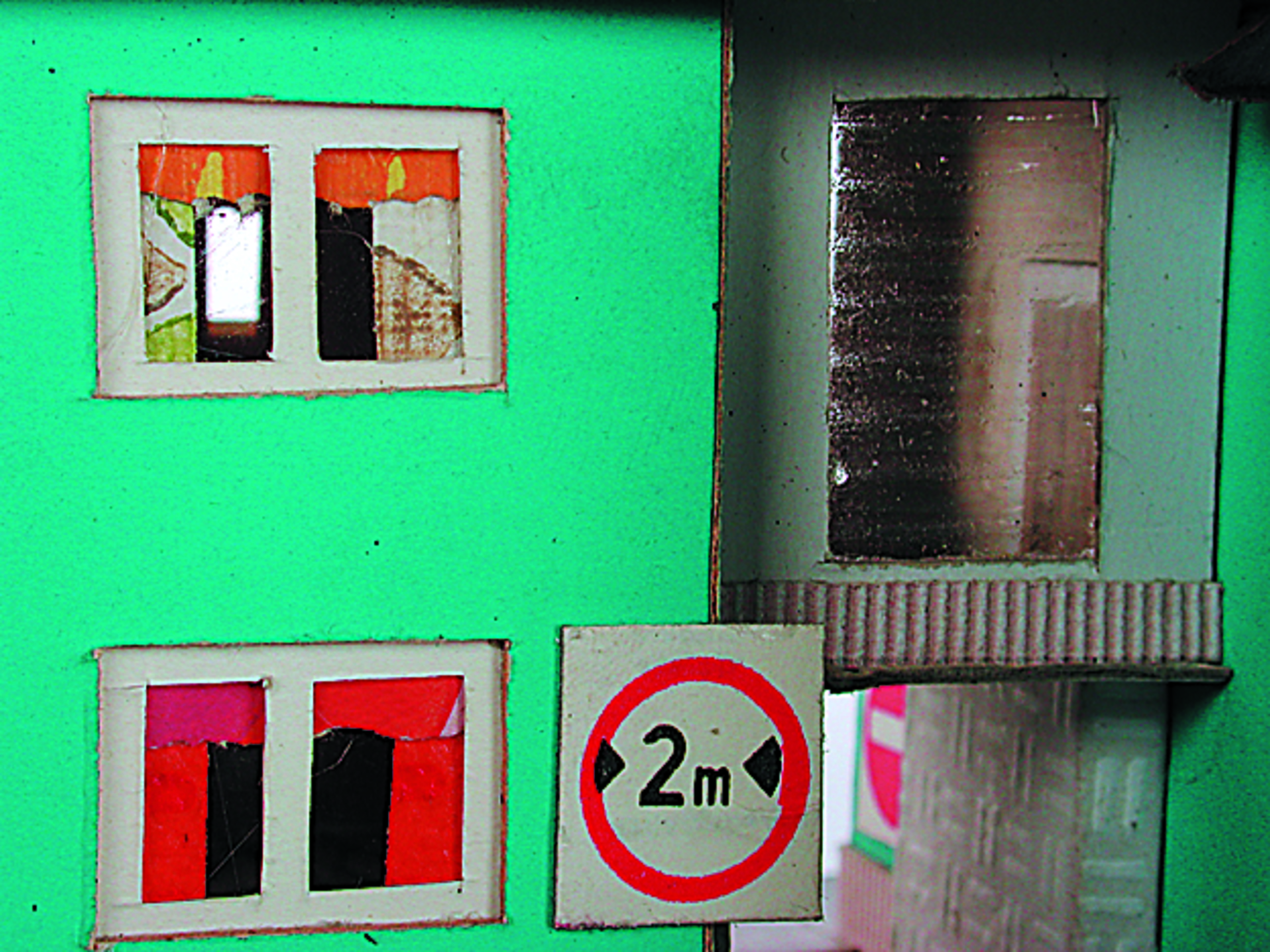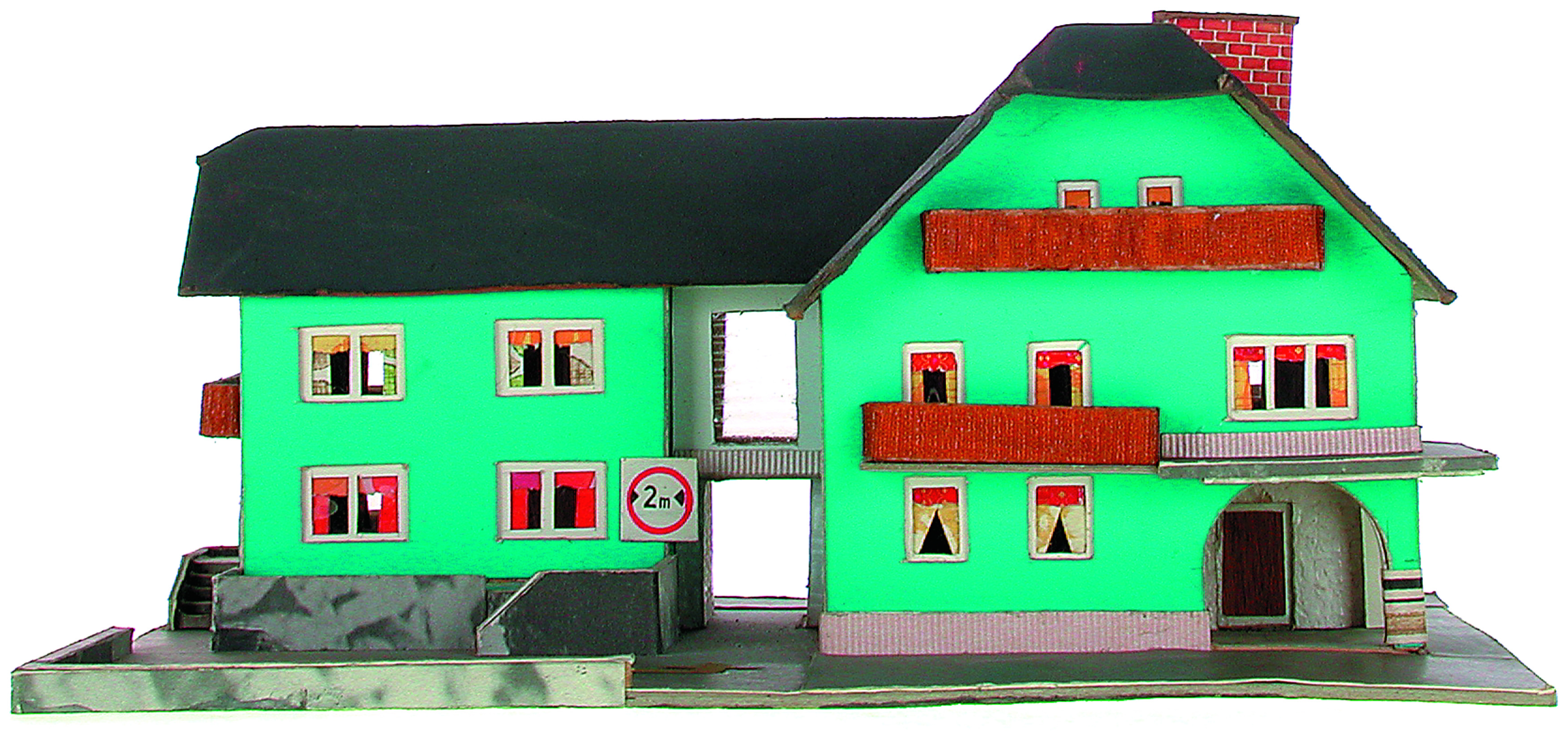 Anmerkung der Redaktion: Nicht von jedem Haus sind alle einzelnen verwendeten Materialien dokumentiert. Tatsächlich verbaute der Bastler auch Zigarettenschachteln, Spinnenpapier, Pappmaschee, Tapetenreste, Bunt- und Silberpapiere, Stoffe, Synthetikfasern, d-c-fix-Folien, Schriftproben, Zeitungsschnipsel und ausgewertete Illustrierte, Kartonagen, Holzabfälle aller Art, Uhu, Holzleim und Tapetenkleister.