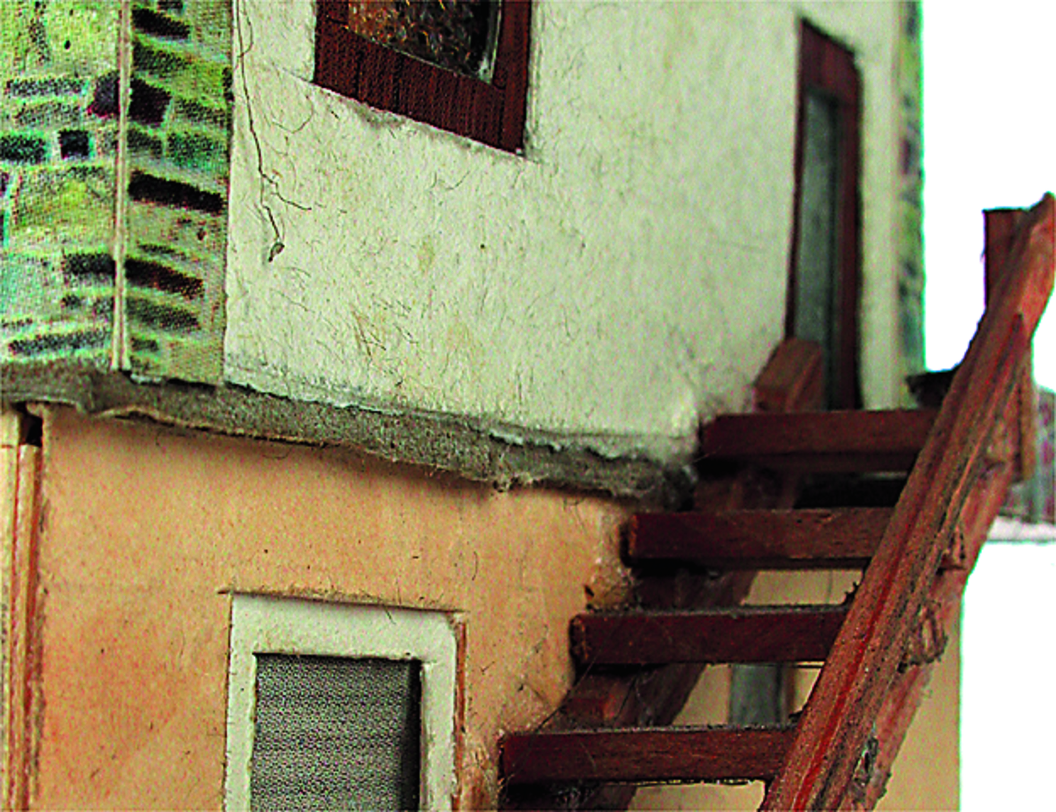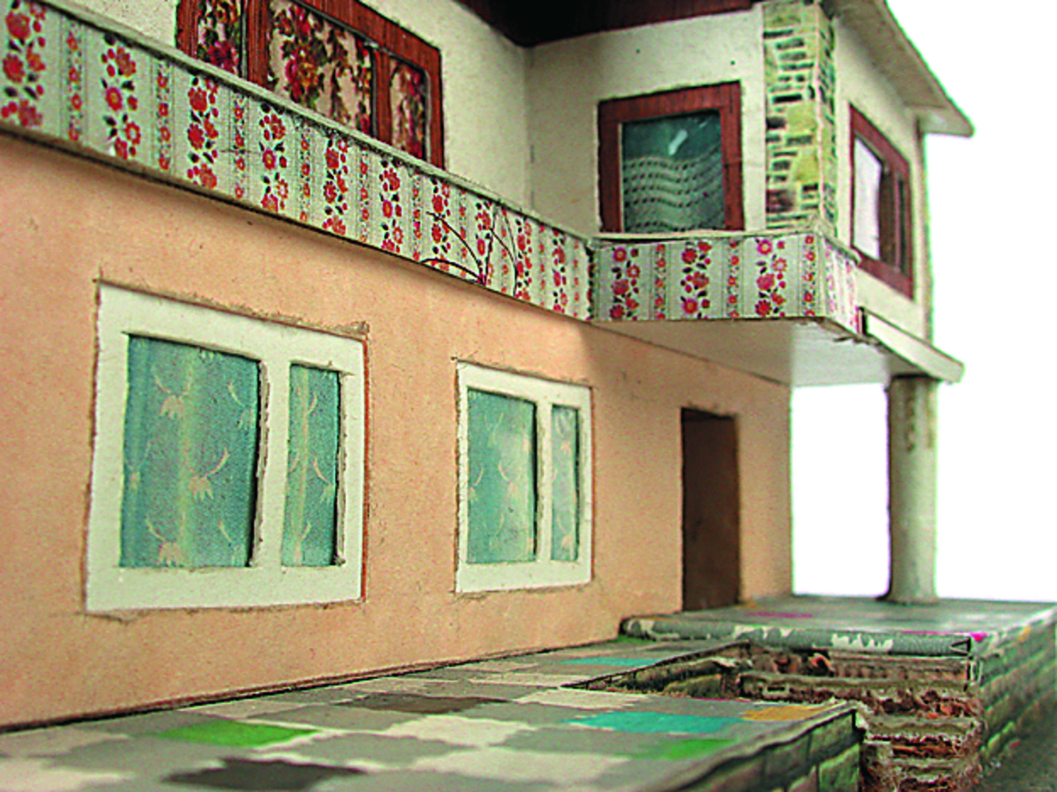 Anmerkung der Redaktion: Nicht von jedem Haus sind alle einzelnen verwendeten Materialien dokumentiert. Tatsächlich verbaute der Bastler auch Zigarettenschachteln, Spinnenpapier, Pappmaschee, Tapetenreste, Bunt- und Silberpapiere, Stoffe, Synthetikfasern, d-c-fix-Folien, Schriftproben, Zeitungsschnipsel und ausgewertete Illustrierte, Kartonagen, Holzabfälle aller Art, Uhu, Holzleim und Tapetenkleister.