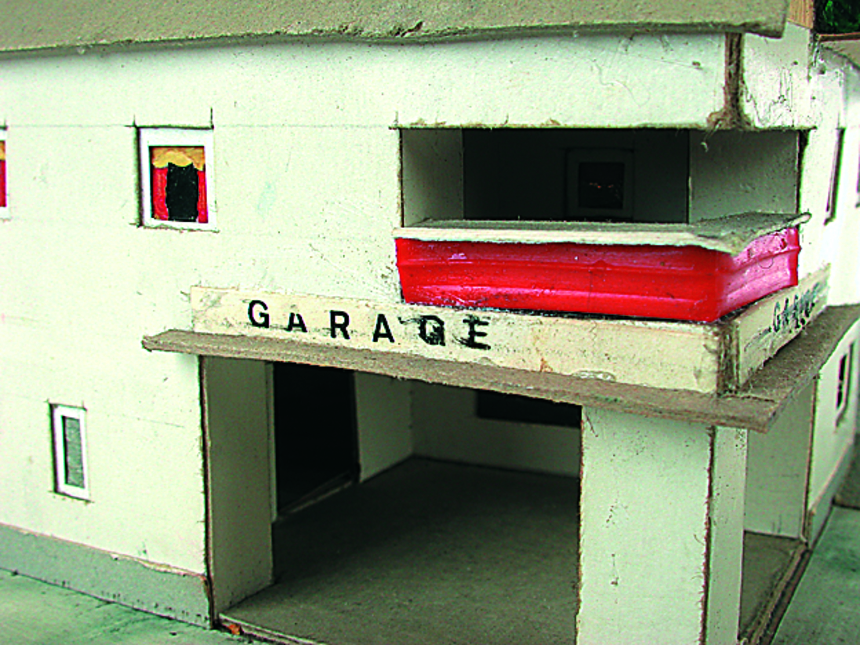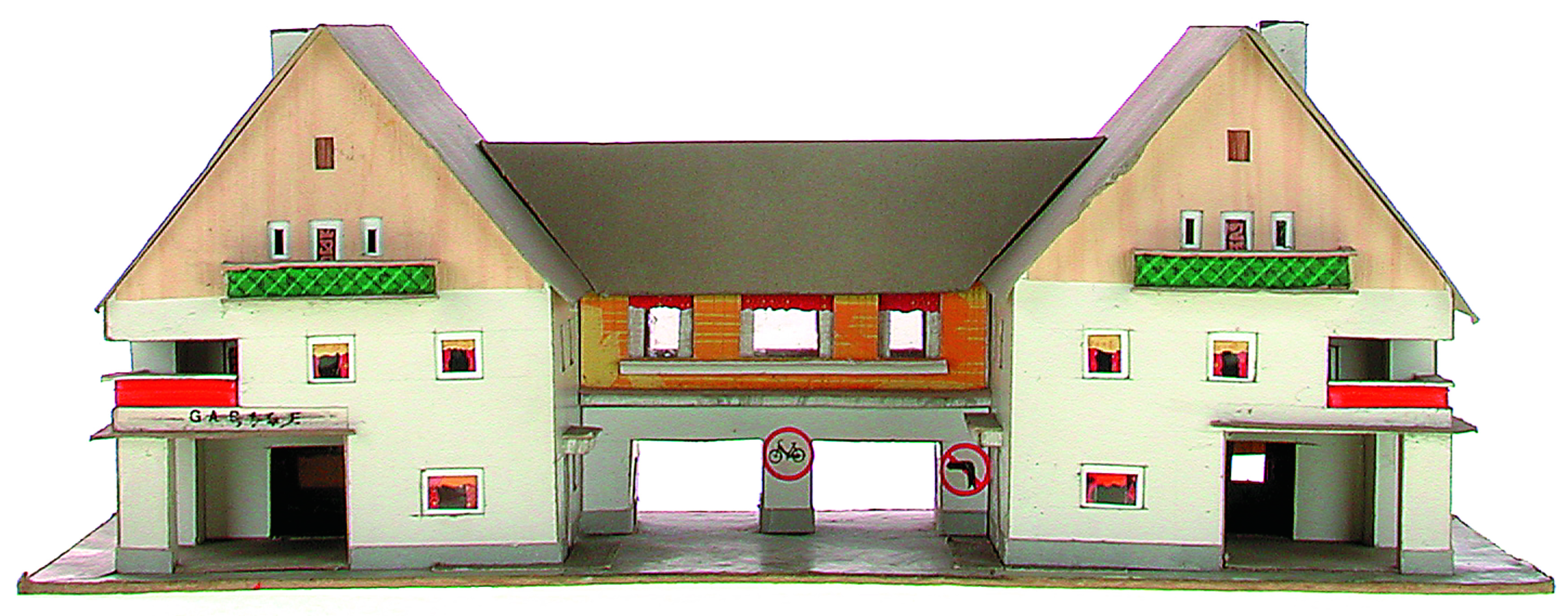 Anmerkung der Redaktion: Nicht von jedem Haus sind alle einzelnen verwendeten Materialien dokumentiert. Tatsächlich verbaute der Bastler auch Zigarettenschachteln, Spinnenpapier, Pappmaschee, Tapetenreste, Bunt- und Silberpapiere, Stoffe, Synthetikfasern, d-c-fix-Folien, Schriftproben, Zeitungsschnipsel und ausgewertete Illustrierte, Kartonagen, Holzabfälle aller Art, Uhu, Holzleim und Tapetenkleister.