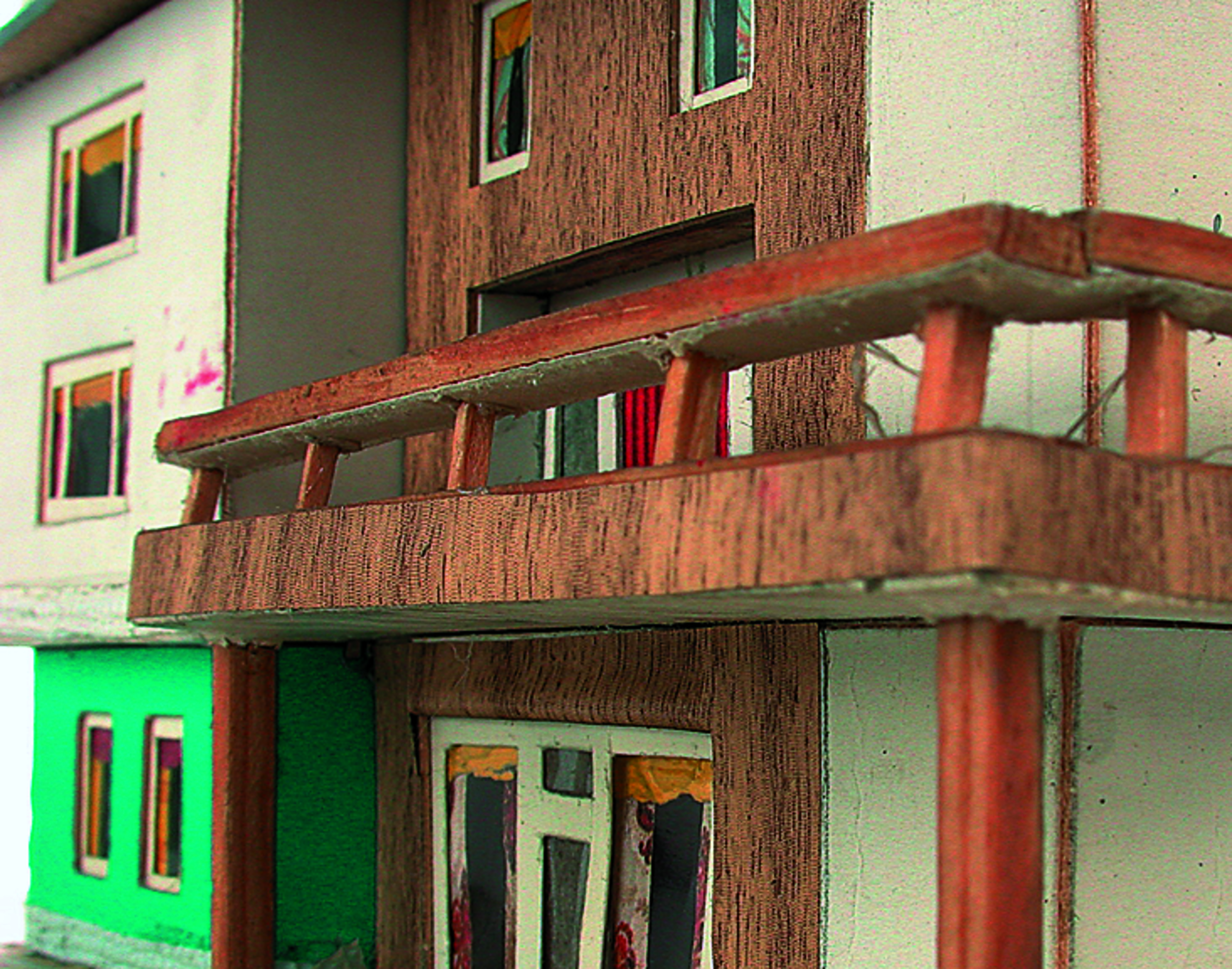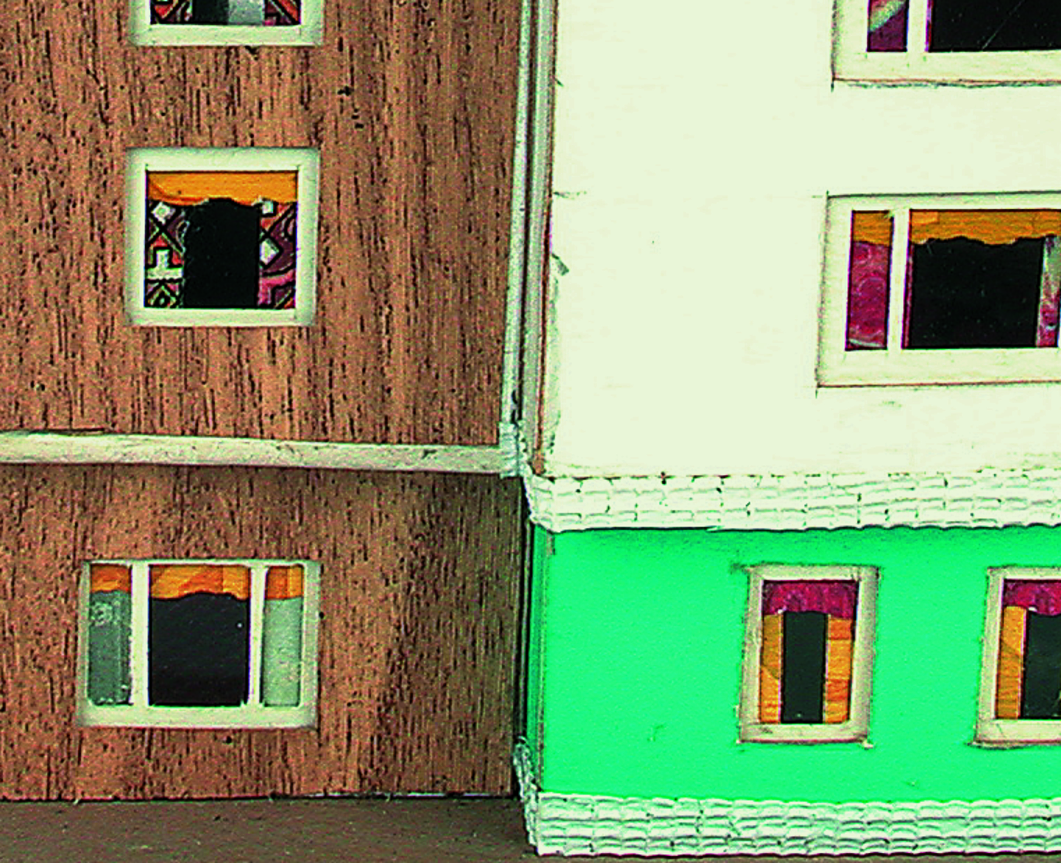 Anmerkung der Redaktion: Nicht von jedem Haus sind alle einzelnen verwendeten Materialien dokumentiert. Tatsächlich verbaute der Bastler auch Zigarettenschachteln, Spinnenpapier, Pappmaschee, Tapetenreste, Bunt- und Silberpapiere, Stoffe, Synthetikfasern, d-c-fix-Folien, Schriftproben, Zeitungsschnipsel und ausgewertete Illustrierte, Kartonagen, Holzabfälle aller Art, Uhu, Holzleim und Tapetenkleister.