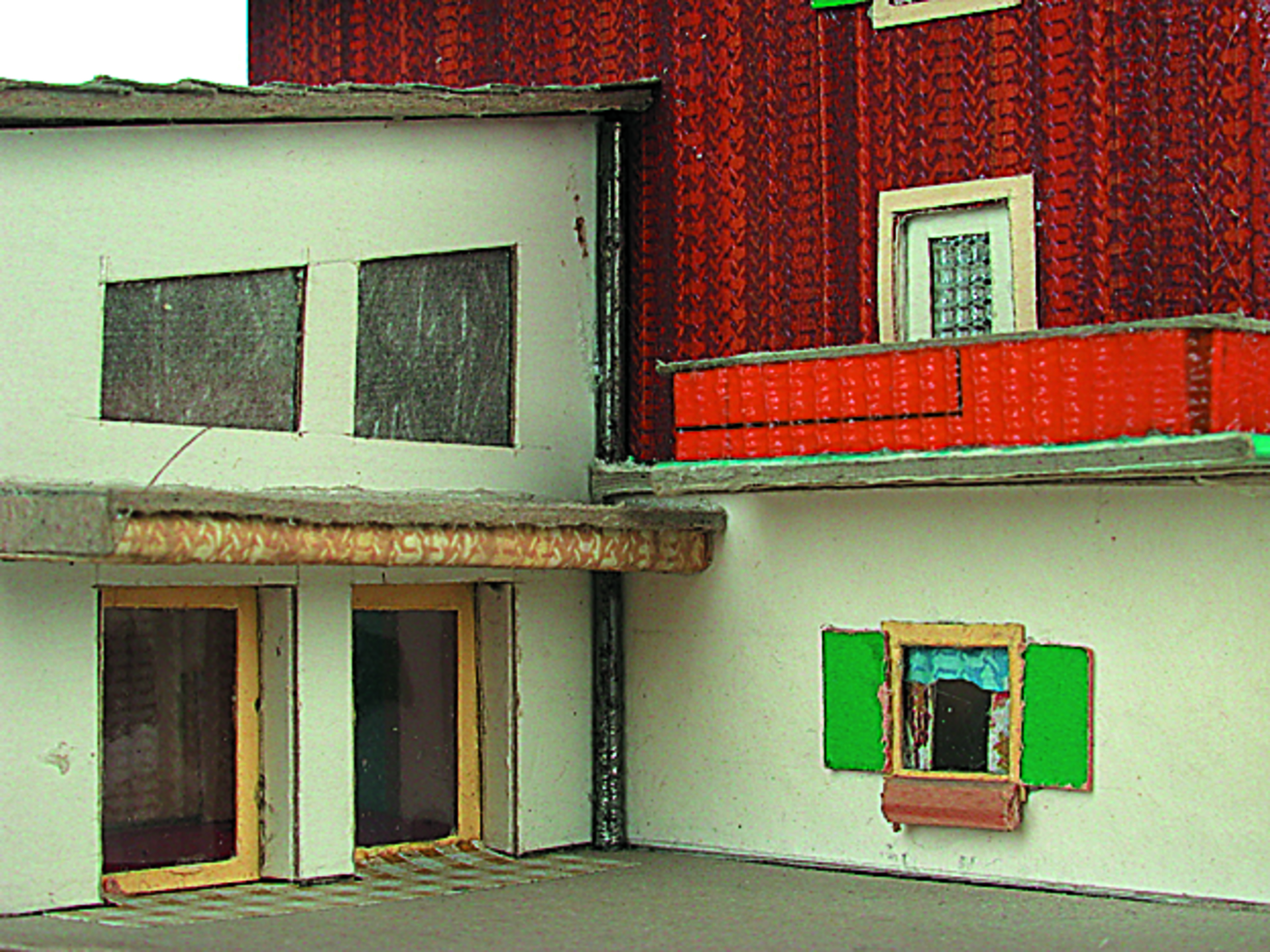 Anmerkung der Redaktion: Nicht von jedem Haus sind alle einzelnen verwendeten Materialien dokumentiert. Tatsächlich verbaute der Bastler auch Zigarettenschachteln, Spinnenpapier, Pappmaschee, Tapetenreste, Bunt- und Silberpapiere, Stoffe, Synthetikfasern, d-c-fix-Folien, Schriftproben, Zeitungsschnipsel und ausgewertete Illustrierte, Kartonagen, Holzabfälle aller Art, Uhu, Holzleim und Tapetenkleister.