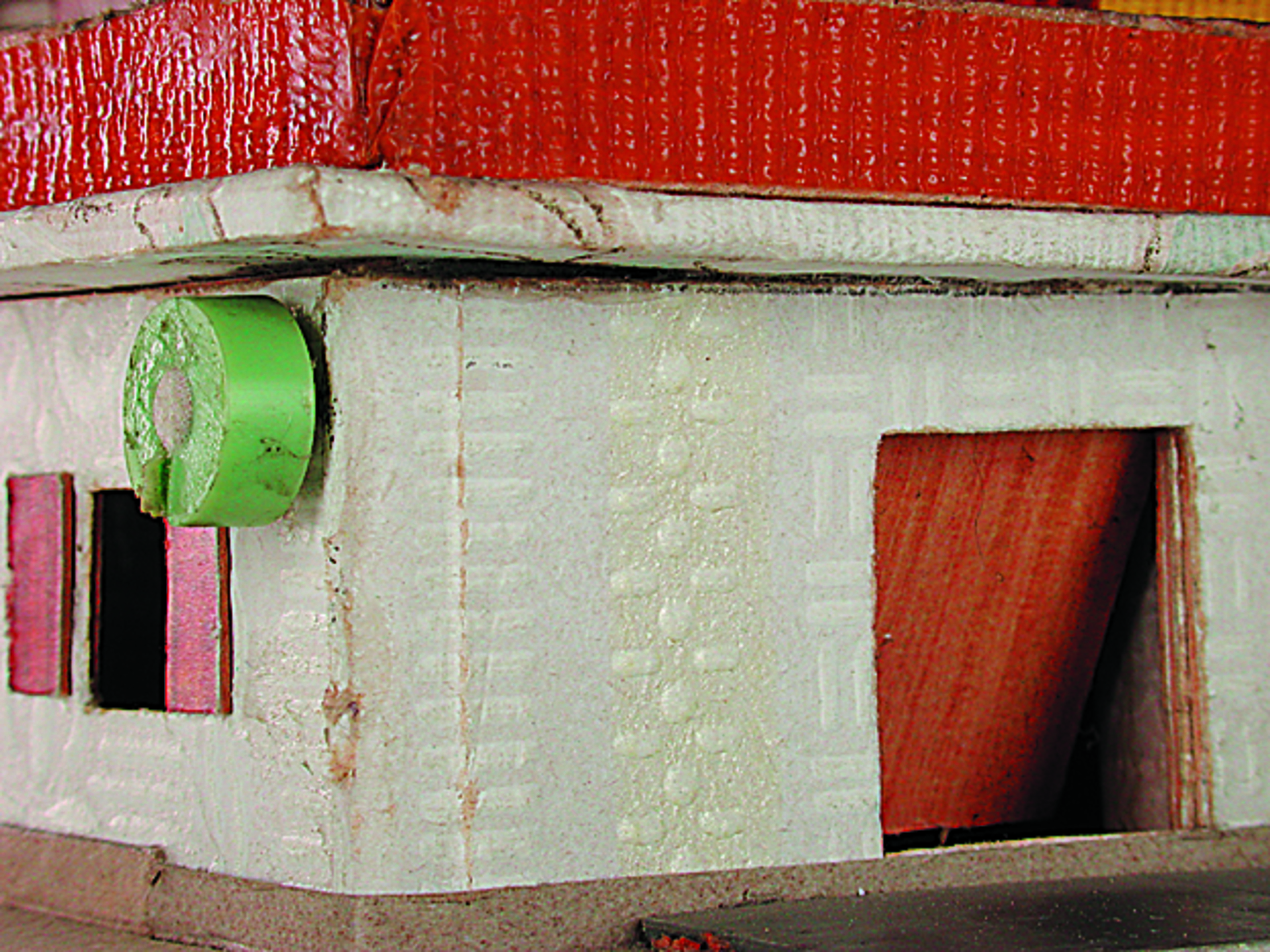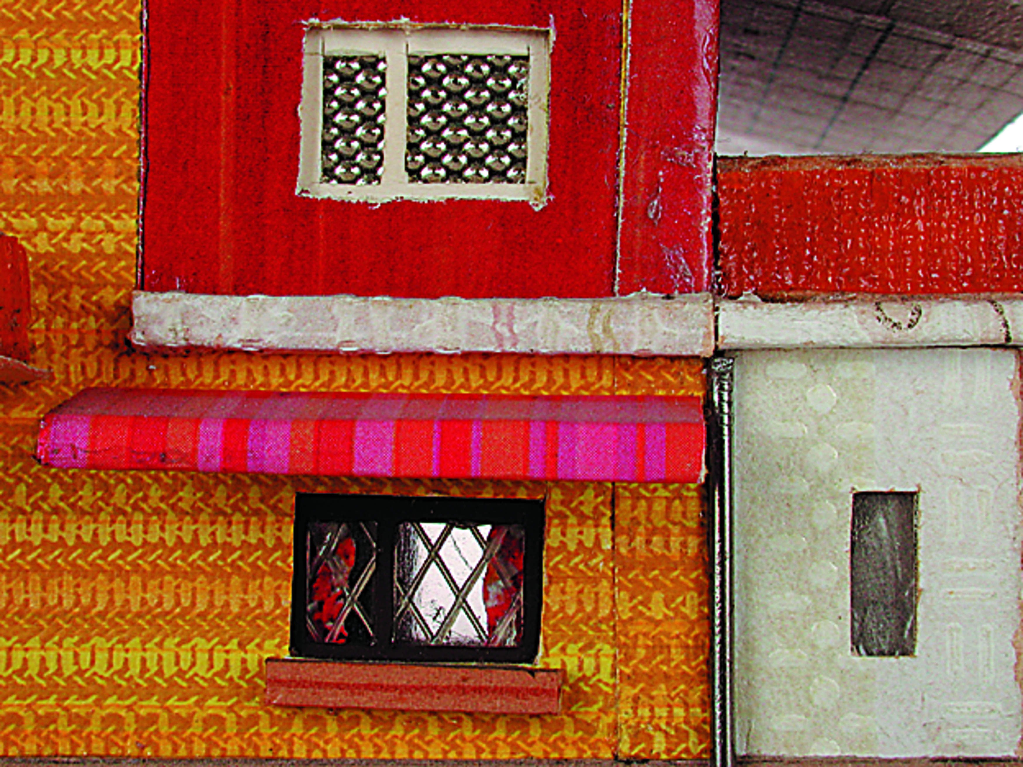 Anmerkung der Redaktion: Nicht von jedem Haus sind alle einzelnen verwendeten Materialien dokumentiert. Tatsächlich verbaute der Bastler auch Zigarettenschachteln, Spinnenpapier, Pappmaschee, Tapetenreste, Bunt- und Silberpapiere, Stoffe, Synthetikfasern, d-c-fix-Folien, Schriftproben, Zeitungsschnipsel und ausgewertete Illustrierte, Kartonagen, Holzabfälle aller Art, Uhu, Holzleim und Tapetenkleister.