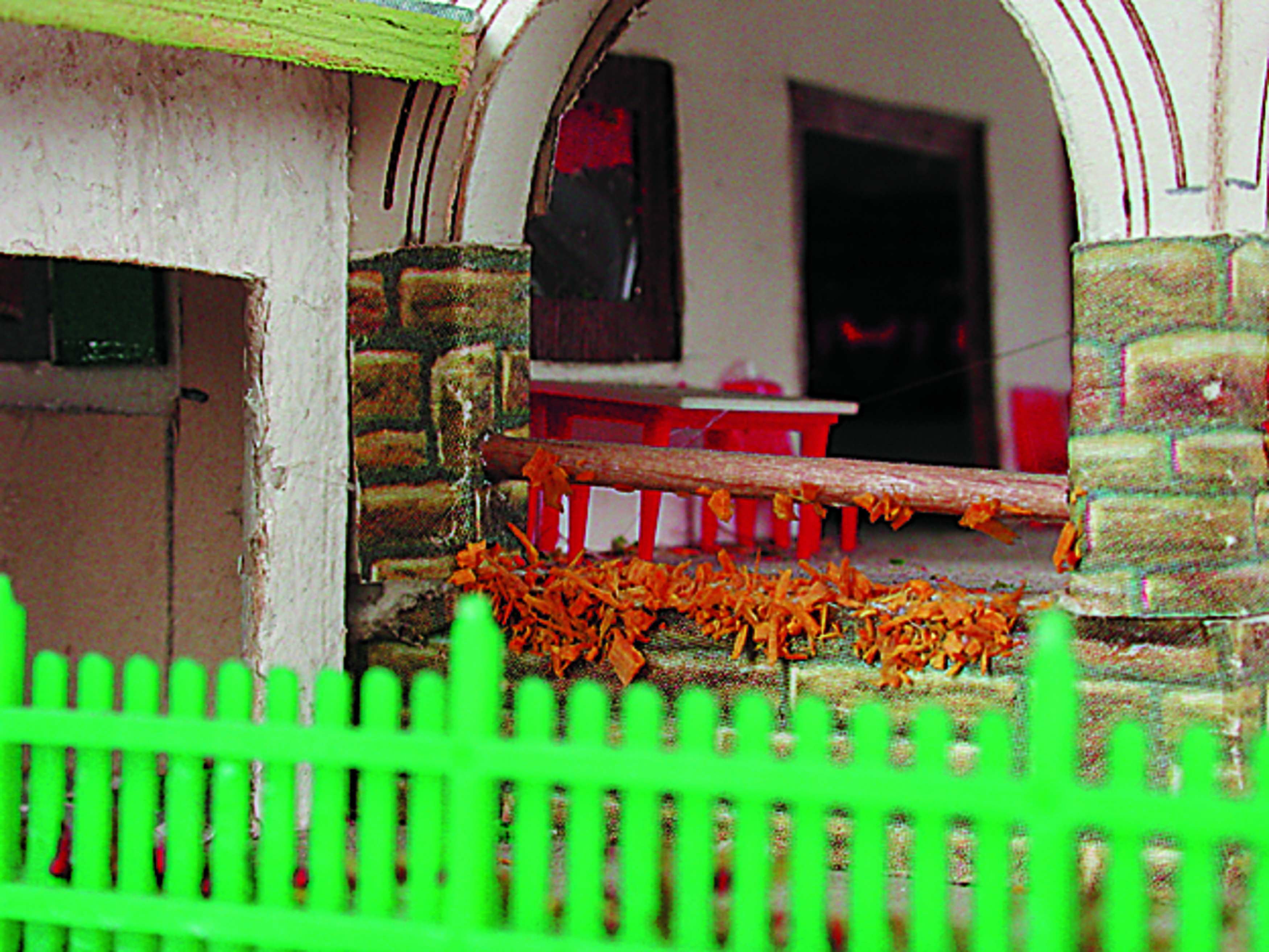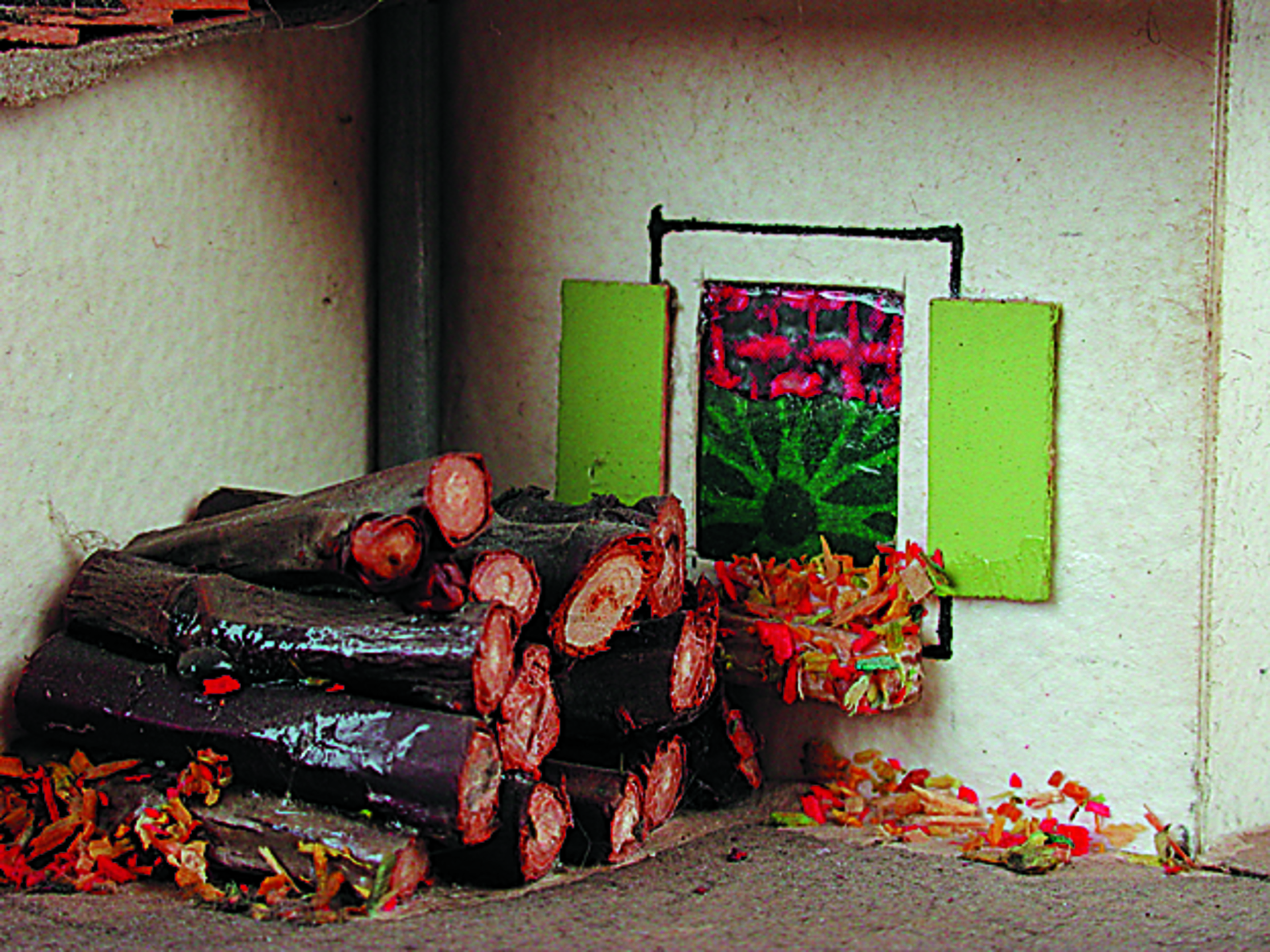 Anmerkung der Redaktion: Nicht von jedem Haus sind alle einzelnen verwendeten Materialien dokumentiert. Tatsächlich verbaute der Bastler auch Zigarettenschachteln, Spinnenpapier, Pappmaschee, Tapetenreste, Bunt- und Silberpapiere, Stoffe, Synthetikfasern, d-c-fix-Folien, Schriftproben, Zeitungsschnipsel und ausgewertete Illustrierte, Kartonagen, Holzabfälle aller Art, Uhu, Holzleim und Tapetenkleister.