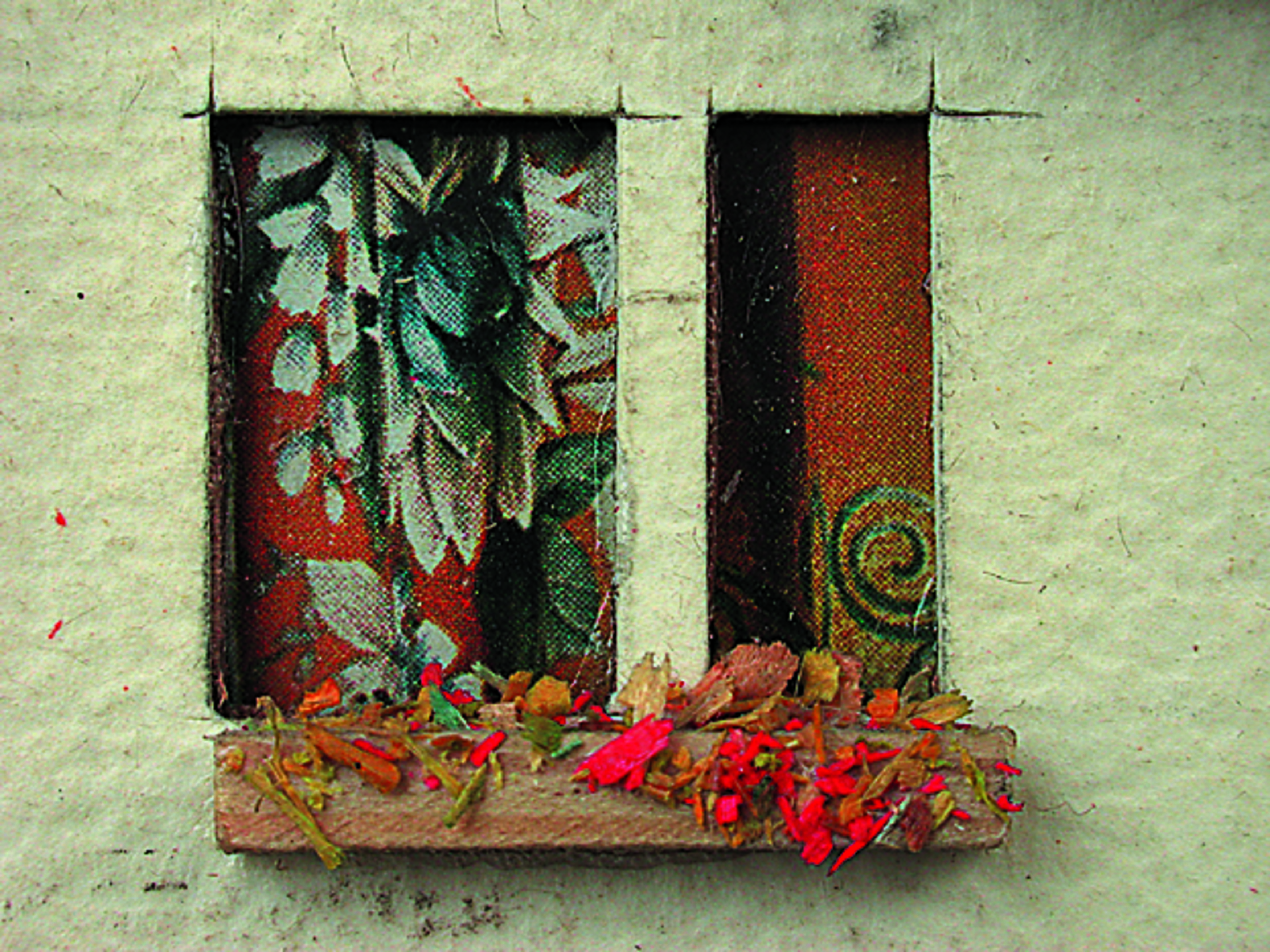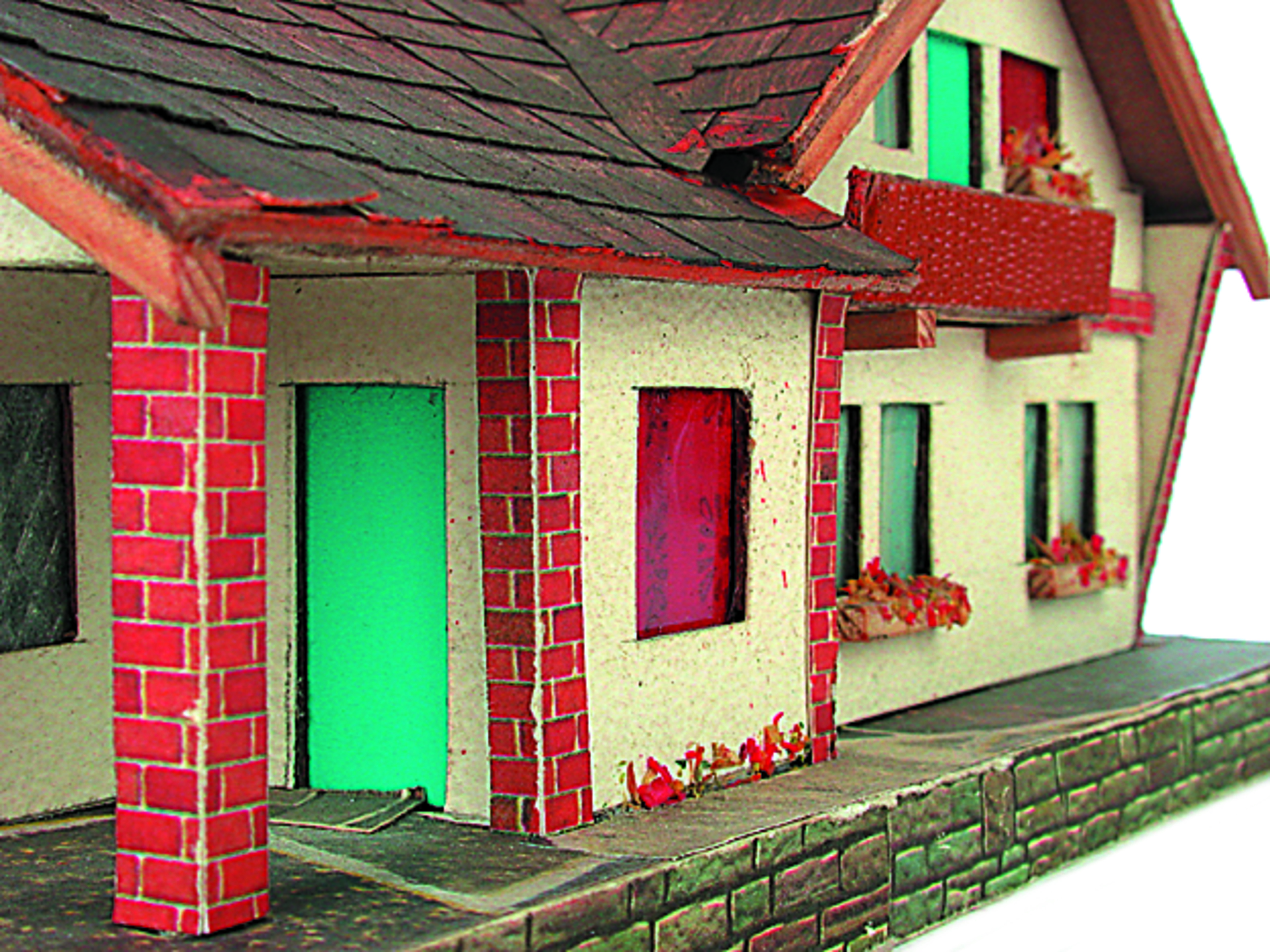 Anmerkung der Redaktion: Nicht von jedem Haus sind alle einzelnen verwendeten Materialien dokumentiert. Tatsächlich verbaute der Bastler auch Zigarettenschachteln, Spinnenpapier, Pappmaschee, Tapetenreste, Bunt- und Silberpapiere, Stoffe, Synthetikfasern, d-c-fix-Folien, Schriftproben, Zeitungsschnipsel und ausgewertete Illustrierte, Kartonagen, Holzabfälle aller Art, Uhu, Holzleim und Tapetenkleister.