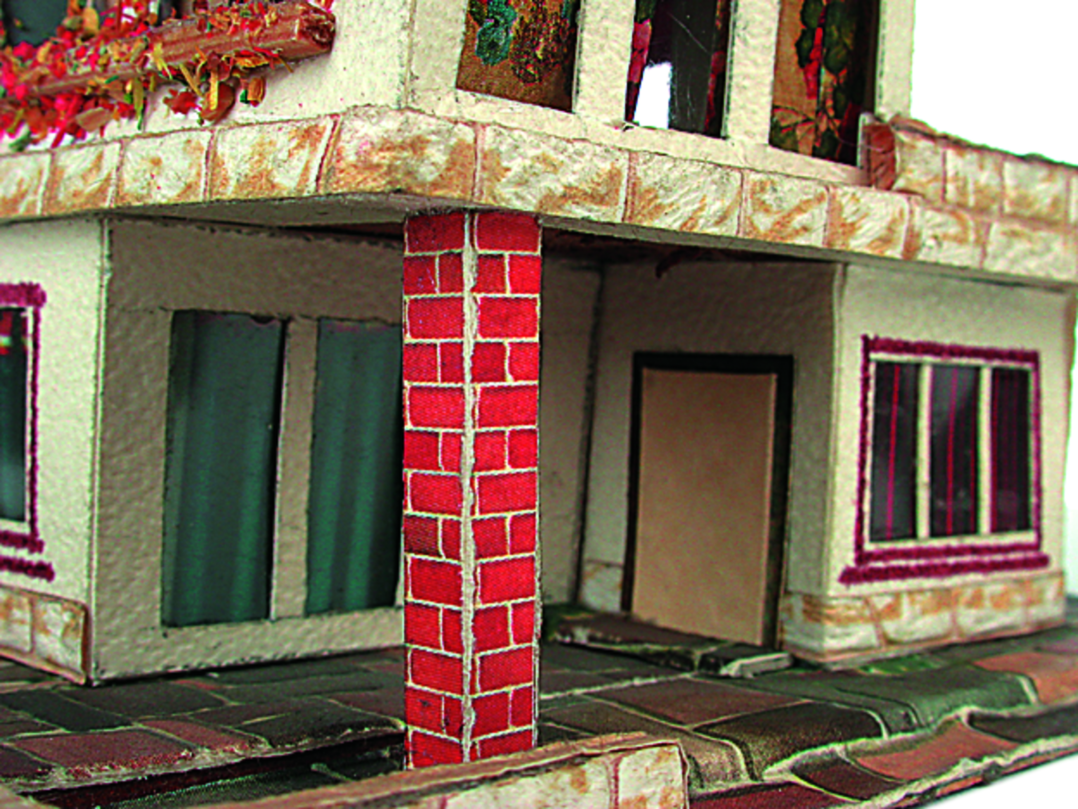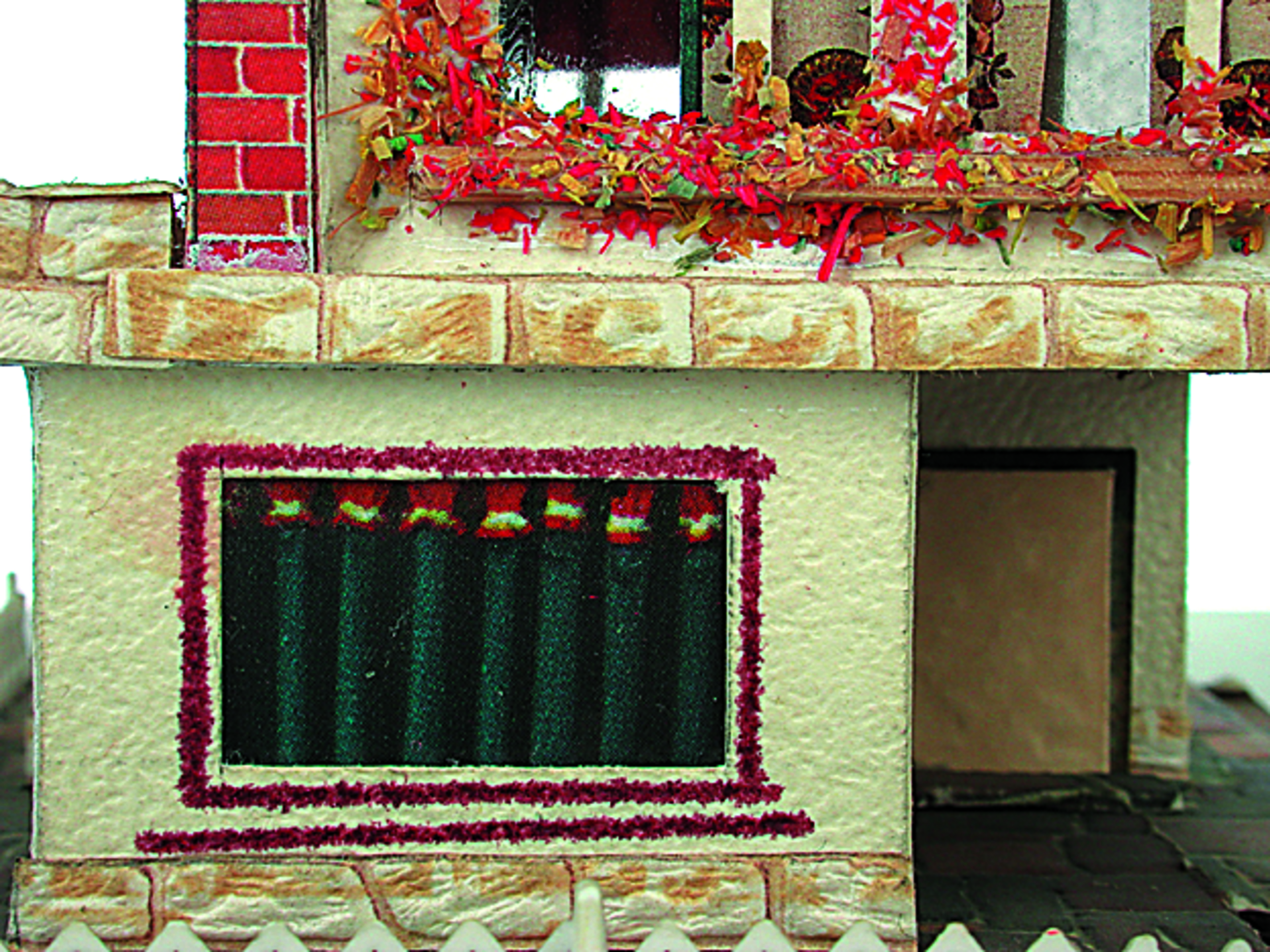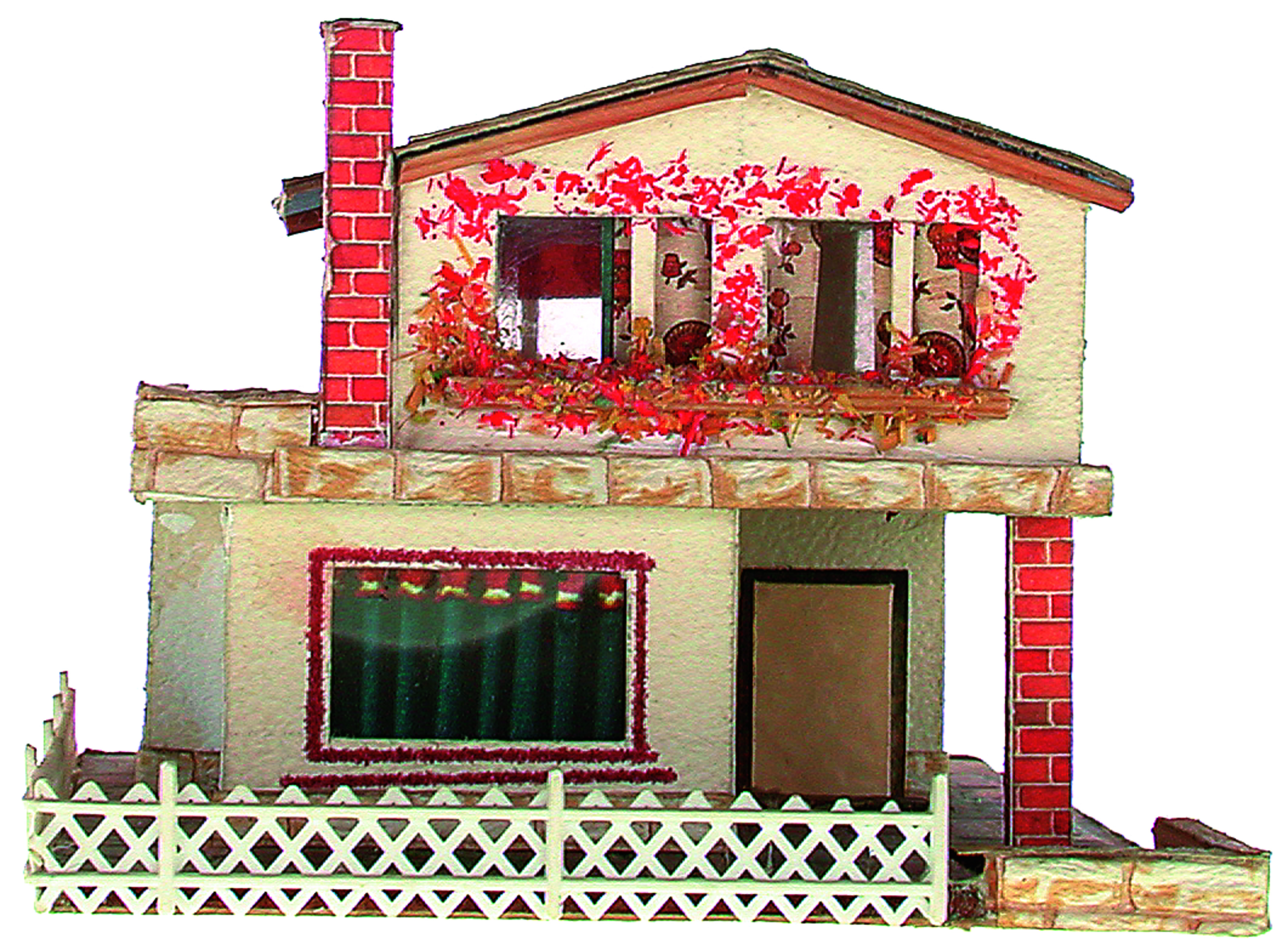 Anmerkung der Redaktion: Nicht von jedem Haus sind alle einzelnen verwendeten Materialien dokumentiert. Tatsächlich verbaute der Bastler auch Zigarettenschachteln, Spinnenpapier, Pappmaschee, Tapetenreste, Bunt- und Silberpapiere, Stoffe, Synthetikfasern, d-c-fix-Folien, Schriftproben, Zeitungsschnipsel und ausgewertete Illustrierte, Kartonagen, Holzabfälle aller Art, Uhu, Holzleim und Tapetenkleister.
