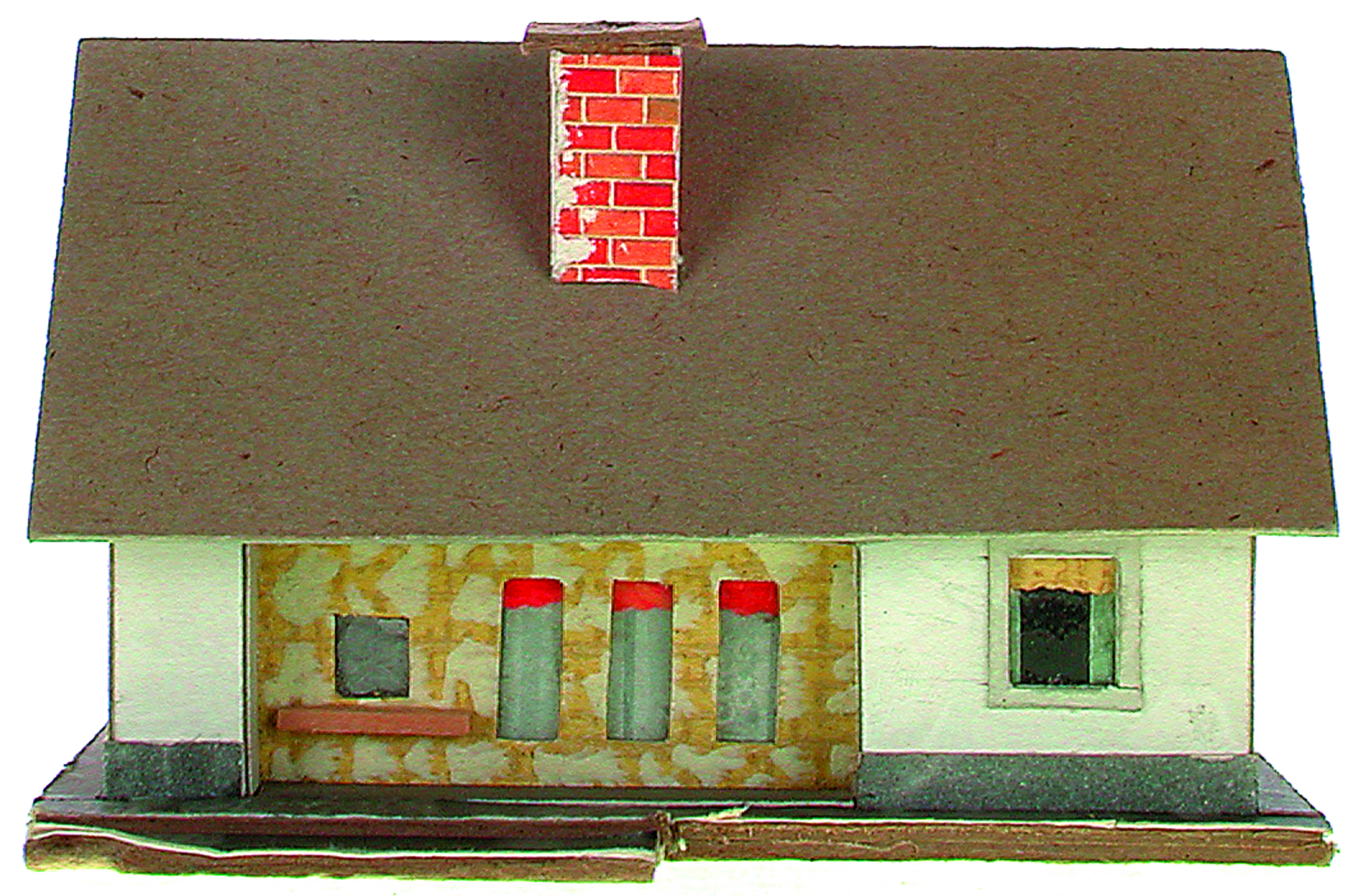 Anmerkung der Redaktion: Nicht von jedem Haus sind alle einzelnen verwendeten Materialien dokumentiert. Tatsächlich verbaute der Bastler auch Zigarettenschachteln, Spinnenpapier, Pappmaschee, Tapetenreste, Bunt- und Silberpapiere, Stoffe, Synthetikfasern, d-c-fix-Folien, Schriftproben, Zeitungsschnipsel und ausgewertete Illustrierte, Kartonagen, Holzabfälle aller Art, Uhu, Holzleim und Tapetenkleister.