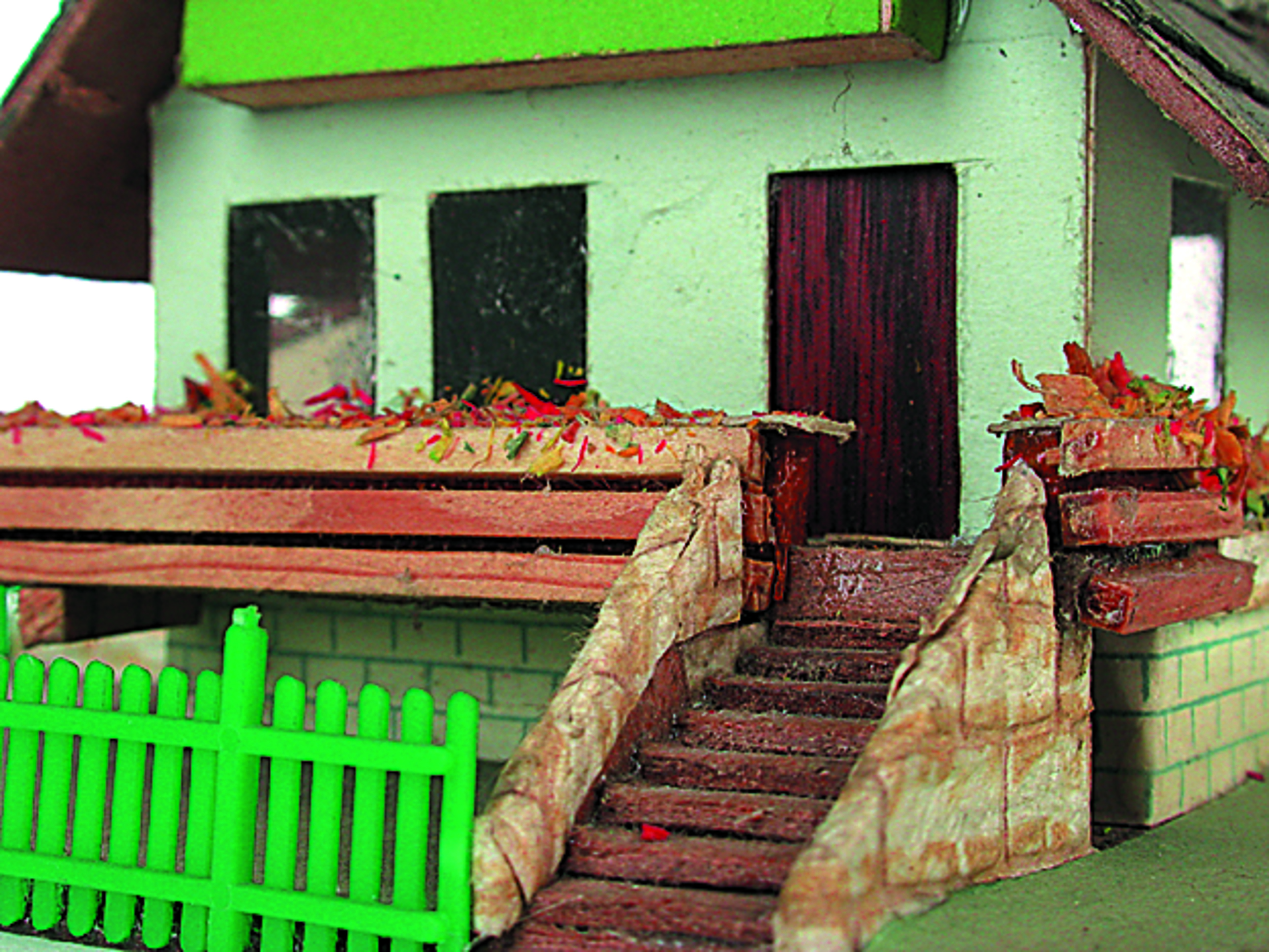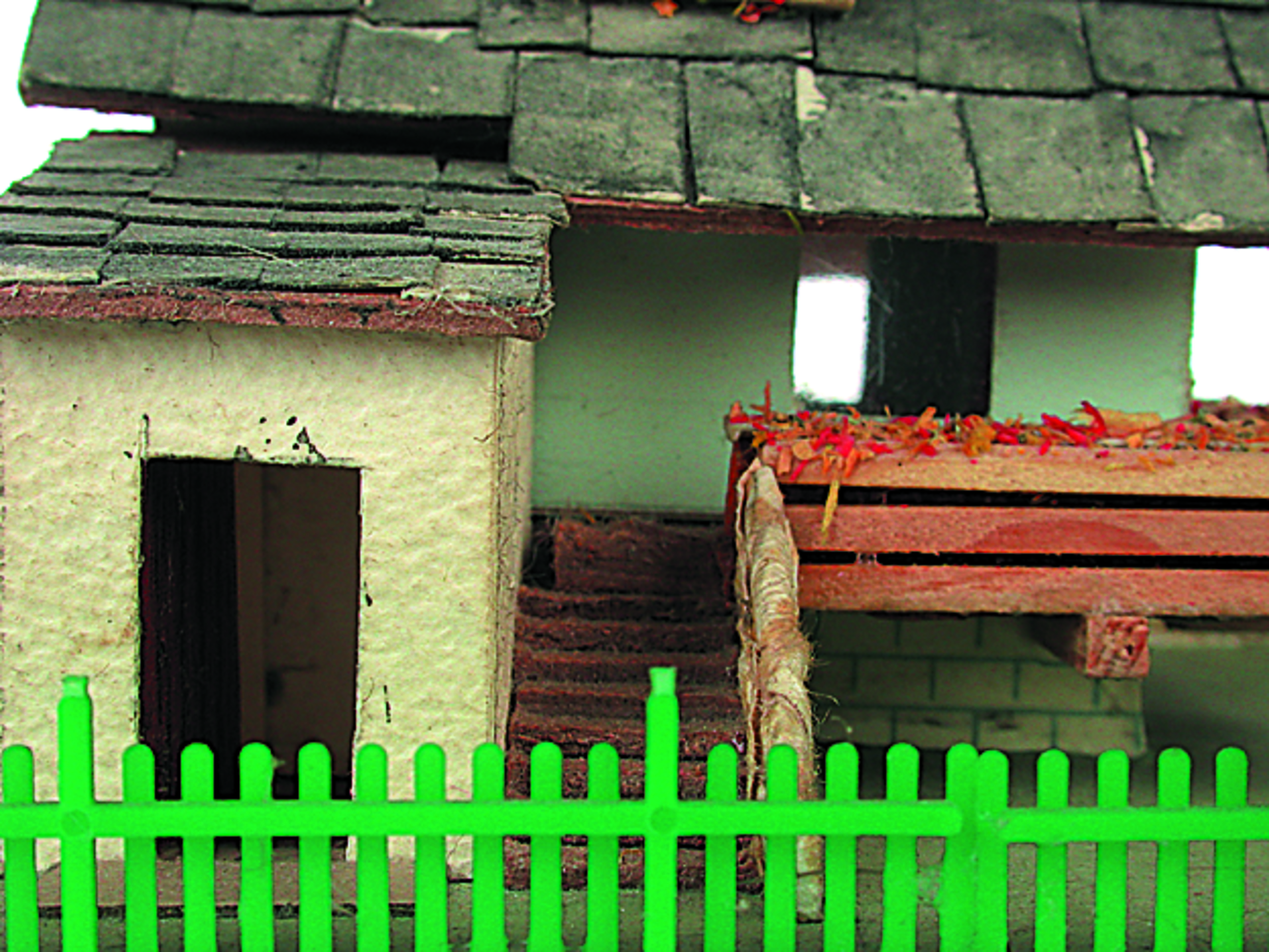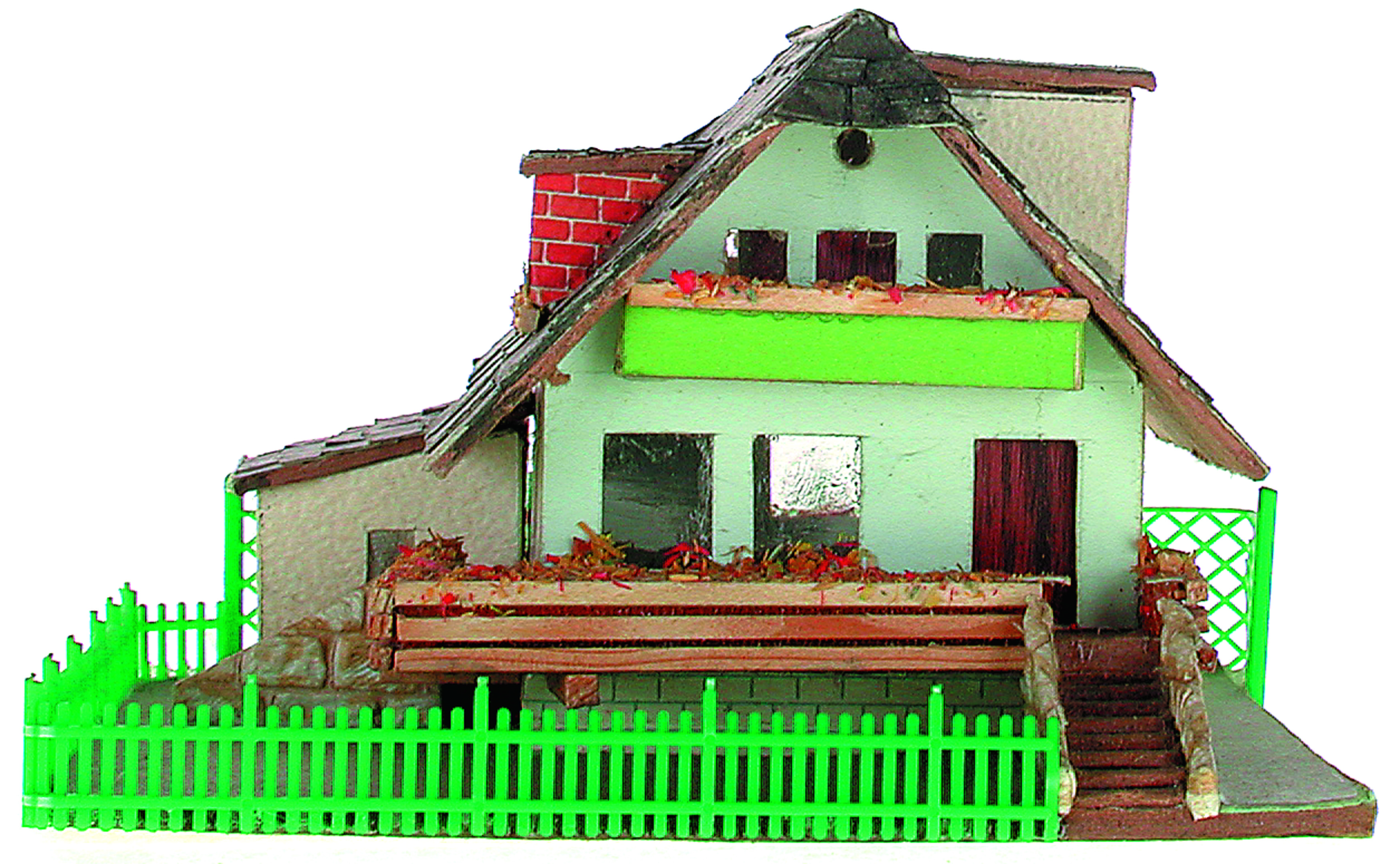 Anmerkung der Redaktion: Nicht von jedem Haus sind alle einzelnen verwendeten Materialien dokumentiert. Tatsächlich verbaute der Bastler auch Zigarettenschachteln, Spinnenpapier, Pappmaschee, Tapetenreste, Bunt- und Silberpapiere, Stoffe, Synthetikfasern, d-c-fix-Folien, Schriftproben, Zeitungsschnipsel und ausgewertete Illustrierte, Kartonagen, Holzabfälle aller Art, Uhu, Holzleim und Tapetenkleister.