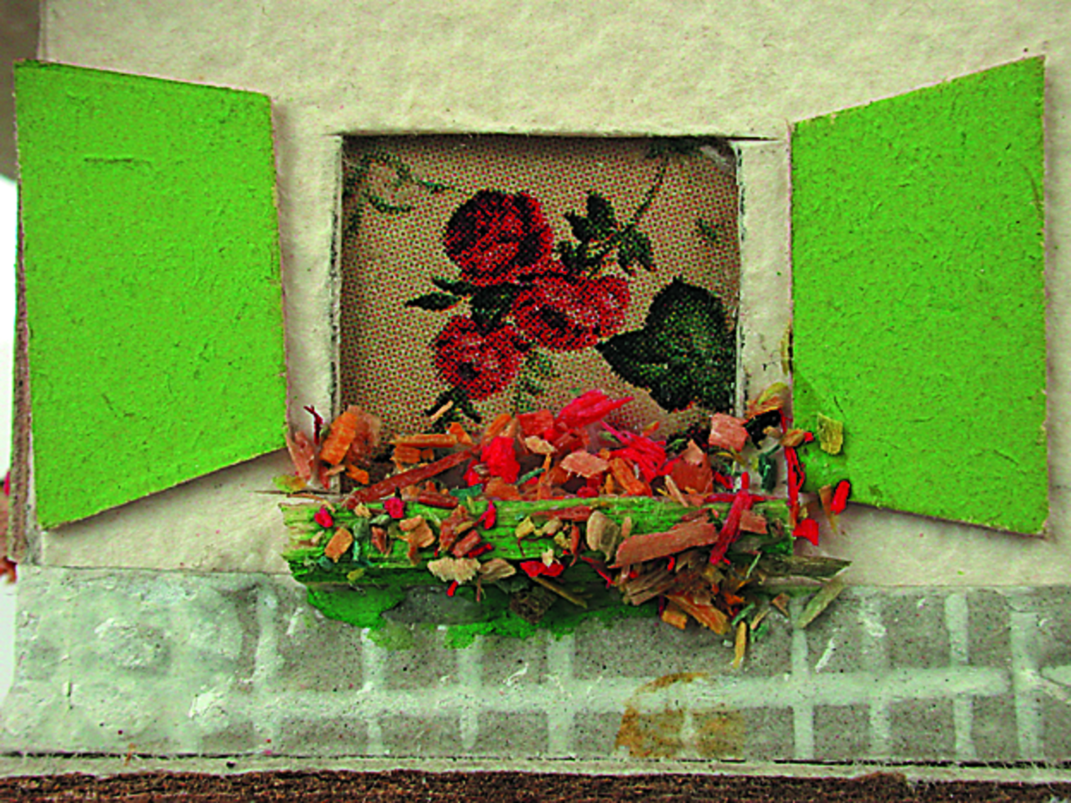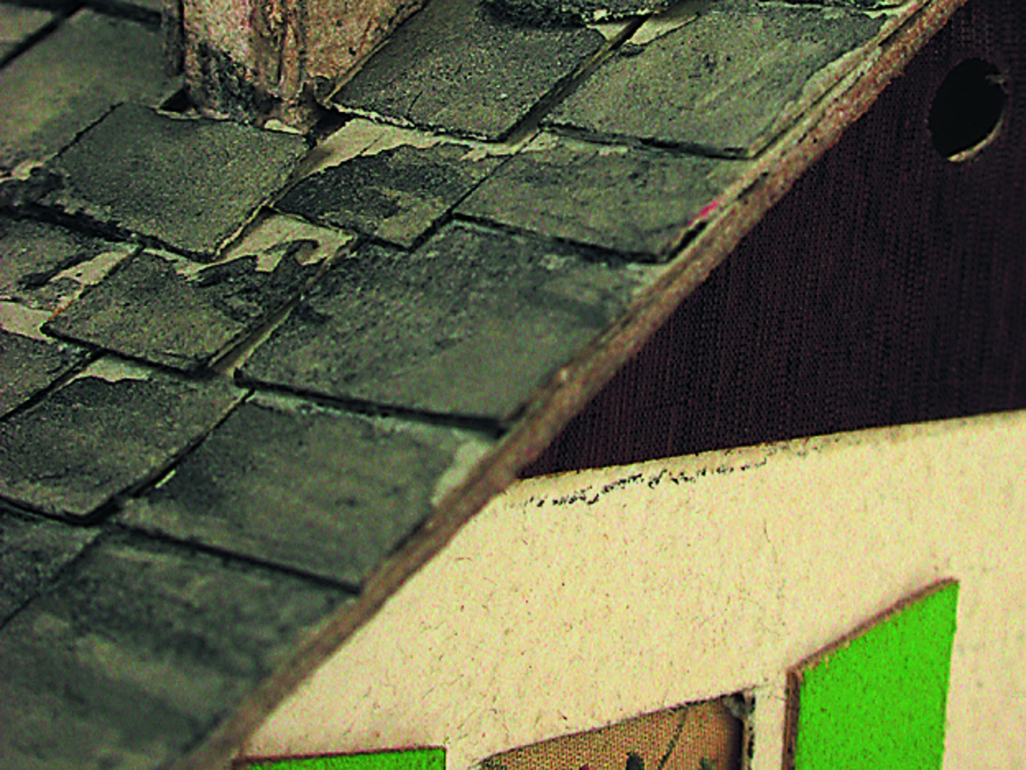 Anmerkung der Redaktion: Nicht von jedem Haus sind alle einzelnen verwendeten Materialien dokumentiert. Tatsächlich verbaute der Bastler auch Zigarettenschachteln, Spinnenpapier, Pappmaschee, Tapetenreste, Bunt- und Silberpapiere, Stoffe, Synthetikfasern, d-c-fix-Folien, Schriftproben, Zeitungsschnipsel und ausgewertete Illustrierte, Kartonagen, Holzabfälle aller Art, Uhu, Holzleim und Tapetenkleister.