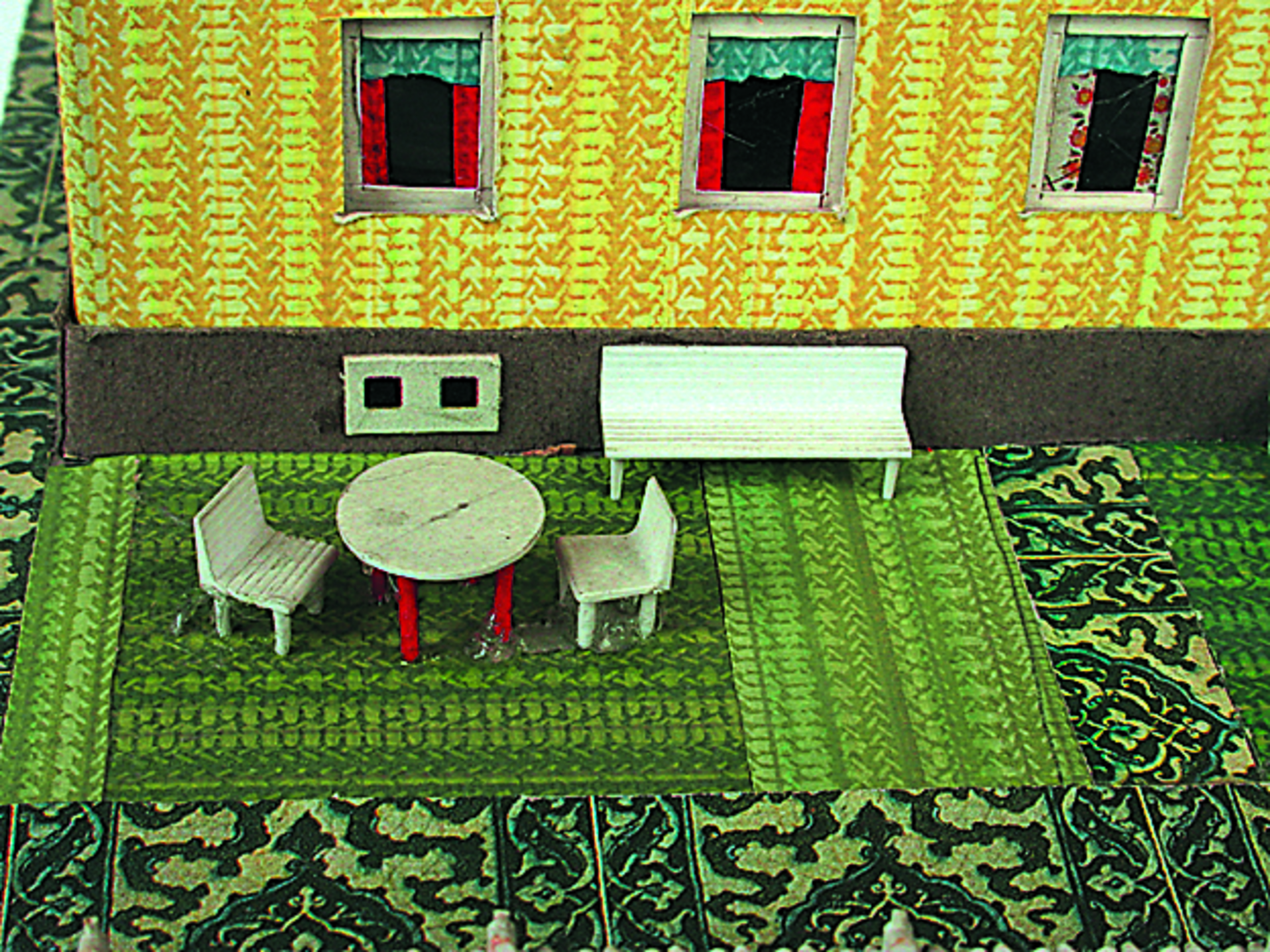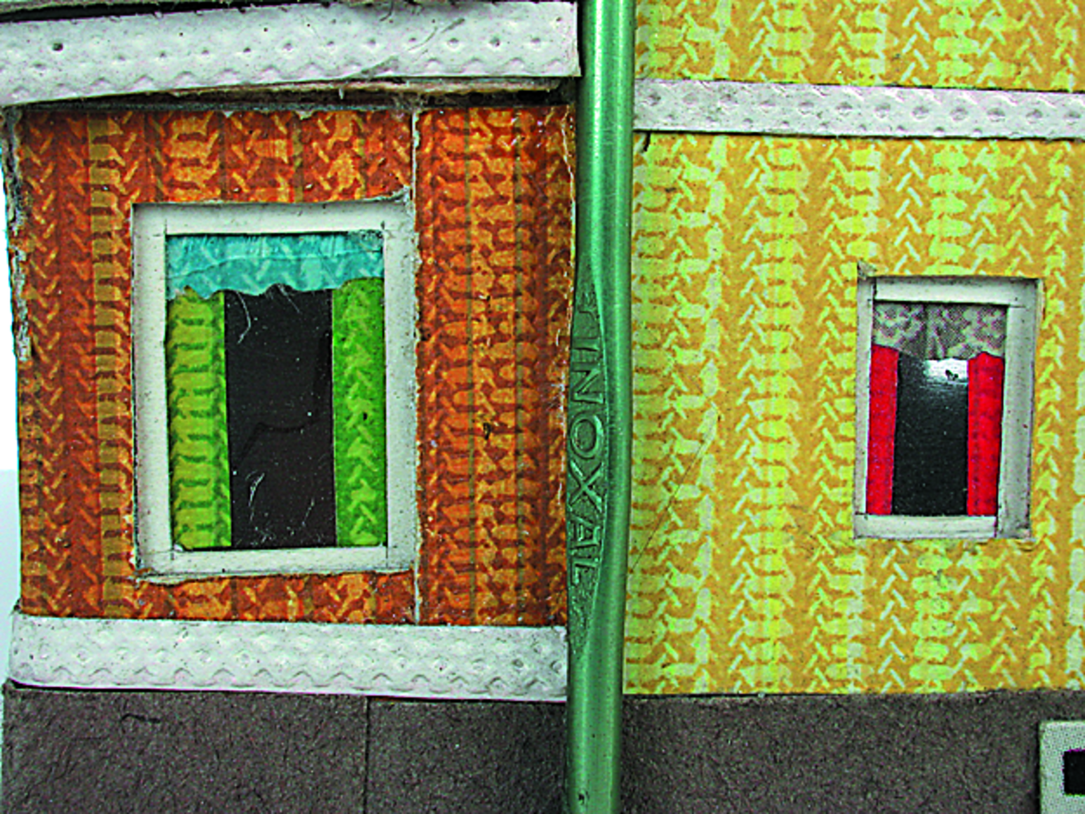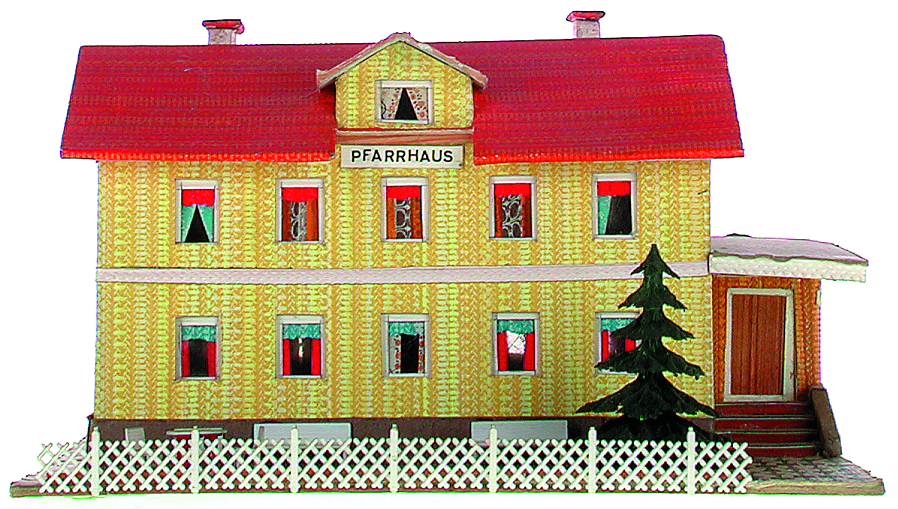 Anmerkung der Redaktion: Nicht von jedem Haus sind alle einzelnen verwendeten Materialien dokumentiert. Tatsächlich verbaute der Bastler auch Zigarettenschachteln, Spinnenpapier, Pappmaschee, Tapetenreste, Bunt- und Silberpapiere, Stoffe, Synthetikfasern, d-c-fix-Folien, Schriftproben, Zeitungsschnipsel und ausgewertete Illustrierte, Kartonagen, Holzabfälle aller Art, Uhu, Holzleim und Tapetenkleister.