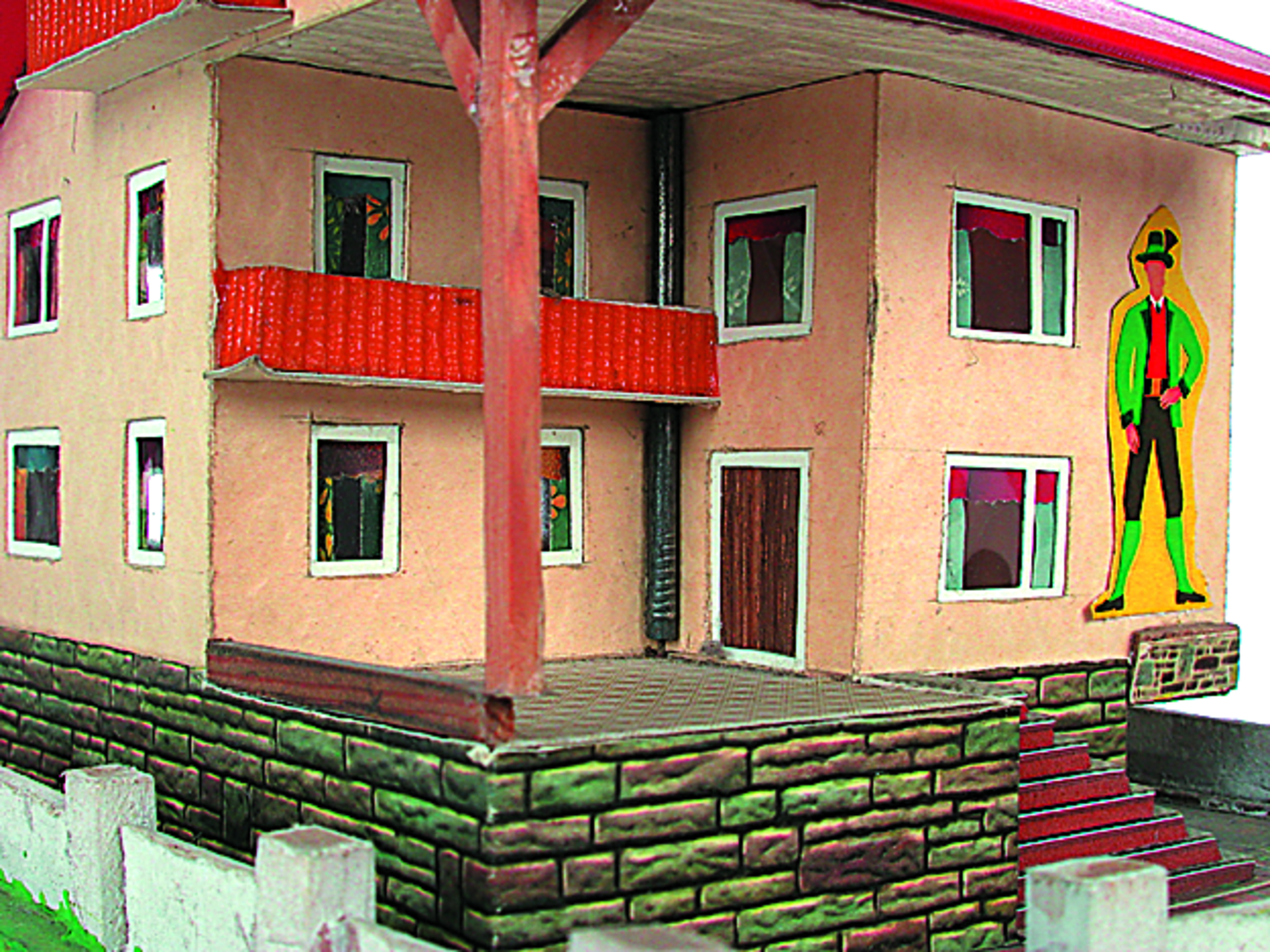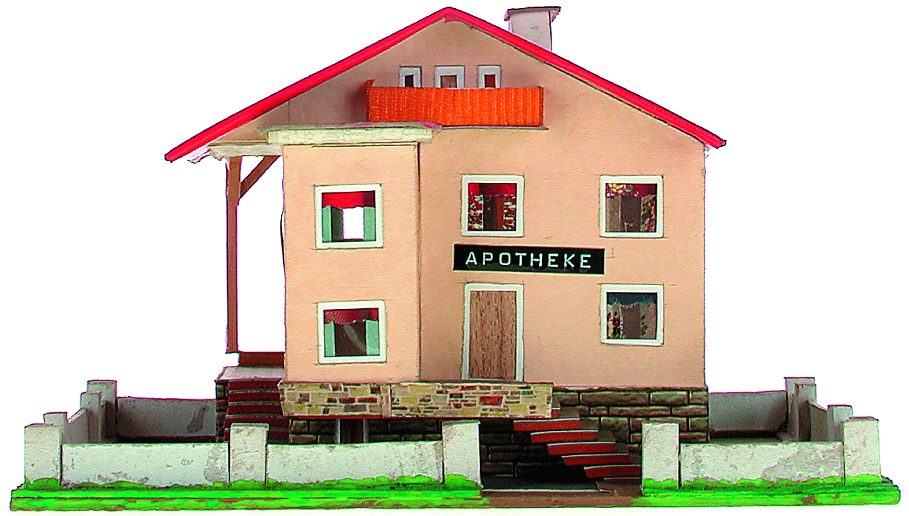 Anmerkung der Redaktion: Nicht von jedem Haus sind alle einzelnen verwendeten Materialien dokumentiert. Tatsächlich verbaute der Bastler auch Zigarettenschachteln, Spinnenpapier, Pappmaschee, Tapetenreste, Bunt- und Silberpapiere, Stoffe, Synthetikfasern, d-c-fix-Folien, Schriftproben, Zeitungsschnipsel und ausgewertete Illustrierte, Kartonagen, Holzabfälle aller Art, Uhu, Holzleim und Tapetenkleister.