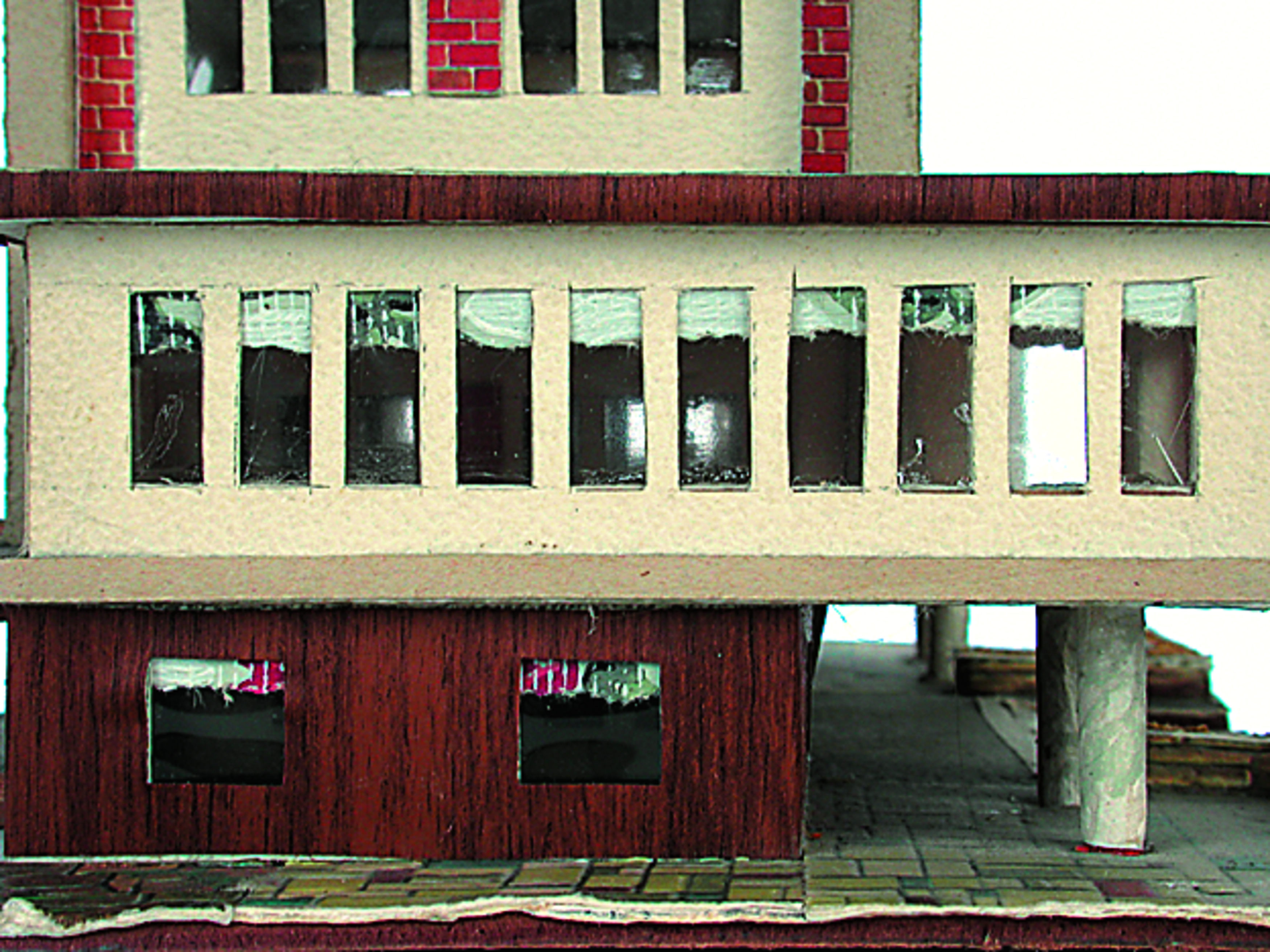 Anmerkung der Redaktion: Nicht von jedem Haus sind alle einzelnen verwendeten Materialien dokumentiert. Tatsächlich verbaute der Bastler auch Zigarettenschachteln, Spinnenpapier, Pappmaschee, Tapetenreste, Bunt- und Silberpapiere, Stoffe, Synthetikfasern, d-c-fix-Folien, Schriftproben, Zeitungsschnipsel und ausgewertete Illustrierte, Kartonagen, Holzabfälle aller Art, Uhu, Holzleim und Tapetenkleister.