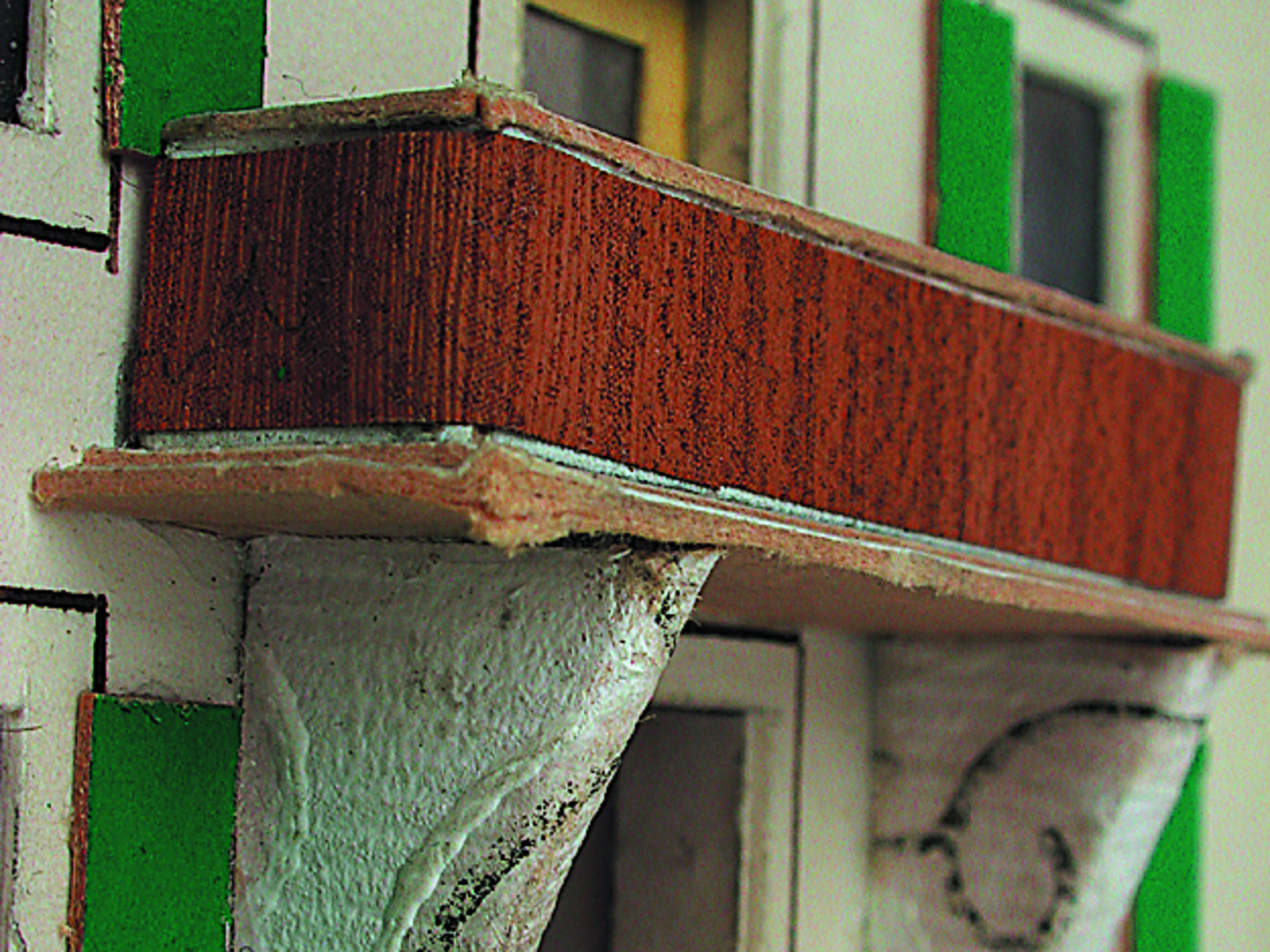 Anmerkung der Redaktion: Nicht von jedem Haus sind alle einzelnen verwendeten Materialien dokumentiert. Tatsächlich verbaute der Bastler auch Zigarettenschachteln, Spinnenpapier, Pappmaschee, Tapetenreste, Bunt- und Silberpapiere, Stoffe, Synthetikfasern, d-c-fix-Folien, Schriftproben, Zeitungsschnipsel und ausgewertete Illustrierte, Kartonagen, Holzabfälle aller Art, Uhu, Holzleim und Tapetenkleister.