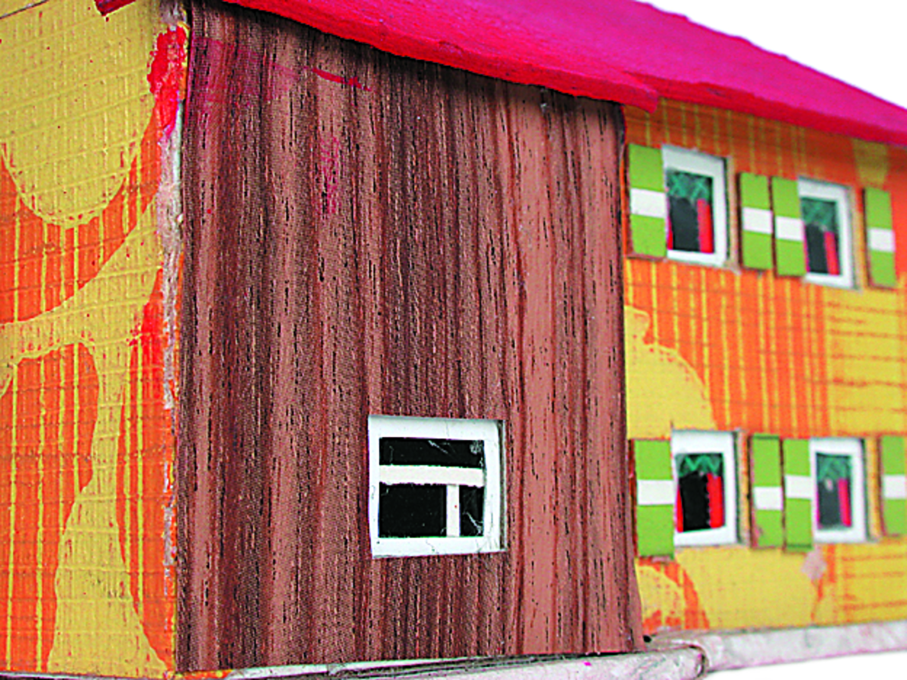 Anmerkung der Redaktion: Nicht von jedem Haus sind alle einzelnen verwendeten Materialien dokumentiert. Tatsächlich verbaute der Bastler auch Zigarettenschachteln, Spinnenpapier, Pappmaschee, Tapetenreste, Bunt- und Silberpapiere, Stoffe, Synthetikfasern, d-c-fix-Folien, Schriftproben, Zeitungsschnipsel und ausgewertete Illustrierte, Kartonagen, Holzabfälle aller Art, Uhu, Holzleim und Tapetenkleister.
