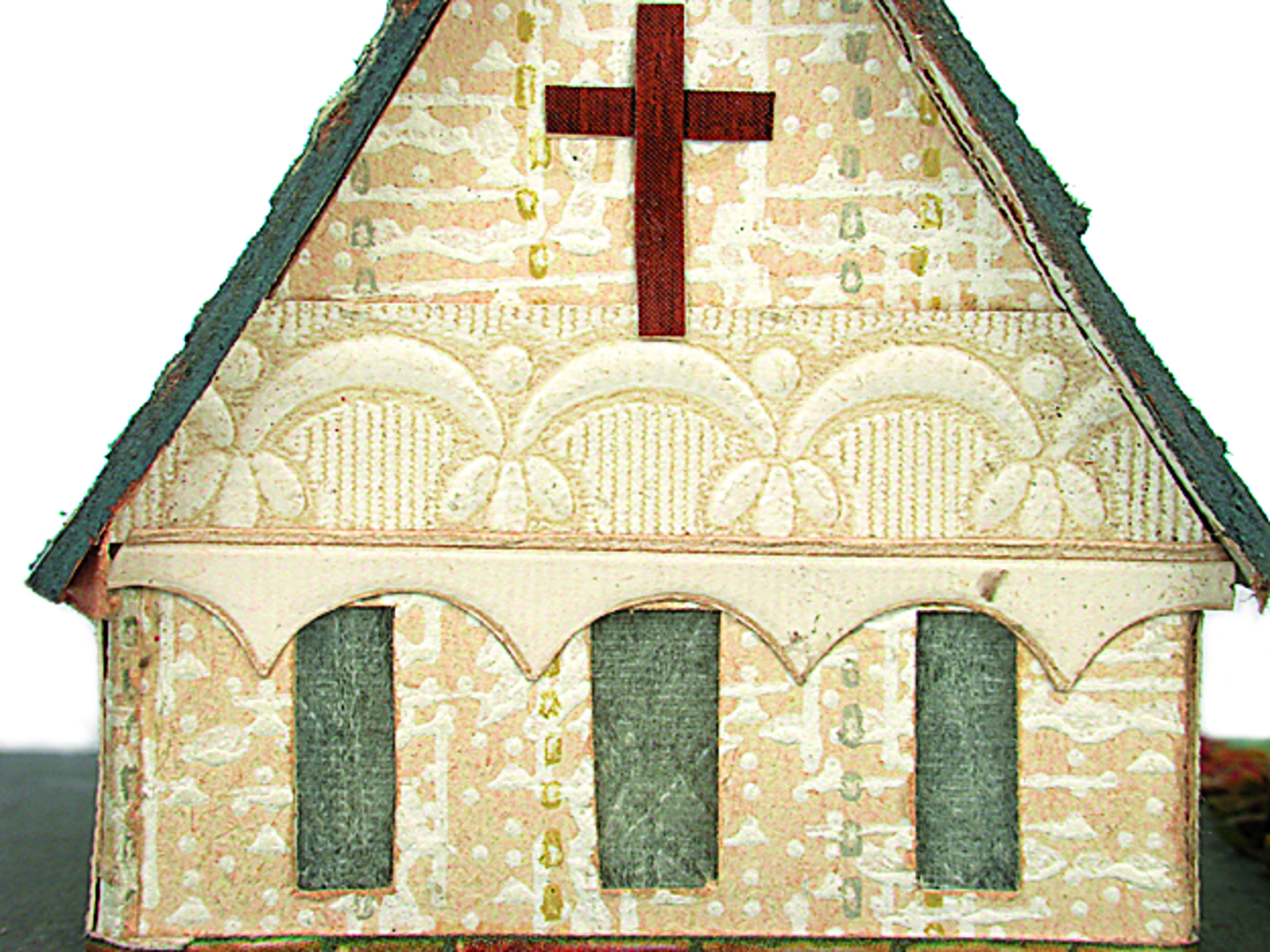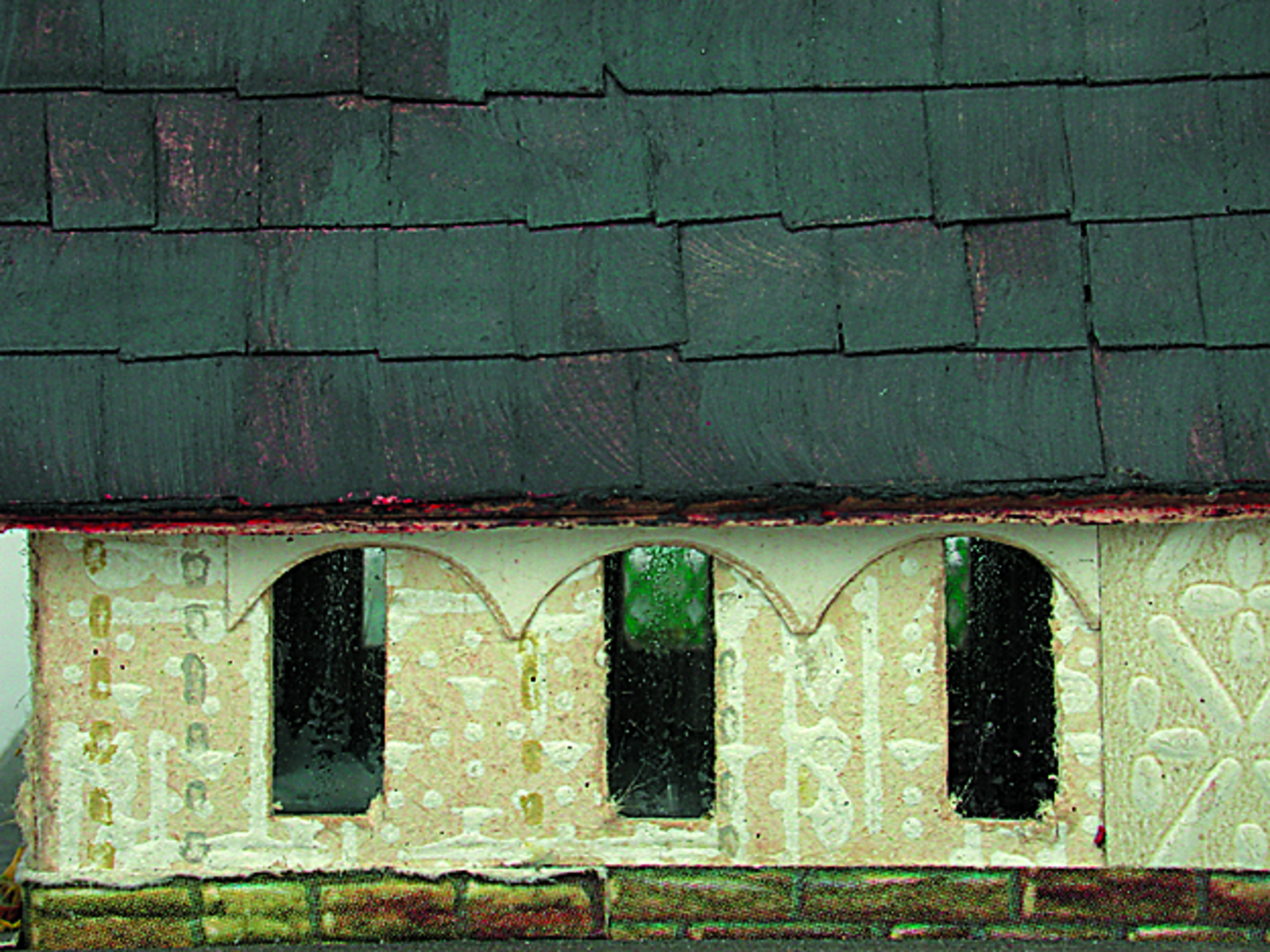 Anmerkung der Redaktion: Nicht von jedem Haus sind alle einzelnen verwendeten Materialien dokumentiert. Tatsächlich verbaute der Bastler auch Zigarettenschachteln, Spinnenpapier, Pappmaschee, Tapetenreste, Bunt- und Silberpapiere, Stoffe, Synthetikfasern, d-c-fix-Folien, Schriftproben, Zeitungsschnipsel und ausgewertete Illustrierte, Kartonagen, Holzabfälle aller Art, Uhu, Holzleim und Tapetenkleister.