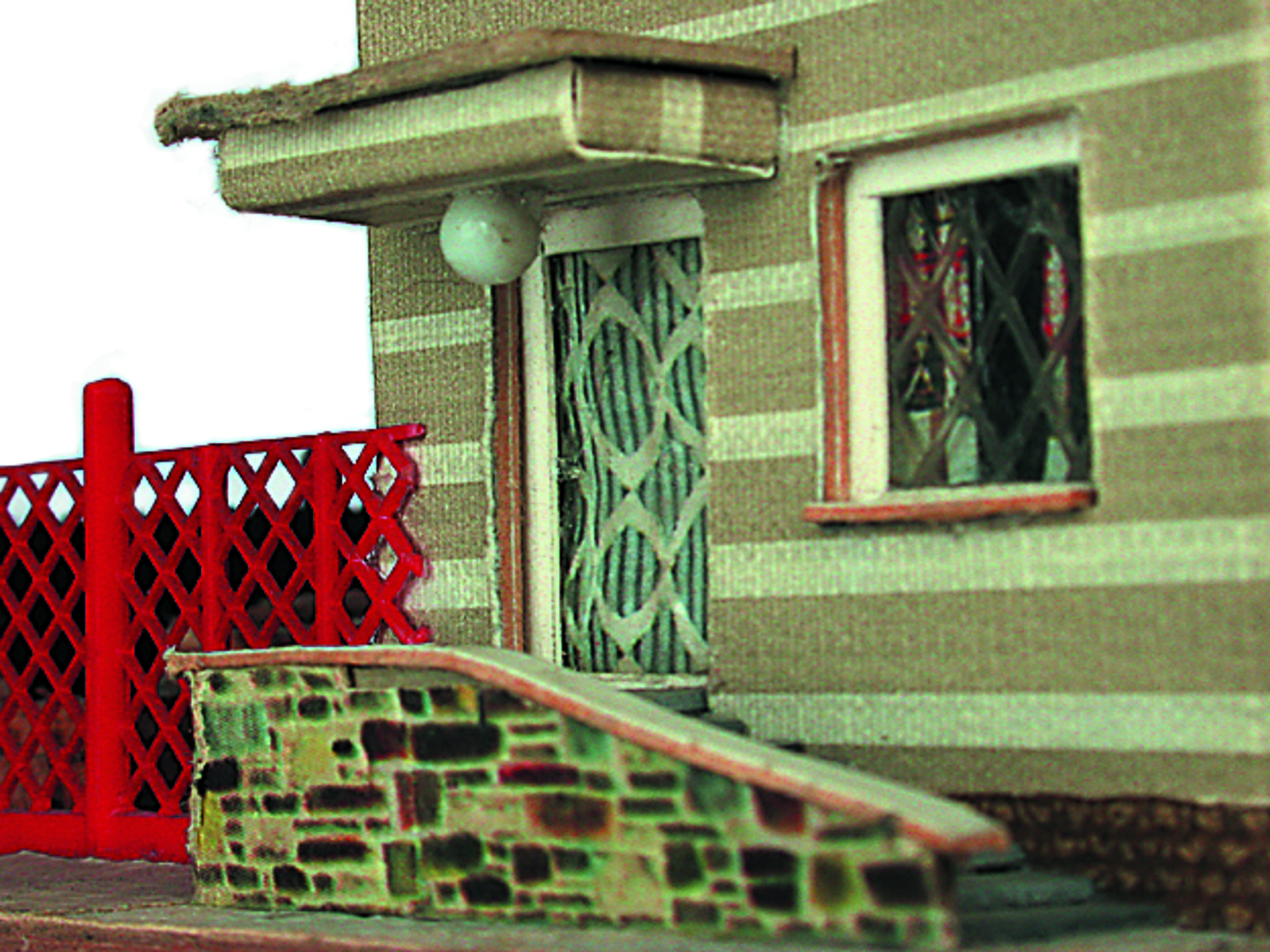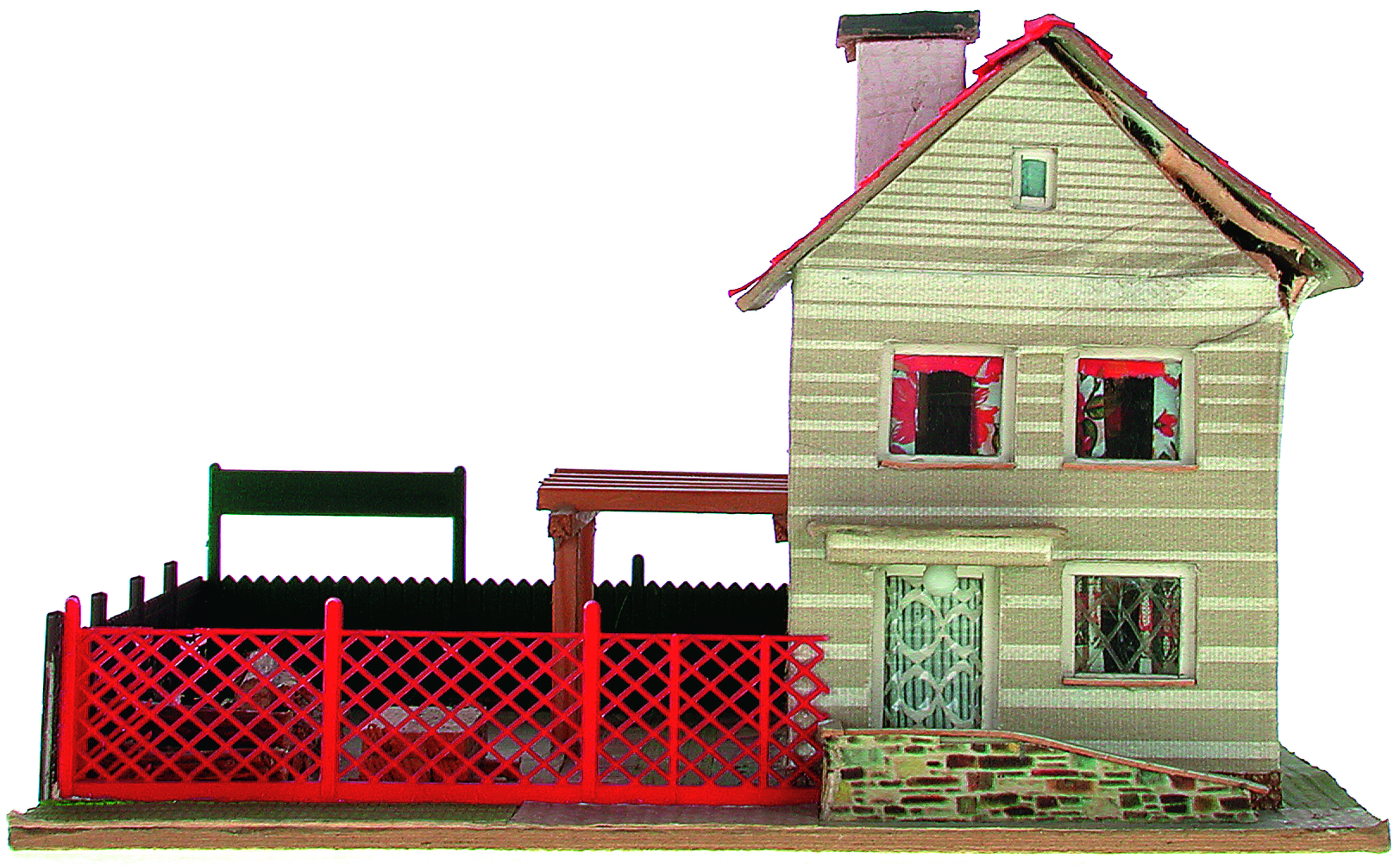Anmerkung der Redaktion: Nicht von jedem Haus sind alle einzelnen verwendeten Materialien dokumentiert. Tatsächlich verbaute der Bastler auch Zigarettenschachteln, Spinnenpapier, Pappmaschee, Tapetenreste, Bunt- und Silberpapiere, Stoffe, Synthetikfasern, d-c-fix-Folien, Schriftproben, Zeitungsschnipsel und ausgewertete Illustrierte, Kartonagen, Holzabfälle aller Art, Uhu, Holzleim und Tapetenkleister.