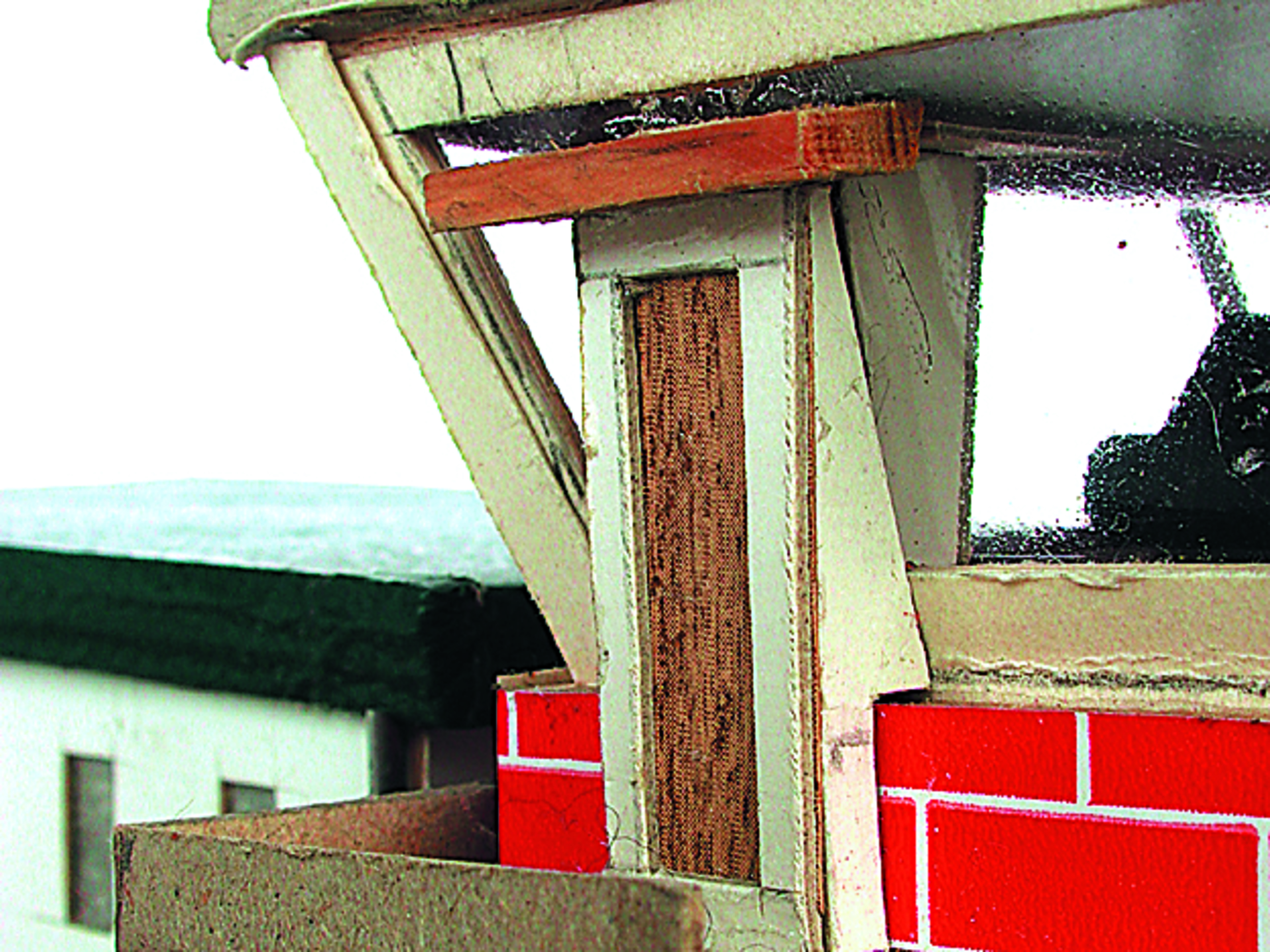Anmerkung der Redaktion: Nicht von jedem Haus sind alle einzelnen verwendeten Materialien dokumentiert. Tatsächlich verbaute der Bastler auch Zigarettenschachteln, Spinnenpapier, Pappmaschee, Tapetenreste, Bunt- und Silberpapiere, Stoffe, Synthetikfasern, d-c-fix-Folien, Schriftproben, Zeitungsschnipsel und ausgewertete Illustrierte, Kartonagen, Holzabfälle aller Art, Uhu, Holzleim und Tapetenkleister.