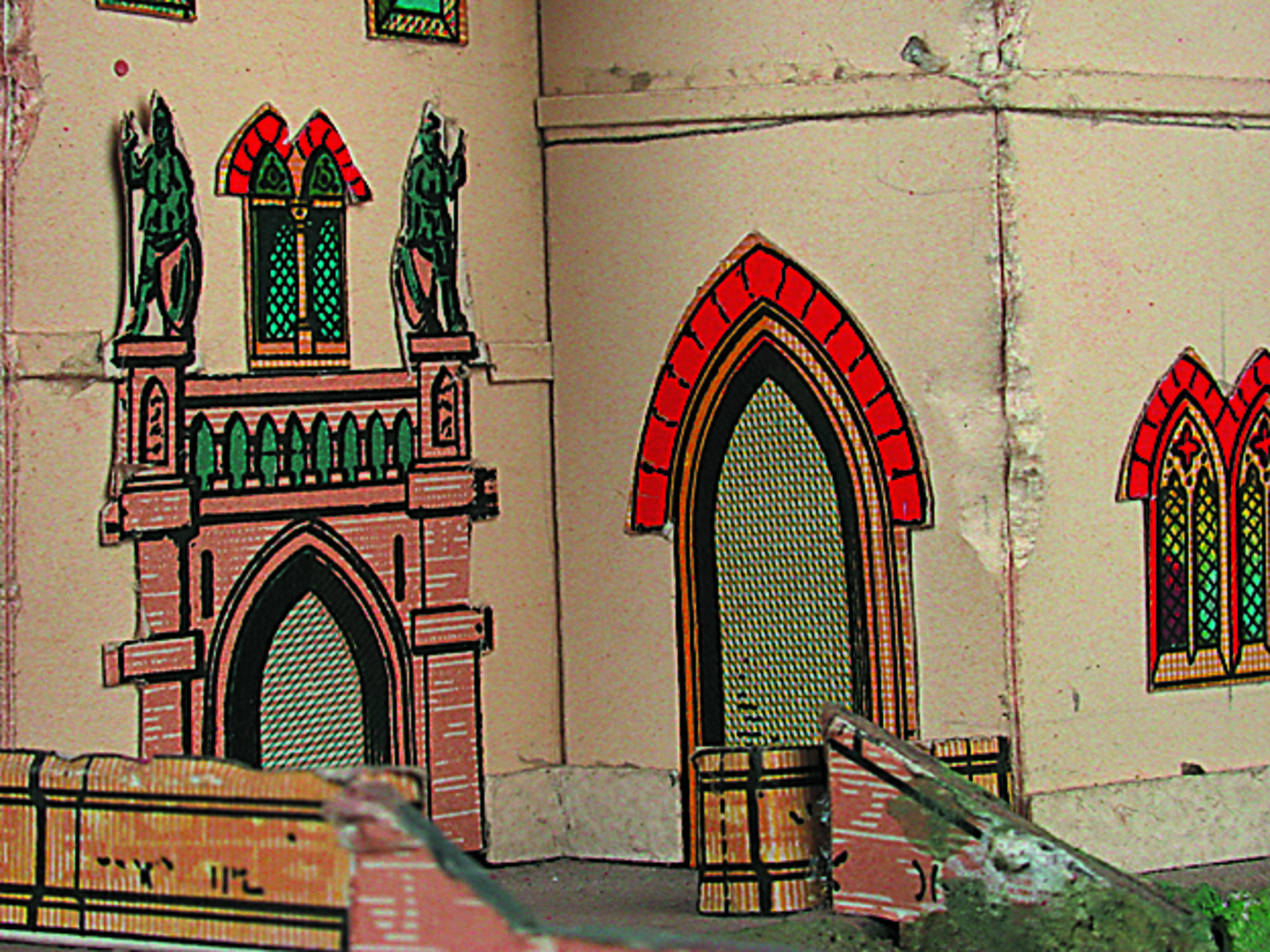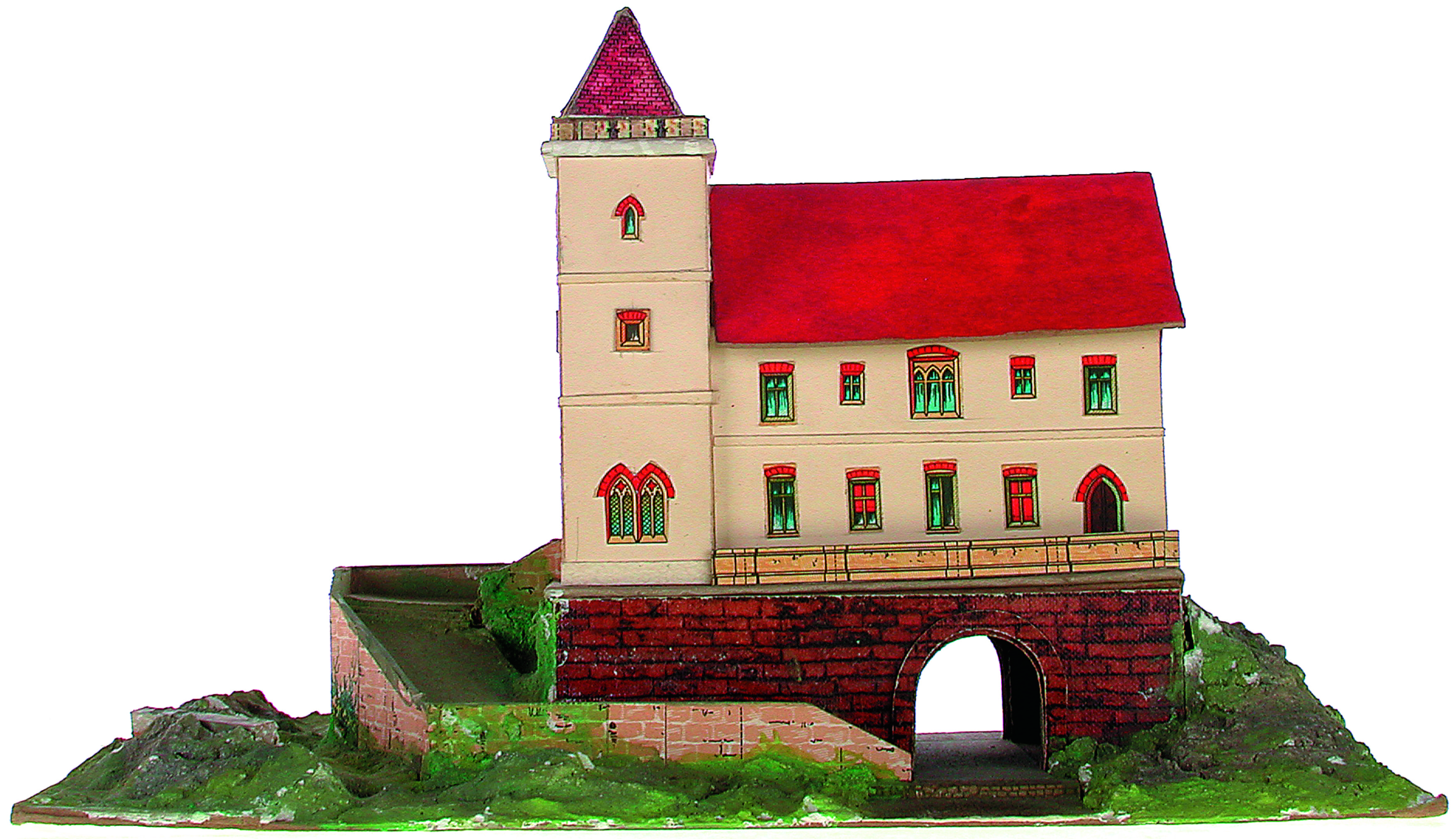 Anmerkung der Redaktion: Nicht von jedem Haus sind alle einzelnen verwendeten Materialien dokumentiert. Tatsächlich verbaute der Bastler auch Zigarettenschachteln, Spinnenpapier, Pappmaschee, Tapetenreste, Bunt- und Silberpapiere, Stoffe, Synthetikfasern, d-c-fix-Folien, Schriftproben, Zeitungsschnipsel und ausgewertete Illustrierte, Kartonagen, Holzabfälle aller Art, Uhu, Holzleim und Tapetenkleister.