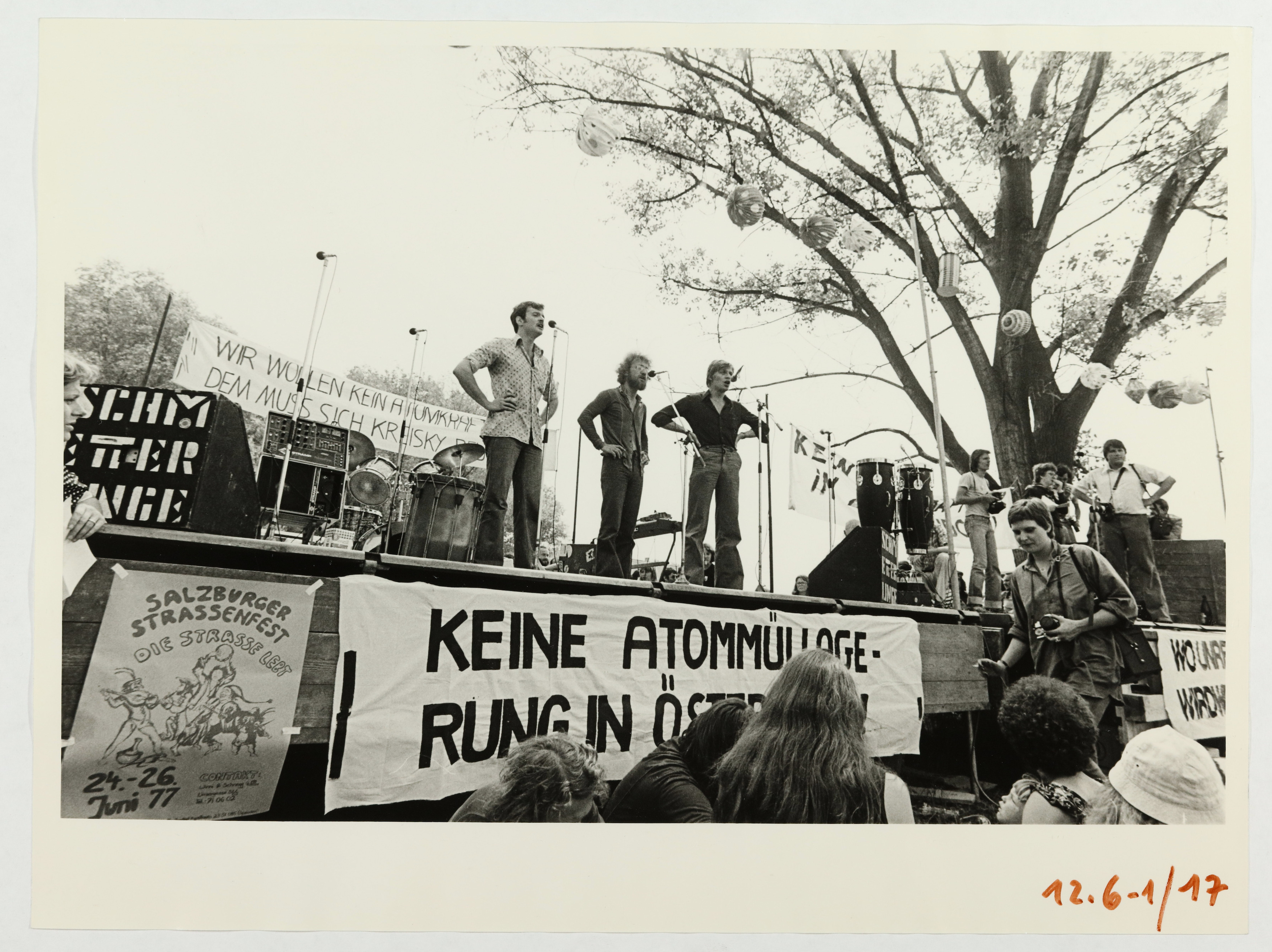 Demonstration gegen die Inbetriebnahme des Atomkraftwerks Zwentendorf, 12.6.1977. Treffpunkt in Tulln, AktivistInnen und Bühne