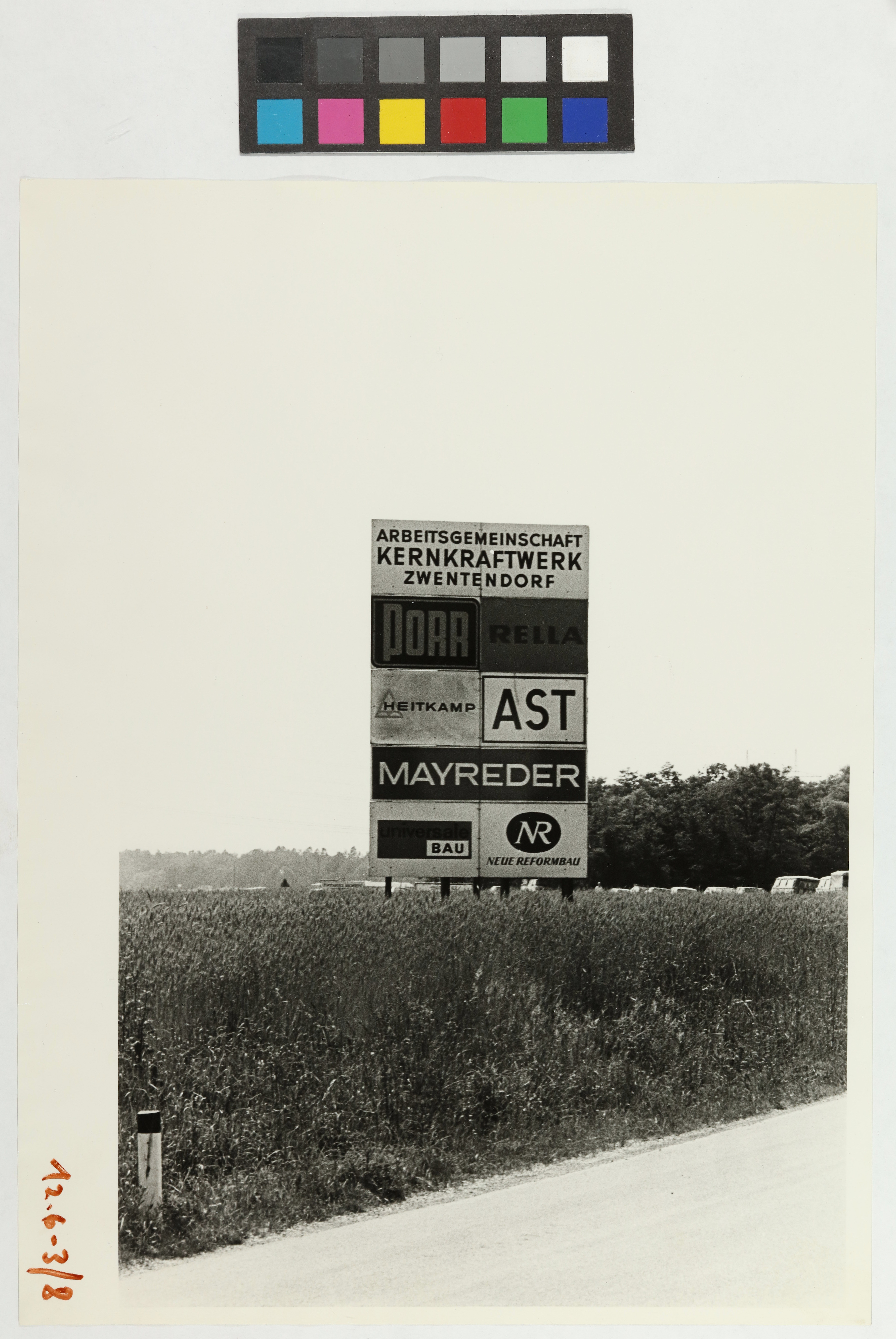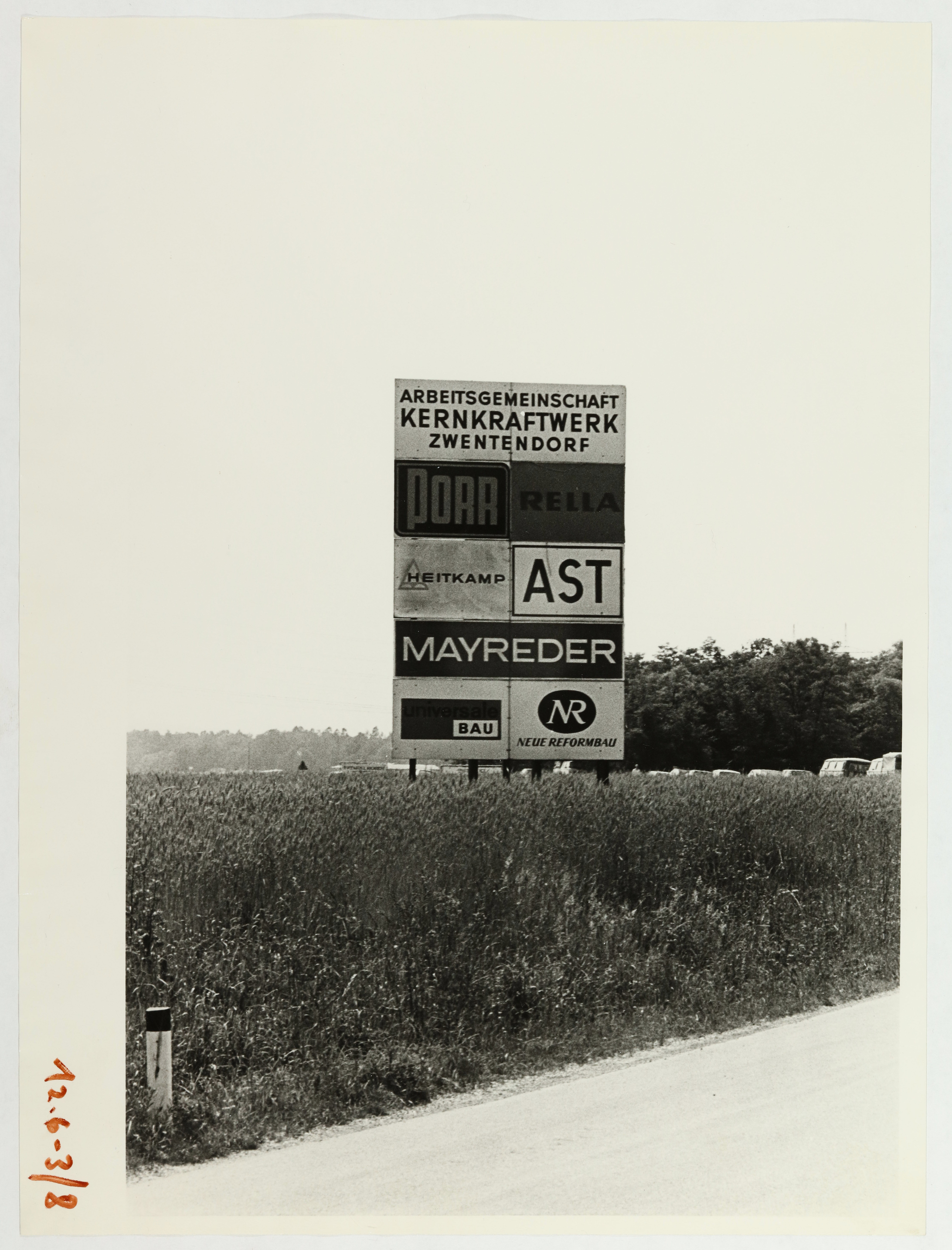 Demonstration gegen die Inbetriebnahme des Atomkraftwerks Zwentendorf, 12.6.1977. Baustellentafel der "Arbeitsgemeinschaft Kernkraftwerk Zwentendorf"