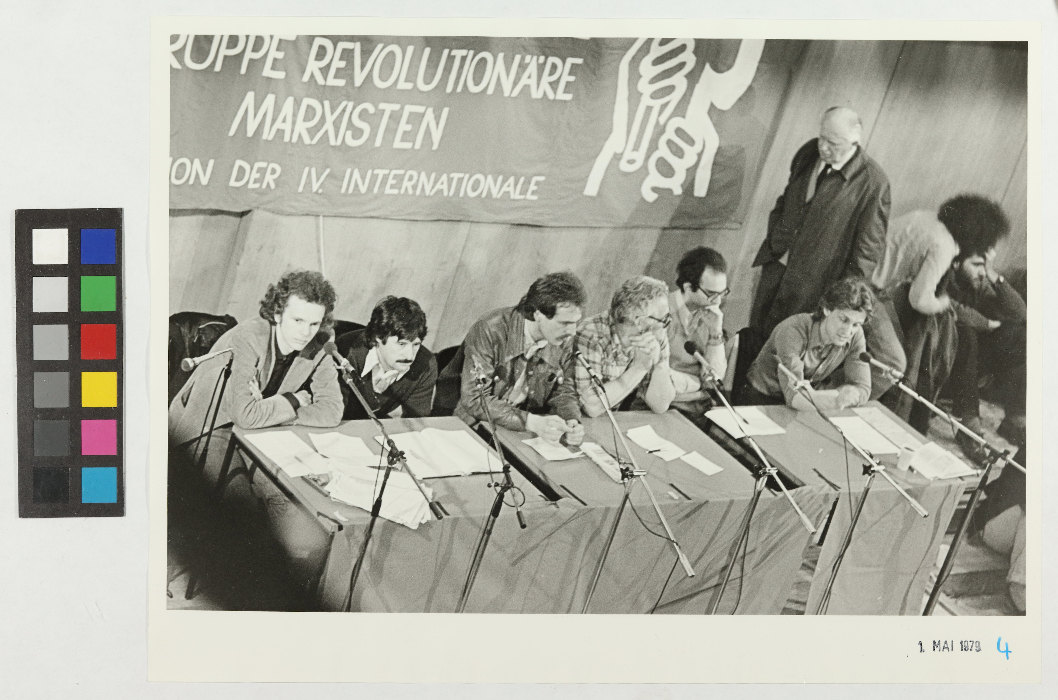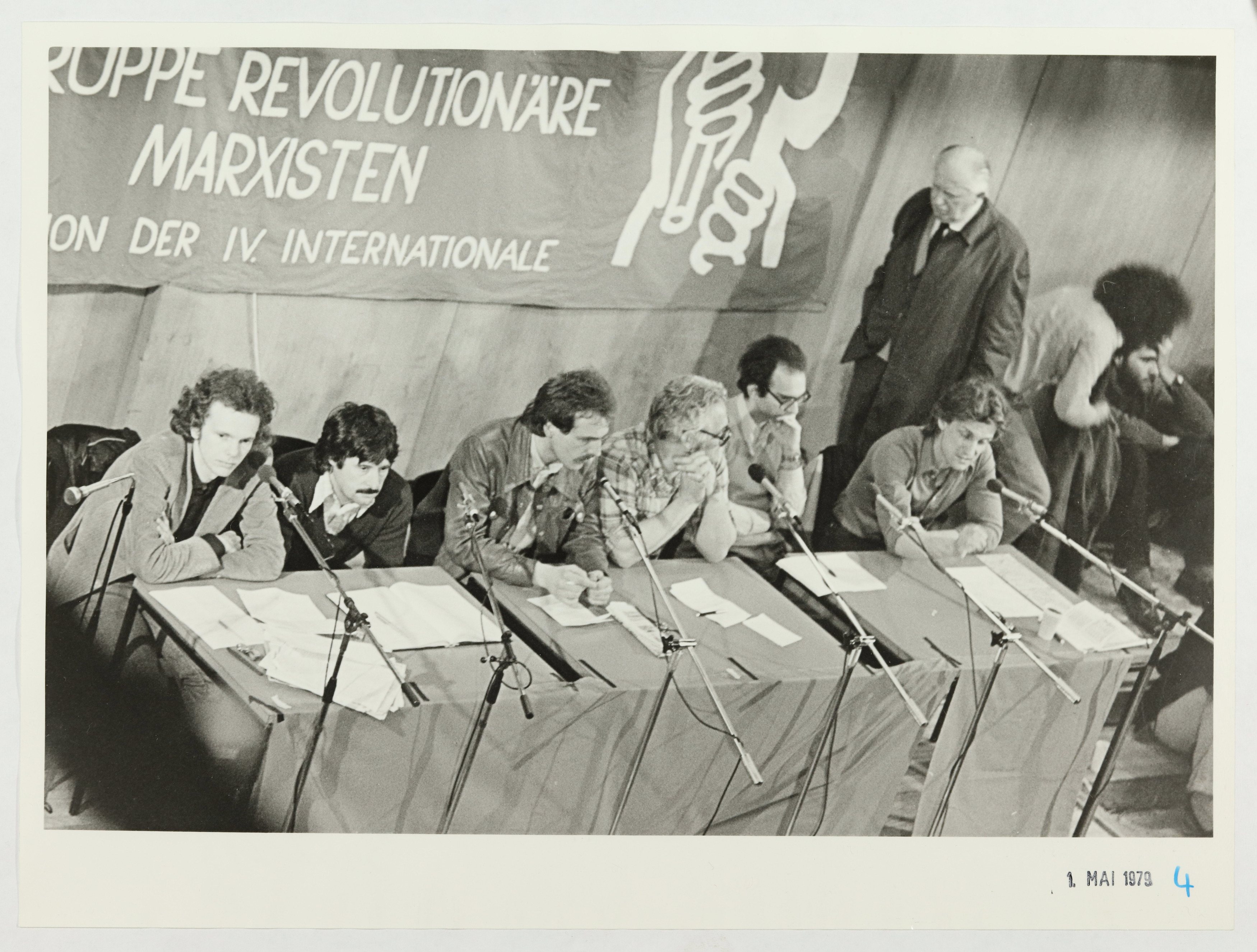 Wahlveranstaltung der "Gruppe Revolutionäre Marxisten", 1.5.1979. Von rechts: Josef Cap, unbekannt, "Schani" Margulies, Siegfried Mattl, Werner Vogt, Raimund Löw